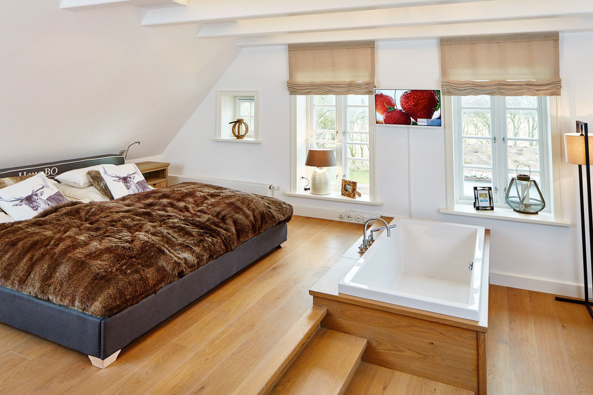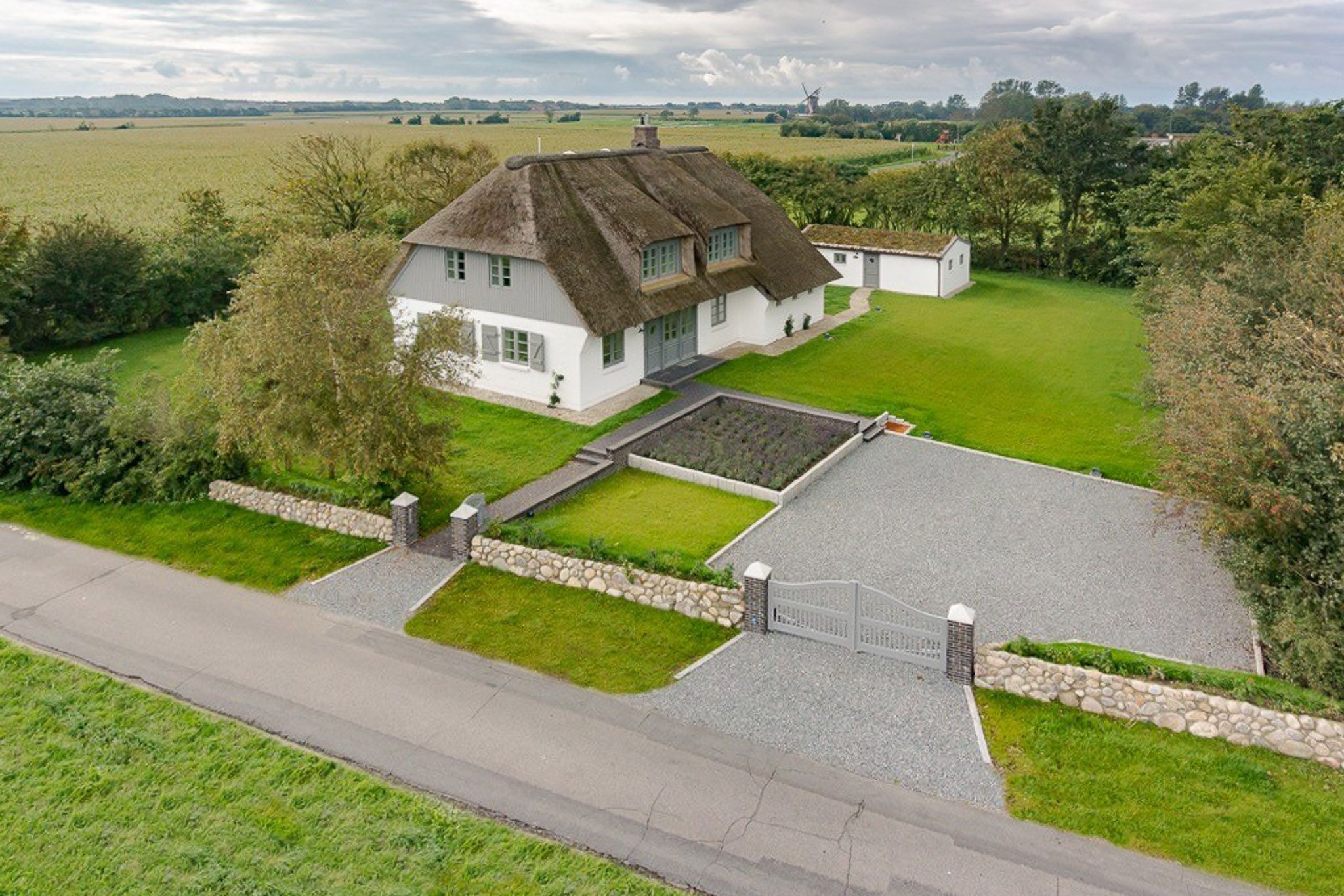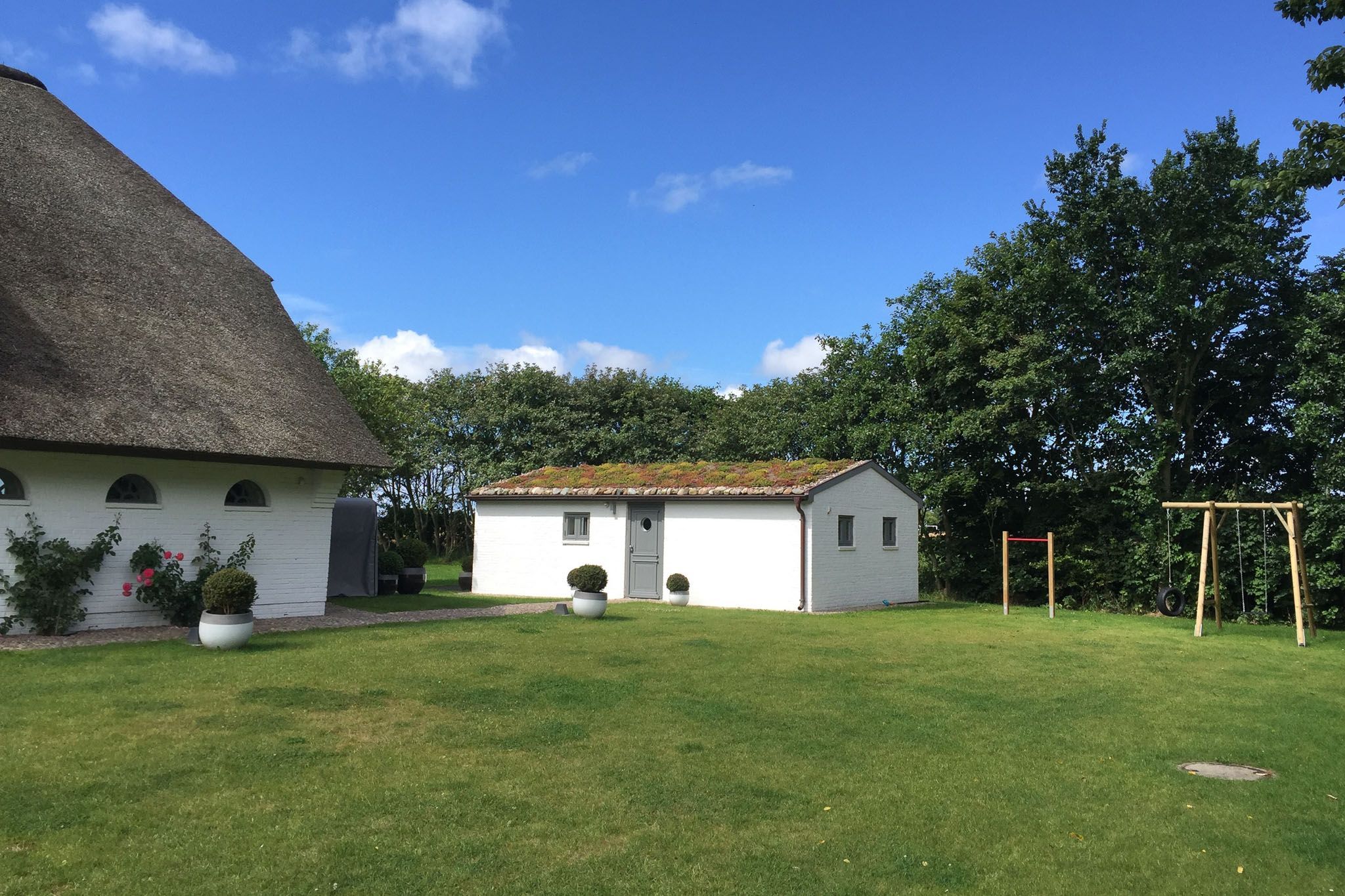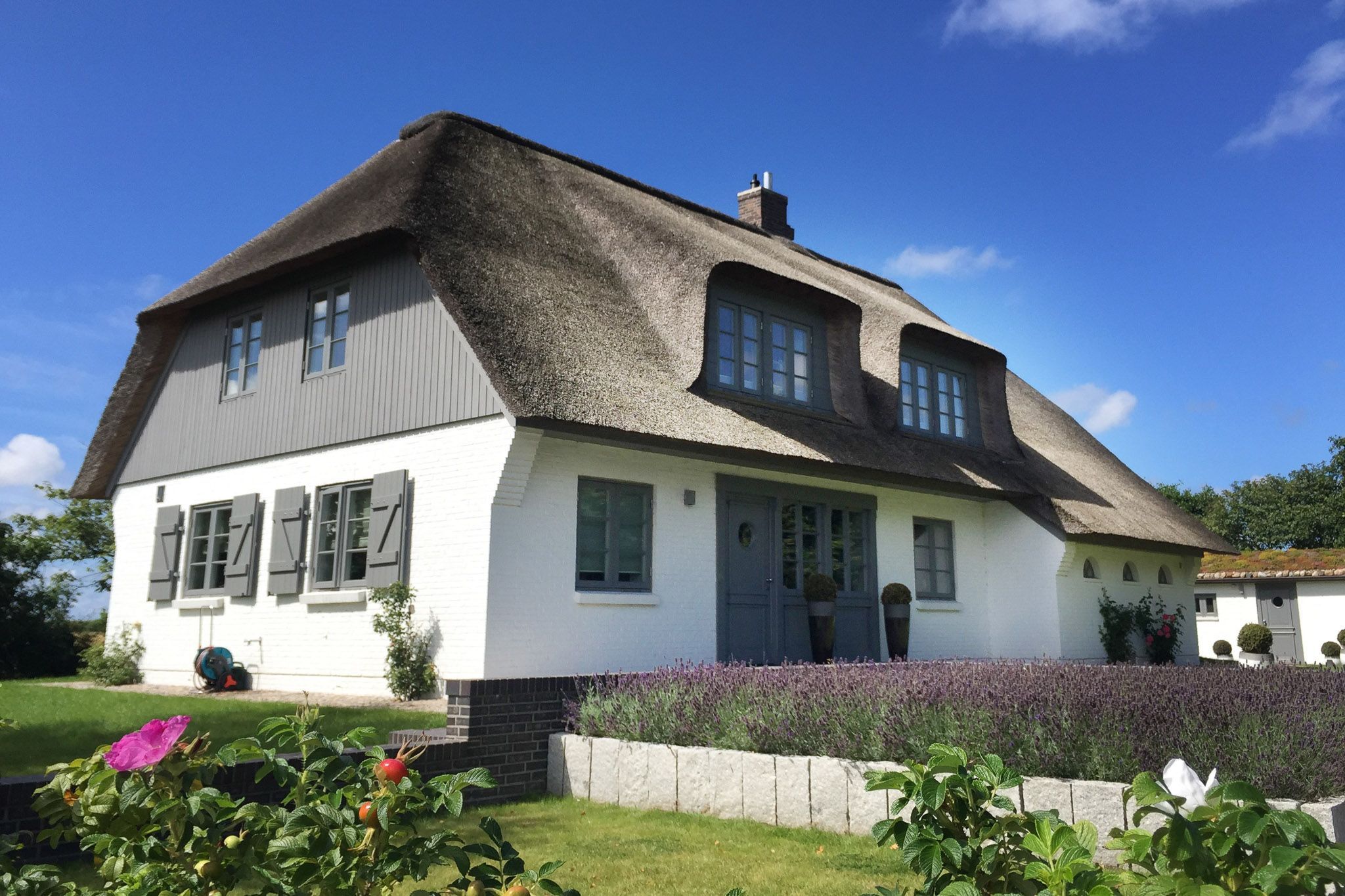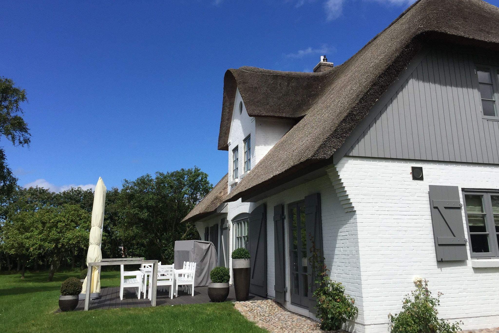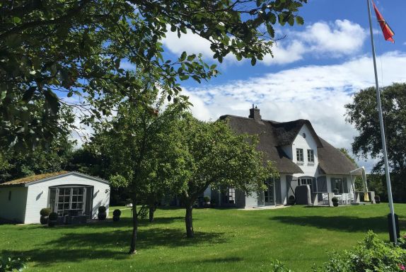 Mit viel Liebe zum Detail und in höchster Qualität ausgestattet, finden Sie in diesem Reetdachhaus Ruhe, Entspannung und Weitblick mitten in der Natur, umgeben von ländlichem Ambiente. Urlaub wie im eigenen Zuhause genießen, nach dieser Philosophie haben die Besitzer dieses Haus konzipiert und besonders anspruchsvoll ausgestattet. Ein charmantes Grundstück mit schönen Obstbäumen und drei großzügigen Terrassenflächen laden zum Verweilen im Garten ein. In der kälteren Jahreszeit bieten die Sauna im separaten Sauna- und Gästehaus sowie ein Kamin im Haupthaus eine perfekte Alternative für erholsame und gemütliche Stunden. Eine große helle Bulthaup-Küche mit allen technischen Geräten, das Esszimmer und der Wohnbereich gehen ineinander über und öffnen sich zu den großen Terrassenflächen nach Süden und Westen. Die perfekten Voraussetzungen für einen fantastischen Urlaub im kleinen wie auch im großen Kreis, denn dieses Haus bietet sogar Platz für zwei Familien. Der idyllische Ort Oldsum verfügt über einen eigenen kleinen Supermarkt und Bäcker und ist über die Grenzen Föhrs für seine Schönheit bekannt. Die Fähre sowie die weitläufigen Strände in Utersum, Nieblum und den Südstrand in Wyk erreichen Sie in nur 10 Minuten mit dem Auto.