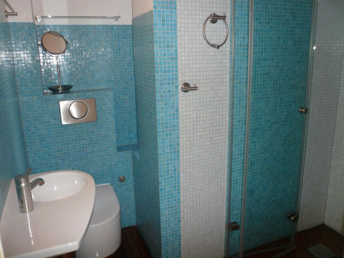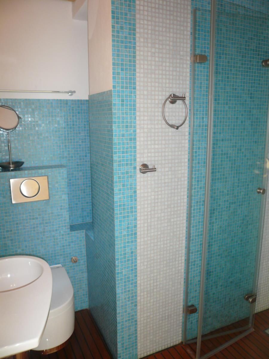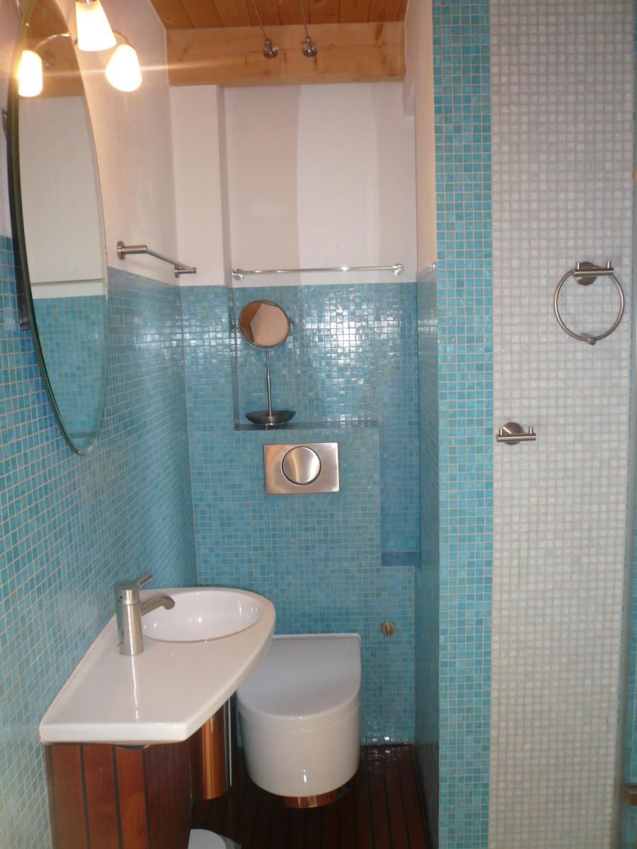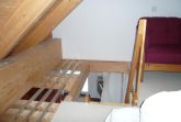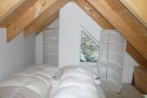 Das Wohnzimmer ist mit Mahagoni Schiffsparkett ausgelegt und erstreckt sich über die gesamte Südseite des Hauses. An den Schrägen und der Decke sind helle Holzbalken sichtbar, die Zwischenräume sind mit hellem Holz verkleidet. Ein Teil der Decke ist offen und über eine steilere Treppe mit dem Wohnzimmer verbunden. Im Spitzboden gibt es noch Schlafgelegenheit für 2 Personen. Auf der Ebene des Wohnzimmers gibt es eine separates Schlafzimmer mit Doppelbett und ein Duschbad. Die kleine Küche befindet sich im Wohnzimmer und hat Spülmaschine. Als Besonderheit ist ein rollbarer, von oben zu befüllender Kühlschrank.