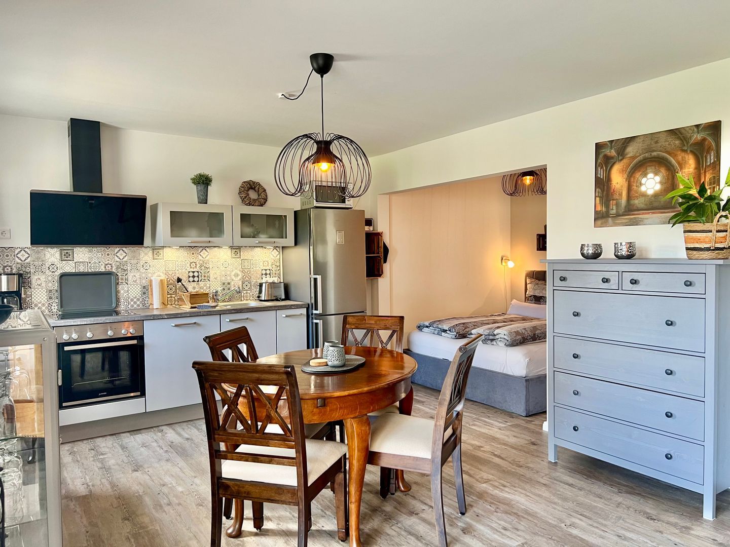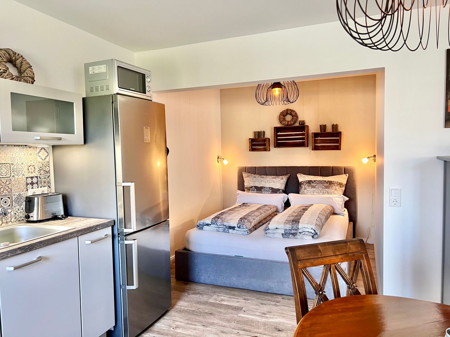 Das lichtdurchflutete Studio verfügt über ein gemütliches Doppelbett. Die voll ausgestattete Einbauküche bietet alles, was Sie für eine bequeme Selbstversorgung benötigen. Das moderne Duschbad rundet das komfortable Angebot ab. Ein besonderes Highlight ist das zweiflügelige Dachfenster, das sich zu einem Dachaustritt öffnen lässt und Ihnen einen einzigartigen Blick auf die Förde und den Strand bietet.