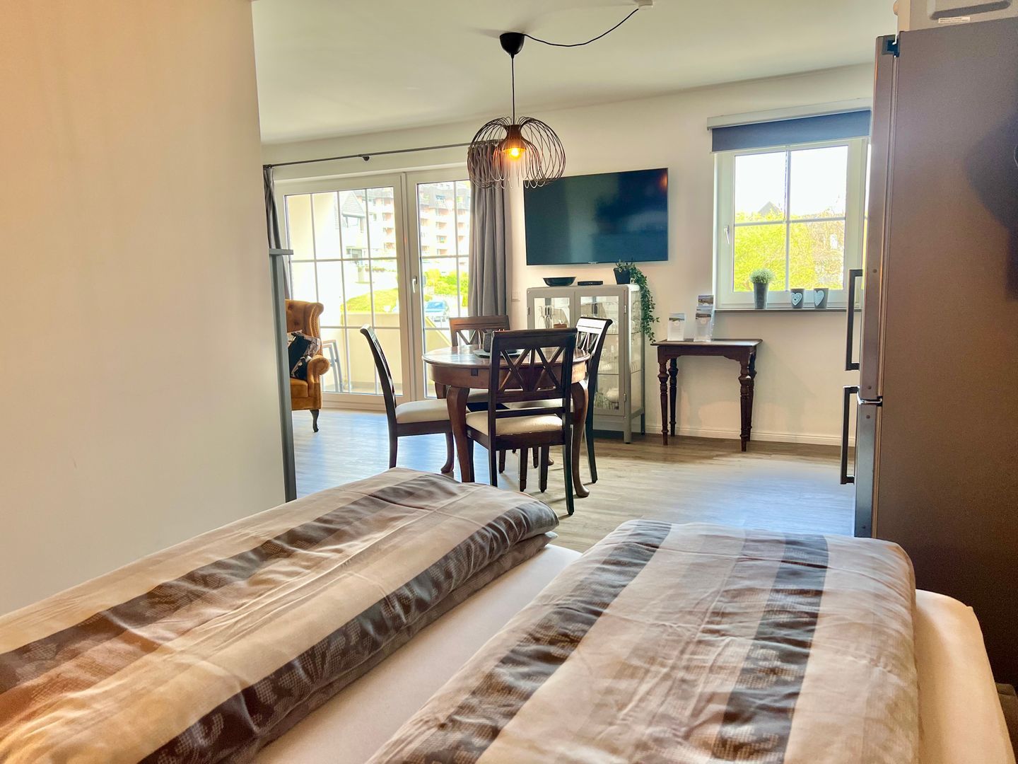 Der angrenzende Schlafraum ist mit zwei Einzelbetten ausgestattet, die bei Bedarf zusammengeschoben werden können. Ein hochwertiges Ausziehsofa im Wohnraum steht zudem als bequemes Gästebett zur Verfügung. Das moderne Duschbad rundet das Angebot ab.