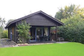 Blockhaus mit grosser Rasenfläche und eigenem Pkw-Stellplatz, ideal für Urlauber mit bis zu 4 Personen.