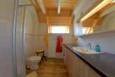 Gästetoilette mit Fenster, WC, Waschbecken, Warmwasser, Ablagen