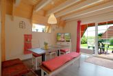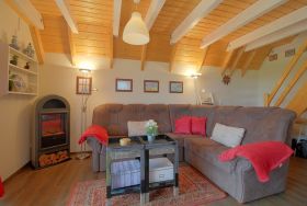 E:G: Wohnzimmer mit Essecke, Eckcouch, DVD-Player, Flachbild-TV, Stereoanlage/CD/Bluetooth/USB, Spielen, Büchern, Gästeinformationen, Schreibtisch, Glasfaseranschluß, Telefon, WLAN und LAN, Elektrokamin mit Flammenspiel, Rolladen an der Terrassentür