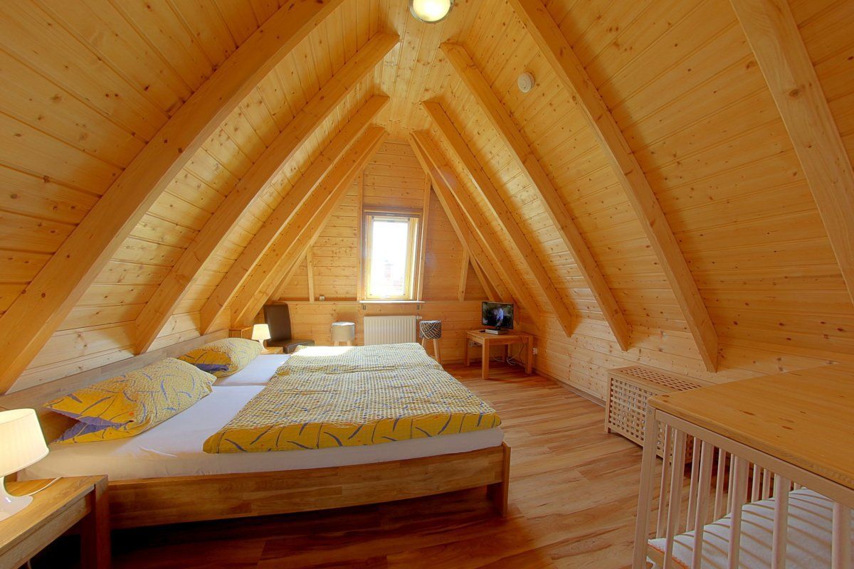 Elternschlafzimmer mit Doppelbett (180x200), Nachttischen, Regalen, Sitzmöbeln, Babybett und Ablagen, DVD-Player, Flachbildfernseher, Radio, Büchern, Blick auf die Kaje von Bremerhaven