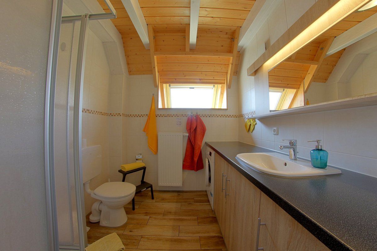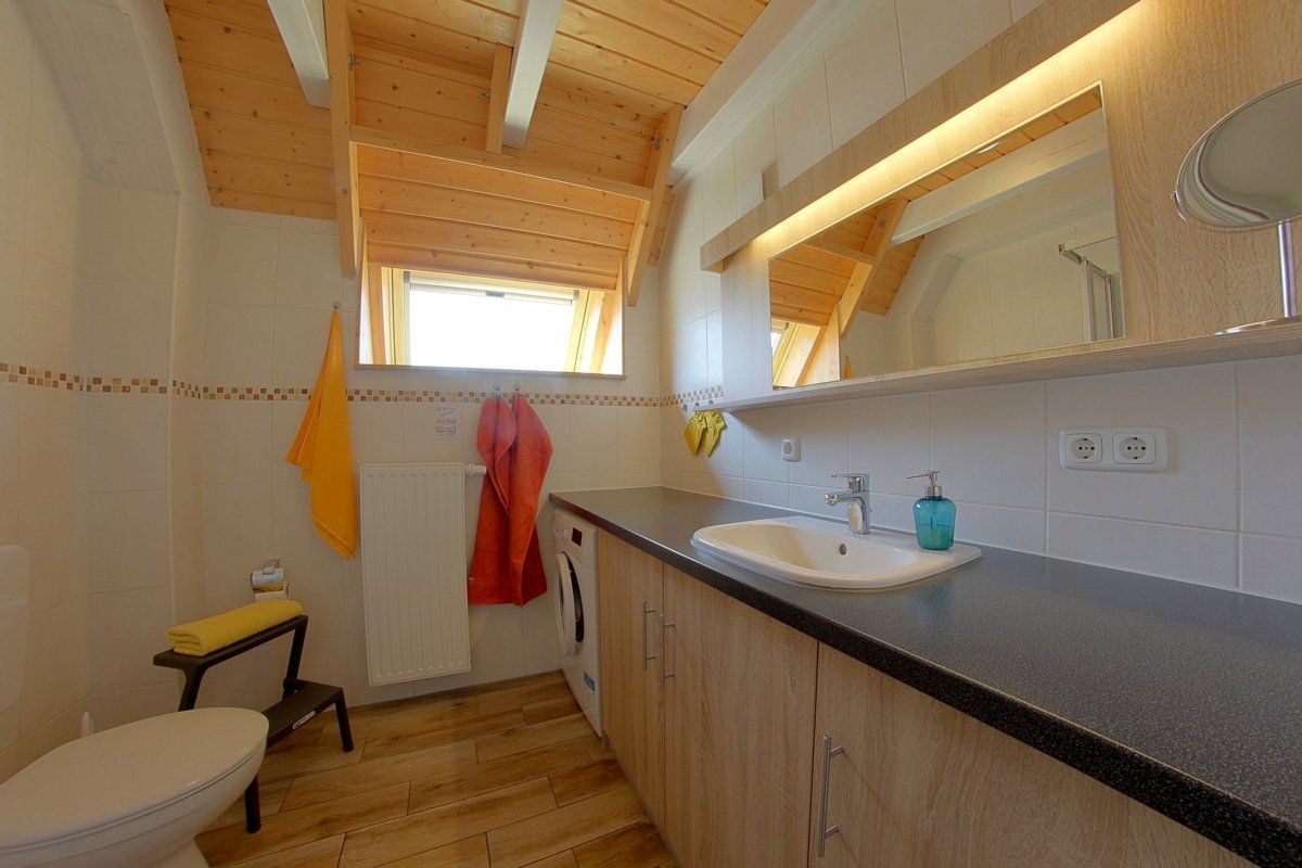 Duschbad mit Fenster, Waschmaschine, Waschbecken, Toilette, zusätzlichem Lüftungsautomaten