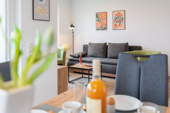 Der offen gestaltete Wohnbereich ist mit einem ausziehbaren Sofa sowie zwei Sesseln und Smart-TV ausgestattet. Sie haben vom Wohnzimmer aus Zugang zur Südost-Terrasse. Genießen Sie Ihre Speisen auf der möblierten Terrasse mit traumhaften Ausblicken in die Gartenanlage.