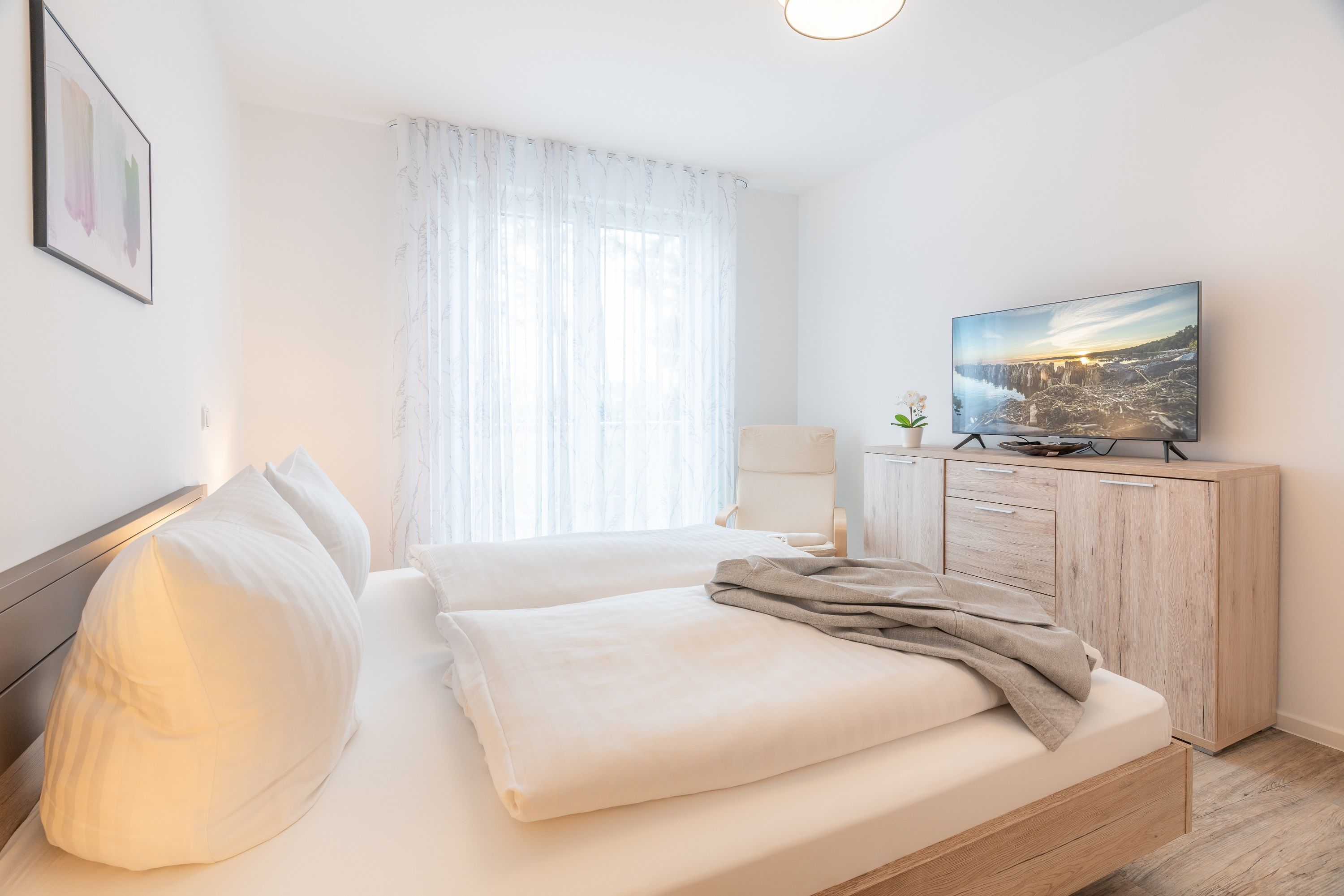 Erholsamer Schlaf in den beiden Schlafzimmern mit je einem Doppelbett (180 x 200 cm) ist garantiert. Ein Schlafzimmer ist mit einem weiteren TV-Gerät ausgestattet. Das Schlafsofa im Wohnzimmer kann im Handumdrehen zu einem Bett umfunktioniert werden (Liegefläche: 160 x 200 cm).