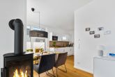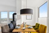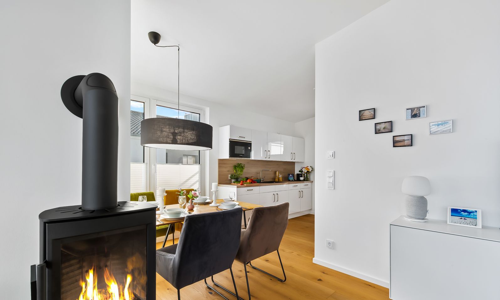 In dem großen und offenen Wohn-Essraum mit einer perfekt ausgestatteten Küche, einer stylischen Essecke und der gemütlichen Sofaecke mit Fernseher vergisst man den Alltag sofort und fühlt sich einfach nur frei und losgelöst. Auch ein Kaminofen ist vorhanden und zaubert bei nicht so freundlichen Wetterlagen HYGGE in die Ferienidylle. Ob Sie entspannen auf dem Sofa, mit Freude in der Küche werkeln oder am Esstisch das leckere Essen genießen - der weite Blick über die See begleitet Sie immer.