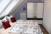 Im Erdgeschoss der Maisonette finden Sie den Wohnbereich mit offener Küche und Zugang zur 15 m² großen Terrasse mit Grillmöglichkeit. Die Küchenzeile, gehalten in klassisch-elegantem Weiß mit holzfarbenen und grauen Akzenten, verfügt über eine gut sortierte Ausstattung. Vorhanden sind Kühlschrank mit Gefrierfach, Backofen, Mikrowelle, 2-Platten-Induktionsherd und Spülmaschine, sowie nützliche Kleingeräte wie Toaster, Kaffeemaschine und Wasserkocher. Für genügend Licht beim Gemüseschnippeln sorgt die Unterbaubeleuchtung an den Küchenschränken. So steht dem Genuss einer stärkenden Urlaubsküche nichts mehr im Weg! Am Esstisch bieten hochwertige Polsterstühle besonderen Sitzkomfort beim Genießen Ihrer Mahlzeit, Planungsrunden für den nächsten Urlaubstag oder einem kleinen Rommé-Turnier mit der ganzen Familie. Den Wohnbereich komplettiert eine modern-behagliche Sitzgruppe. Hier haben Sie Zugang zu Medien wie LED-Fernseher mit Sat-Empfang, Radio und WLAN. Im kleinen Sideboard finden Sie einen Grundstock an Urlaubslektüre. Die Couch ist ausziehbar und kann als Aufbettung für eine Person genutzt werden. Über die Tür im Wohnbereich lassen sich Anita und die benachbarte Fewo Günter verbinden. Ebenfalls im Erdgeschoss befindet sich das elegante Badezimmer mit Dusche, WC und Fußbodenheizung. Gegenüber vom Bad führt eine Treppe zu den beiden Schlafräumen im Obergeschoss. Im größeren befindet sich ein Doppelbett, während nebenan zwei Einzelbetten stehen. Die Betten beziehen wir für Sie, fühlen Sie sich bei Anreise einfach zuhause! In beiden Zimmern gibt es Kleiderschränke mit verschiedenen Abteilen, sodass Ihnen genügend Stauraum für die Unterbringung von Lieblingskleidern und persönlichen Gegenständen zur Verfügung steht. Fenster durchbrechen die Dachschrägen - so fungiert der Usedomer Sternenhimmel als natürliches Nachtlicht!