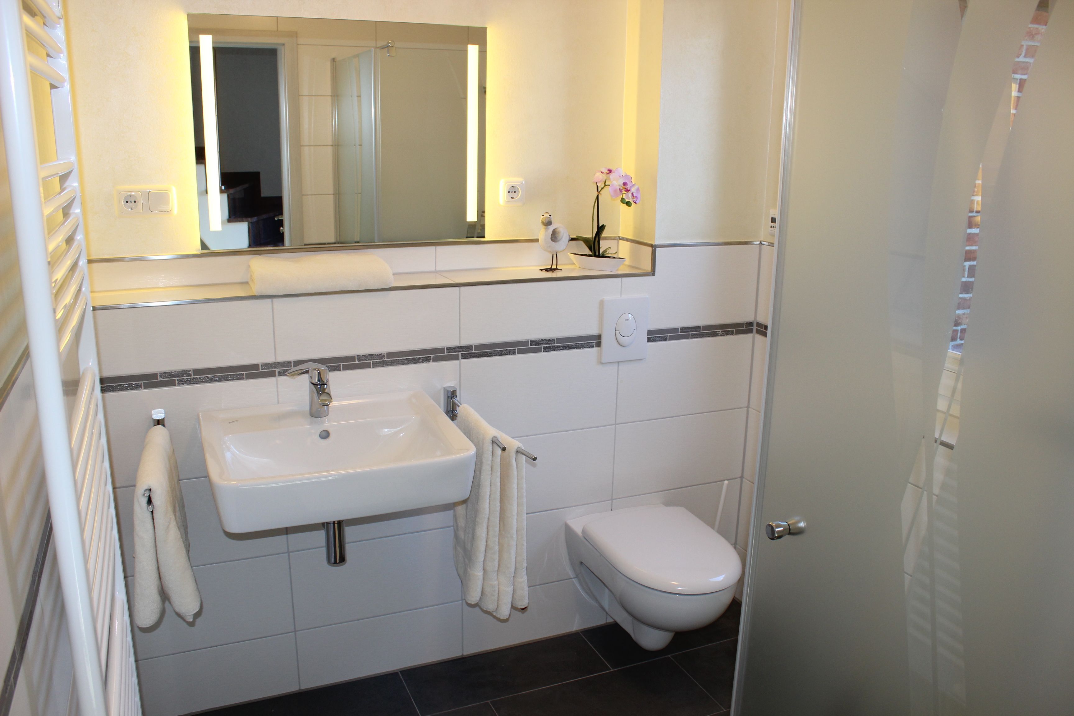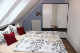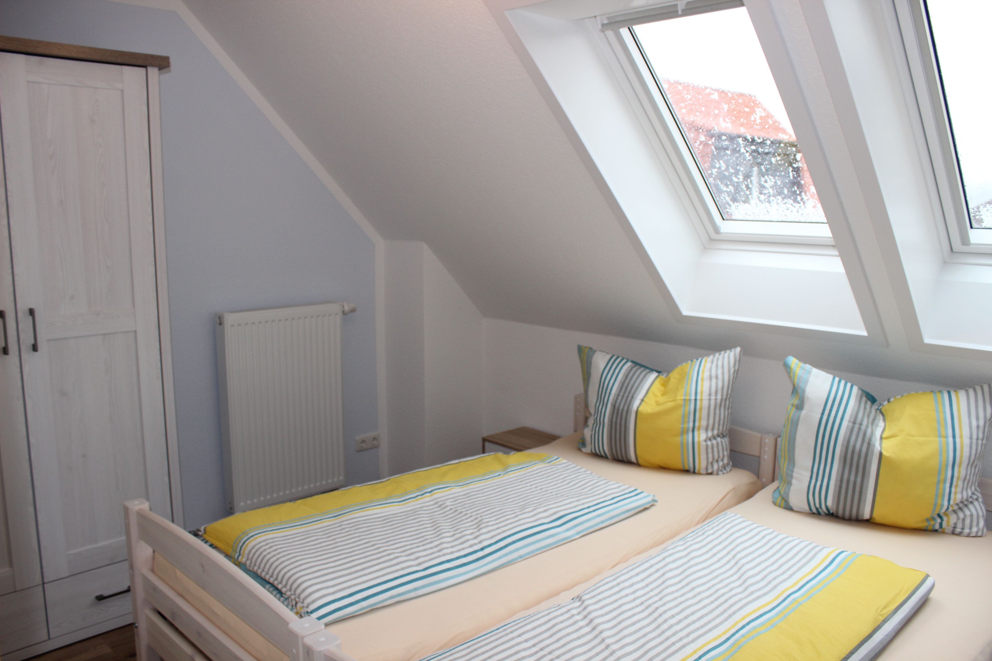 Ebenfalls im Erdgeschoss befindet sich das elegante Badezimmer mit Dusche, WC und Fußbodenheizung. Gegenüber vom Bad führt eine Treppe zu den beiden Schlafräumen im Obergeschoss. Im größeren befindet sich ein Doppelbett, während nebenan zwei Einzelbetten stehen. Die Betten beziehen wir für Sie, fühlen Sie sich bei Anreise einfach zuhause! In beiden Zimmern gibt es Kleiderschränke mit verschiedenen Abteilen, sodass Ihnen genügend Stauraum für die Unterbringung von Lieblingskleidern und persönlichen Gegenständen zur Verfügung steht. Fenster durchbrechen die Dachschrägen - so fungiert der Usedomer Sternenhimmel als natürliches Nachtlicht!