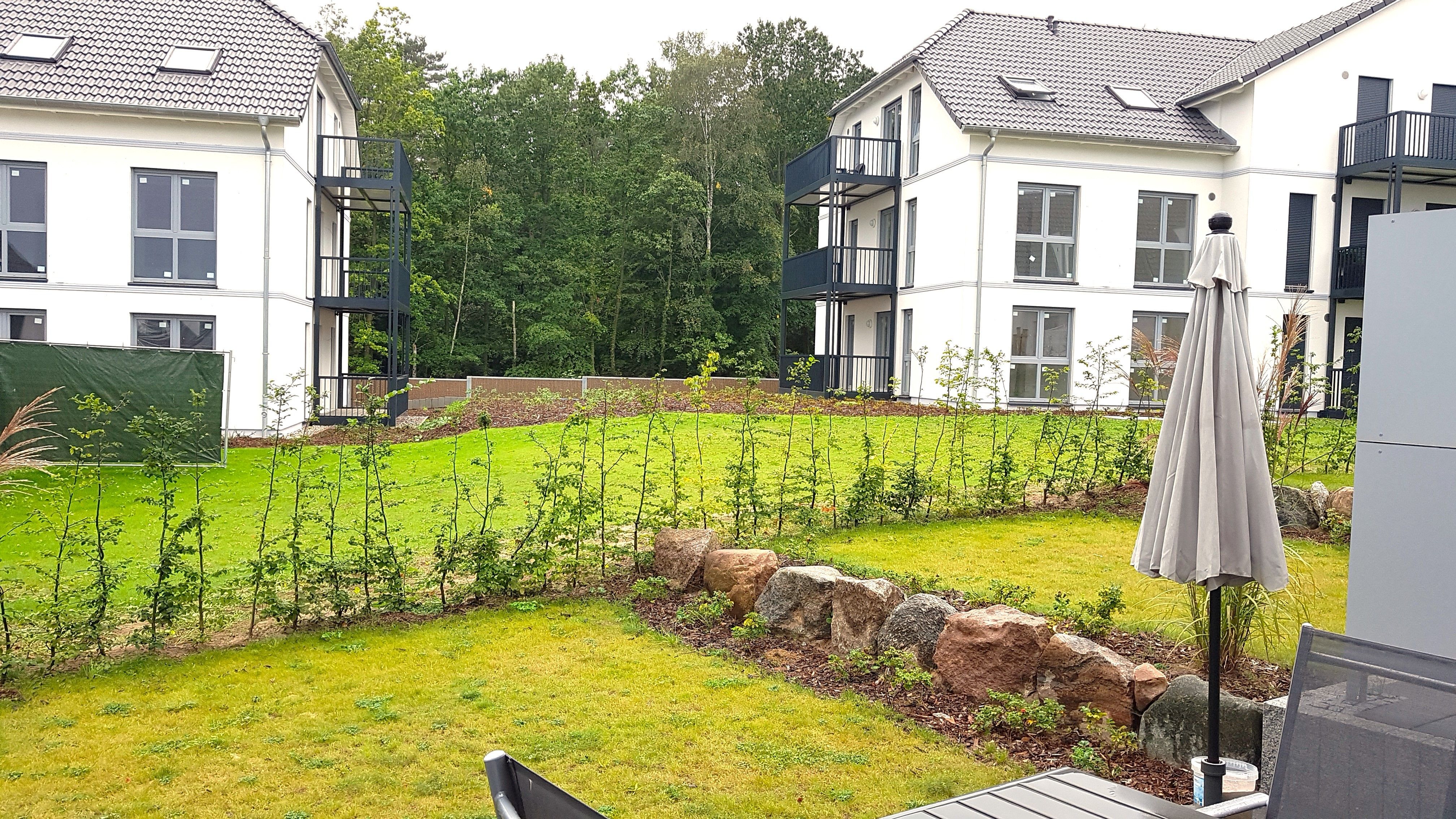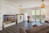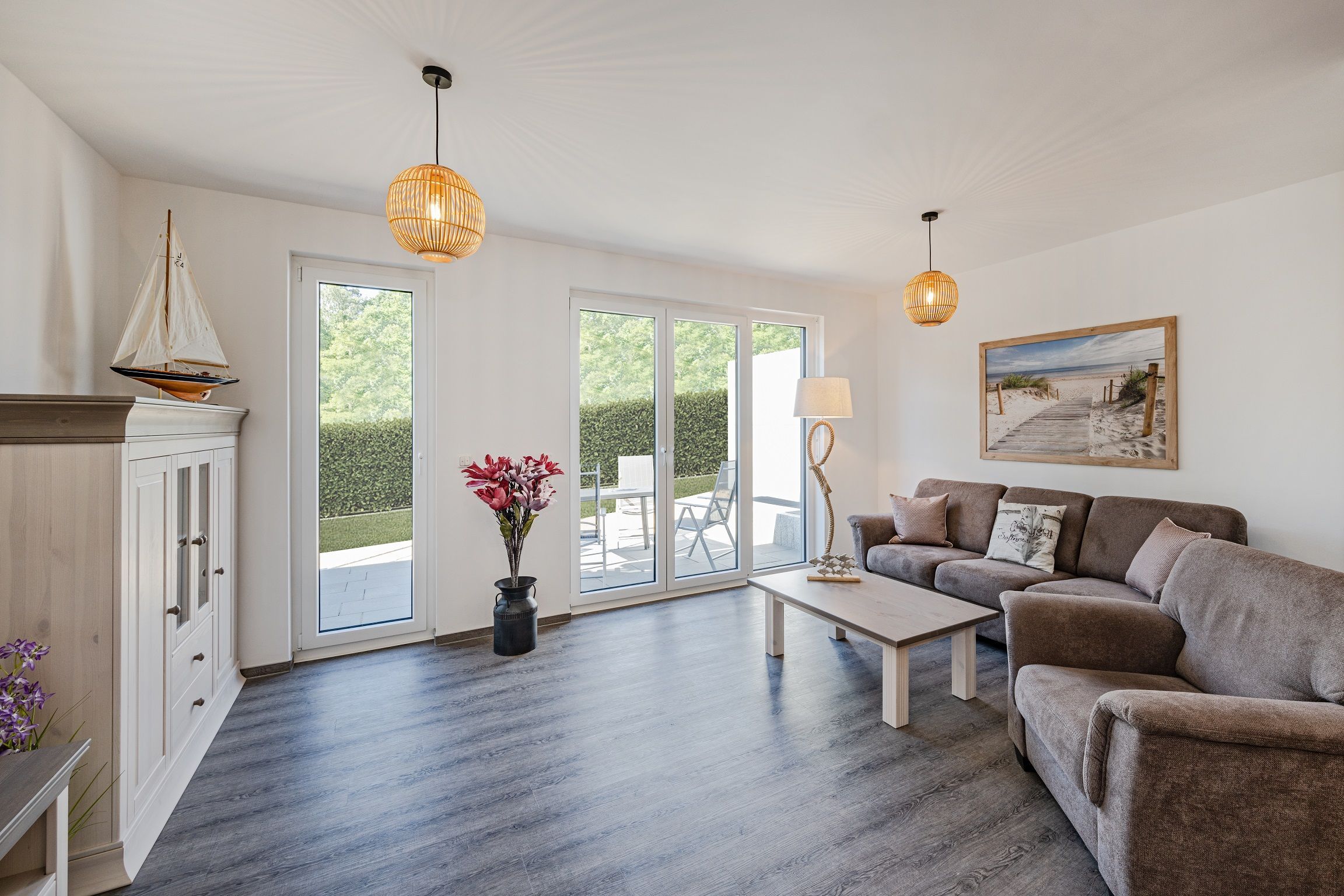Die Sonnenterasse mit Gartenmöbeln und kleinen Garten erreichen Sie durch das Wohnzimmer und können Ihren Urlaub in vollen Zügen genießen.