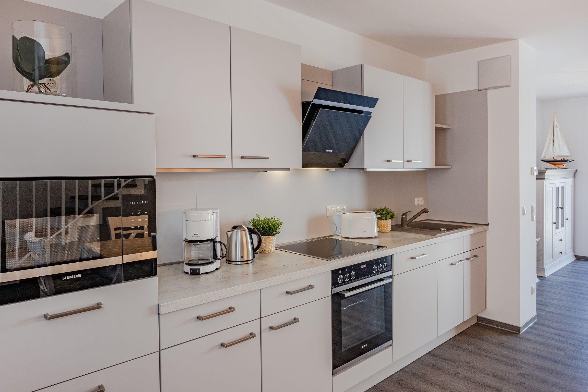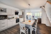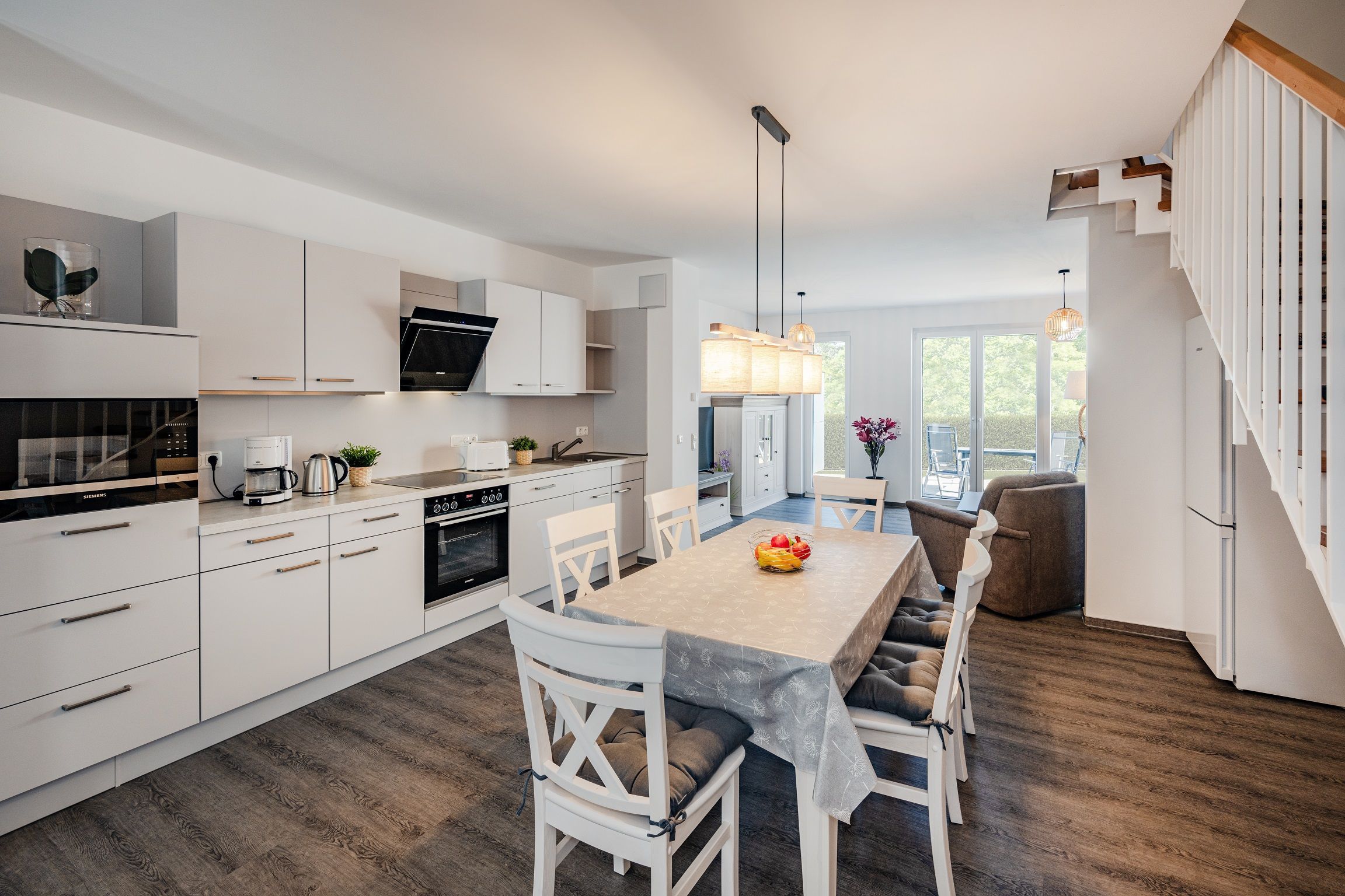 Im Erdgeschoß befindet sich die offene helle Landhausküche, die über eine Komplettausstattung (Backofen, Cerankochfeld, Mikrowelle, Wasserkocher, Kaffeemaschine, Toaster, Spülmaschine, Kühlschrank mit separaten Gefrierabteil) und einen großen Esstisch mit 6 Stühlen verfügt. Von dort aus gelangt man zum gemütlichen Wohnbereich. Dort befindet sich eine Couch, Sessel und ein Tisch sowie ein QLED-TV. Ein Badezimmer mit ebenerdiger Dusche und WC befindet sich ebenfalls im Erdgeschoss.