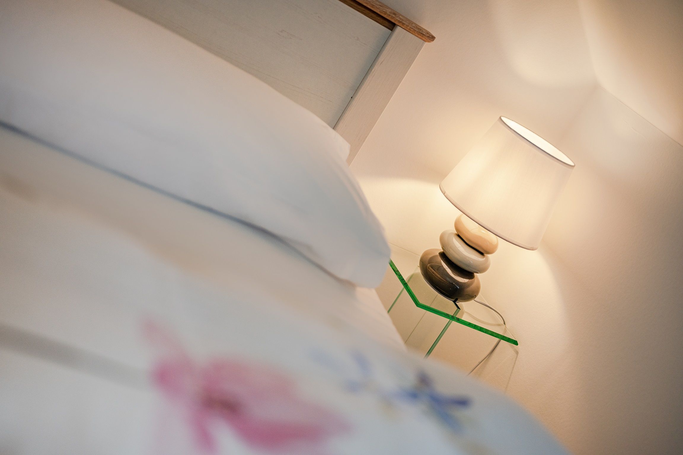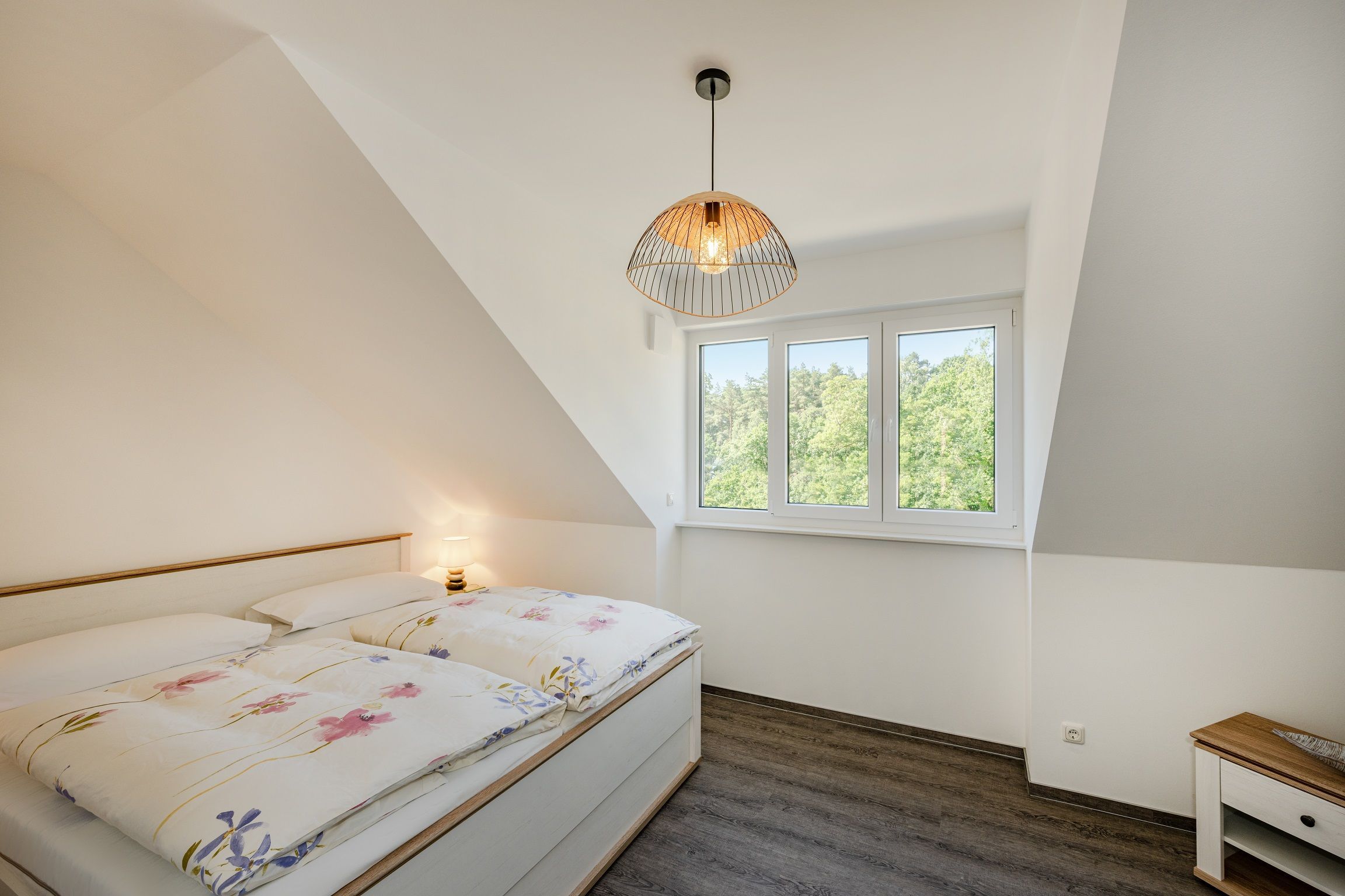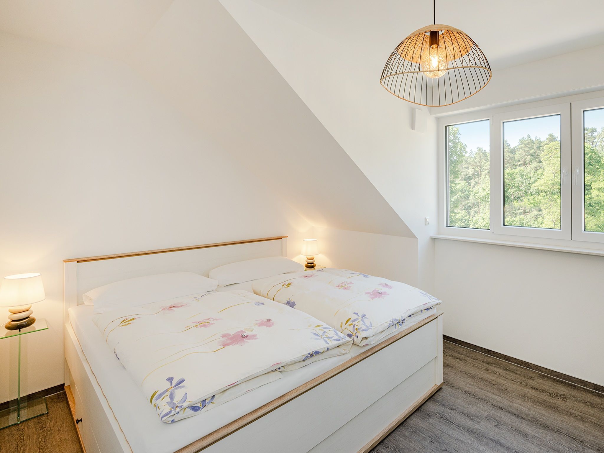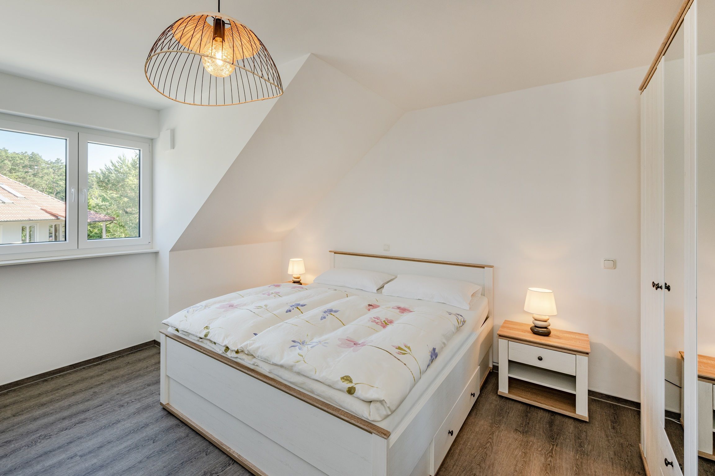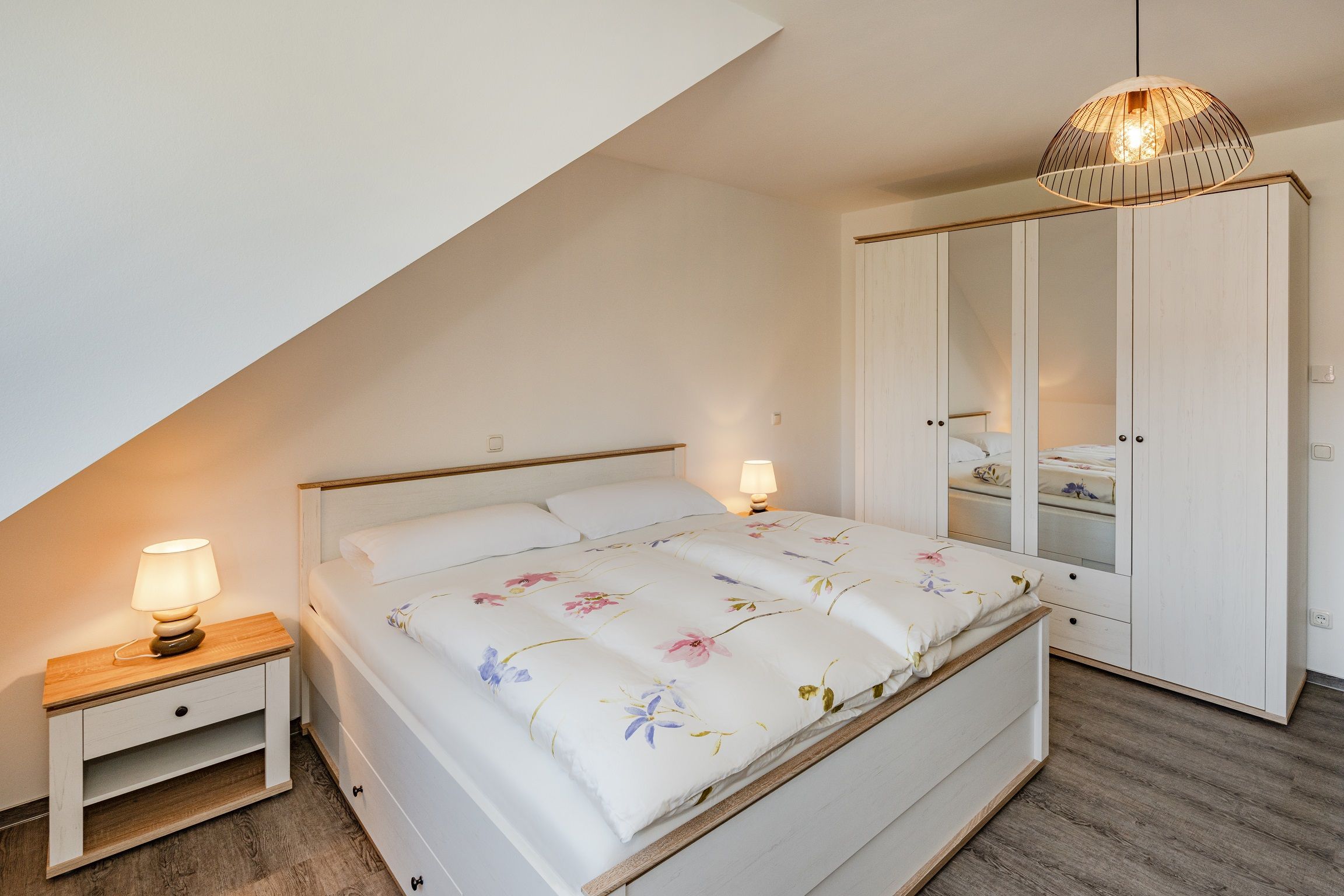 Im Obergeschoss gibt es 2 separate Schlafräume, die mit jeweils einem hochwertigen Doppelbett und Kleiderschrank ausgestattet sind. Ein Badezimmer mit ebenerdiger Dusche und WC. An den Fenstern befinden sich Plissees und an einigen Fenstern ein Insektenschutz.