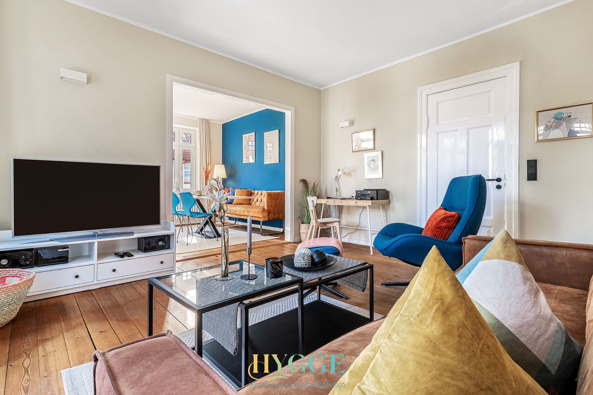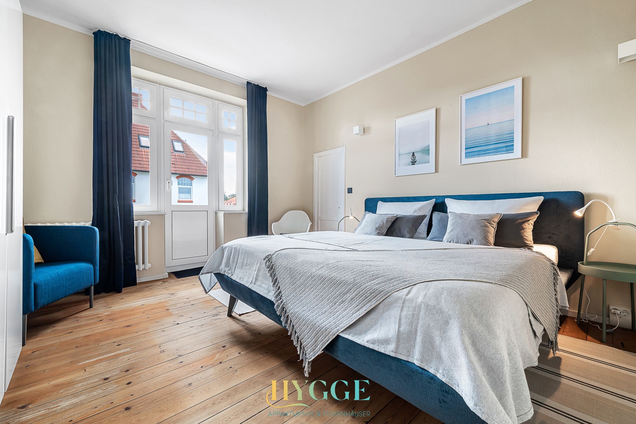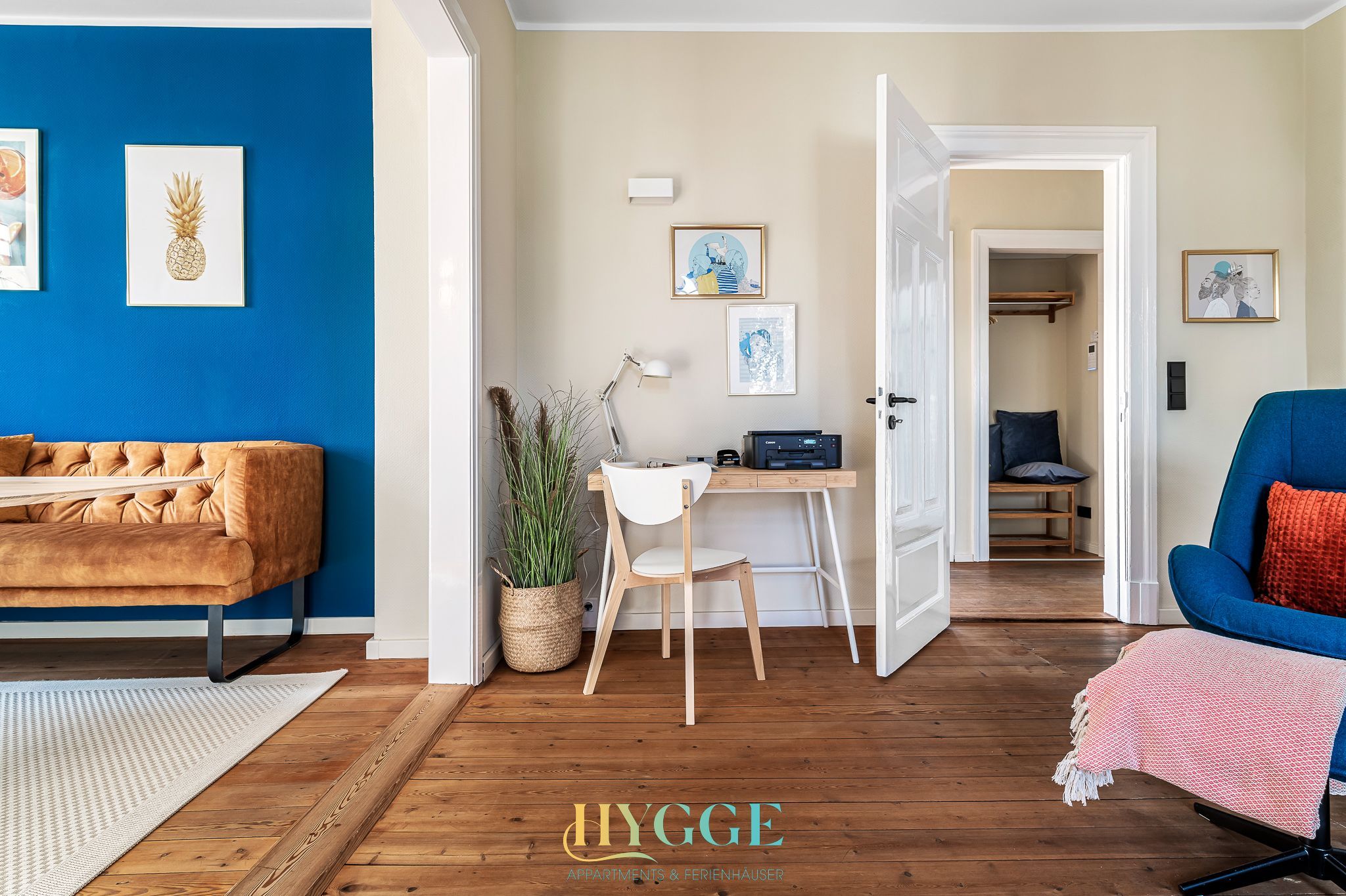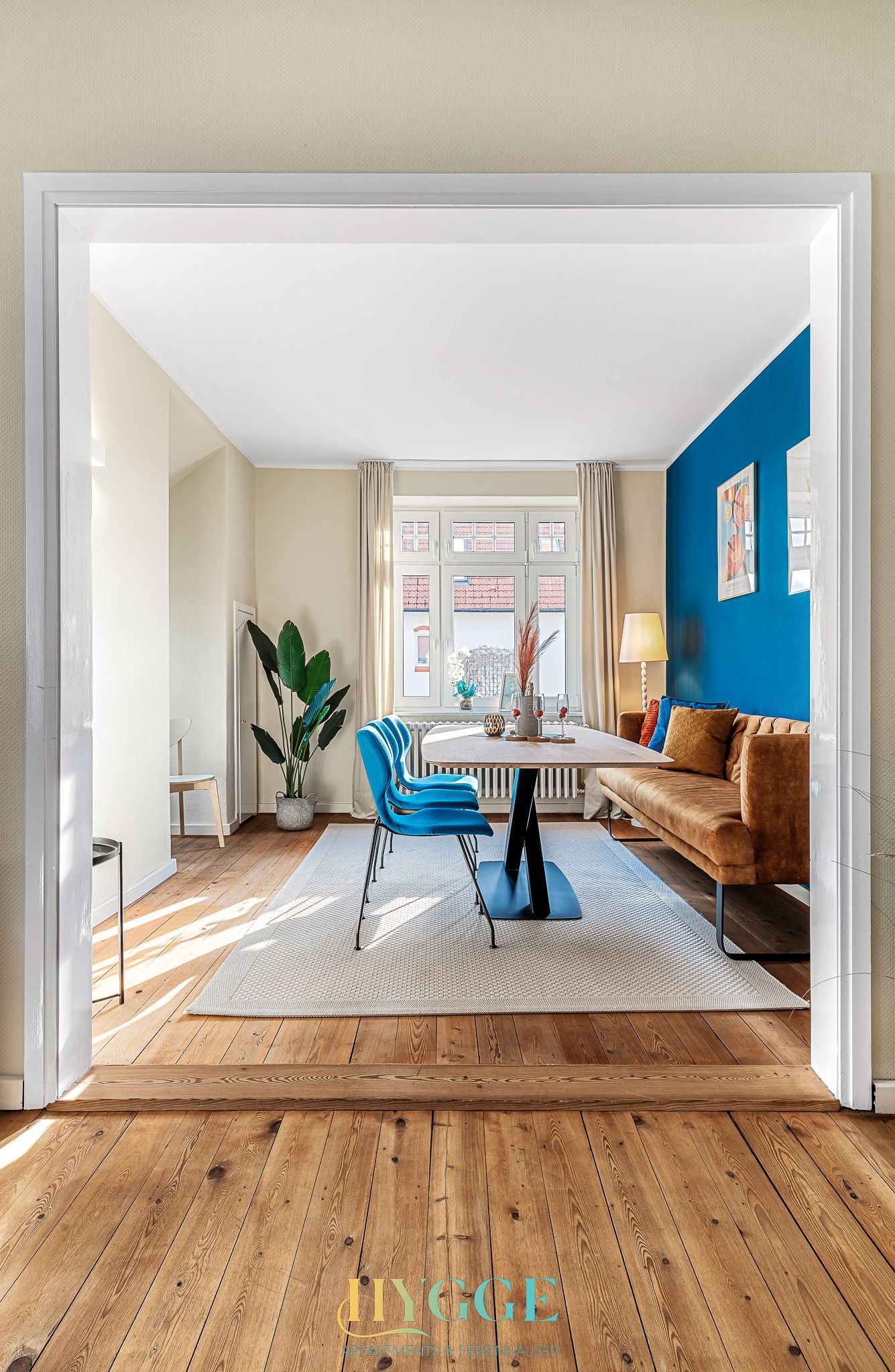 Diese schöne Altbauwohnung befindet sich im 1.OG der Villa Hygge mit Balkon im Wohnzimmer und Schlafzimmer. Alle Zimmer sind mit einem Flur verbunden. Die Wohnung ist mit historischem Holzfussboden ausgestattet. Schlafzimmer 1 hat ein großes Boxspringbett mit Blick auf den Mühle Amanda. Schlafzimmer 2 geht seitlich zum Objekt Richtung Westen raus. Das große Wohnzimmer hat ein angeschlossenes Esszimmer mit Platz für bis zu sechs Personen. Die Küche ist separat gegeüber des Wohnzimmers. Das Duschbad mit WC wurde komplett neu konzpiert und wie die gesamte Wohnung 2022 fertig gestellt.