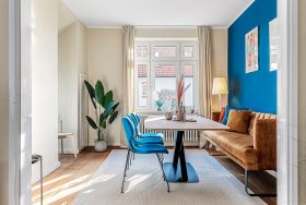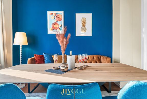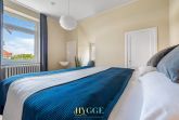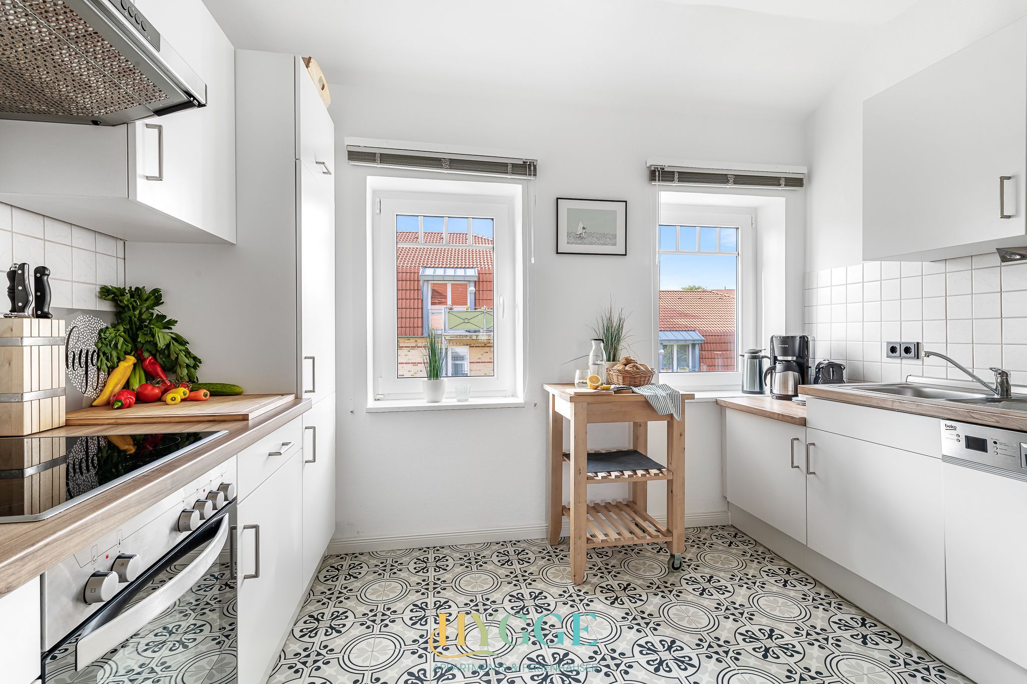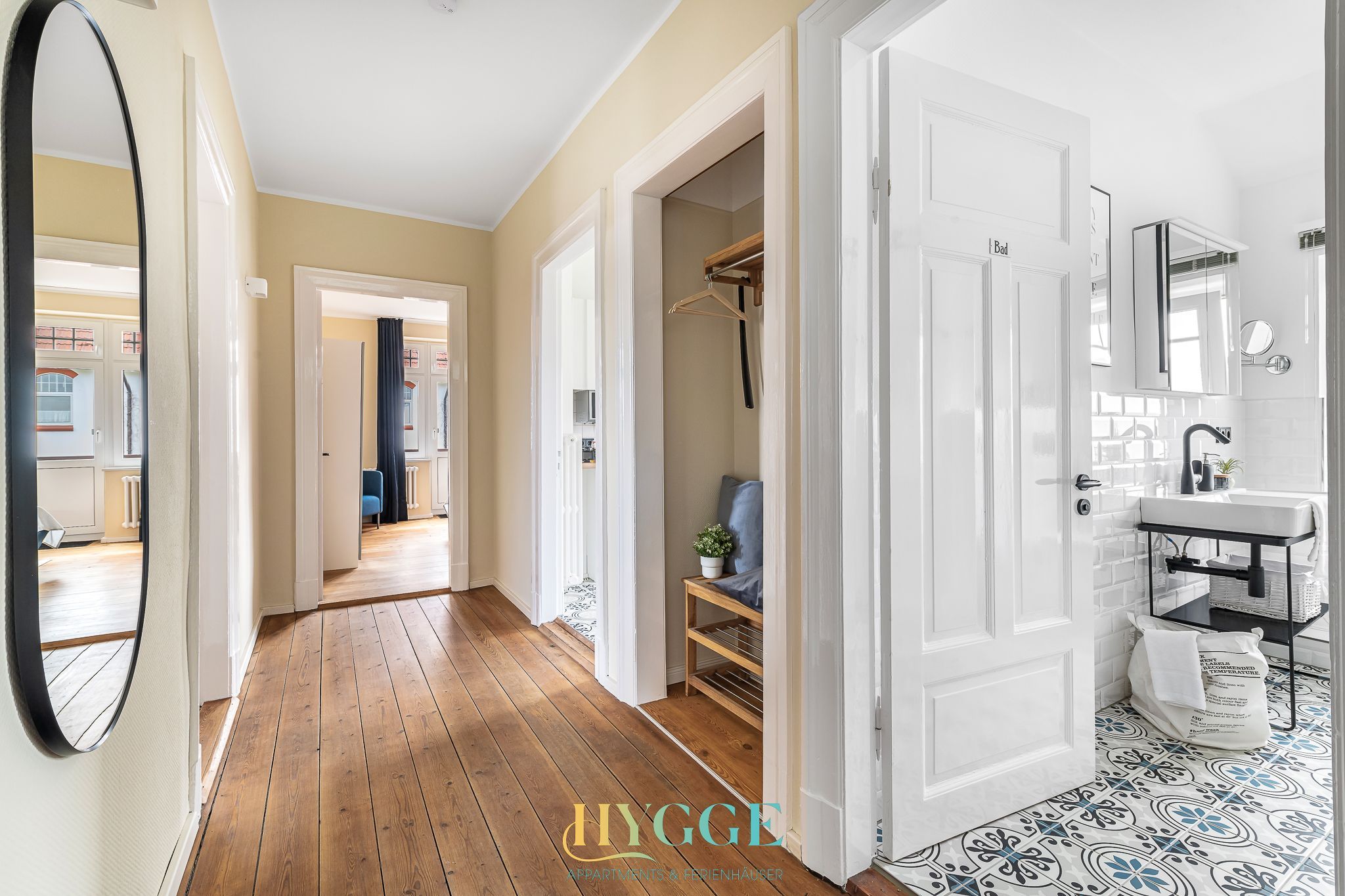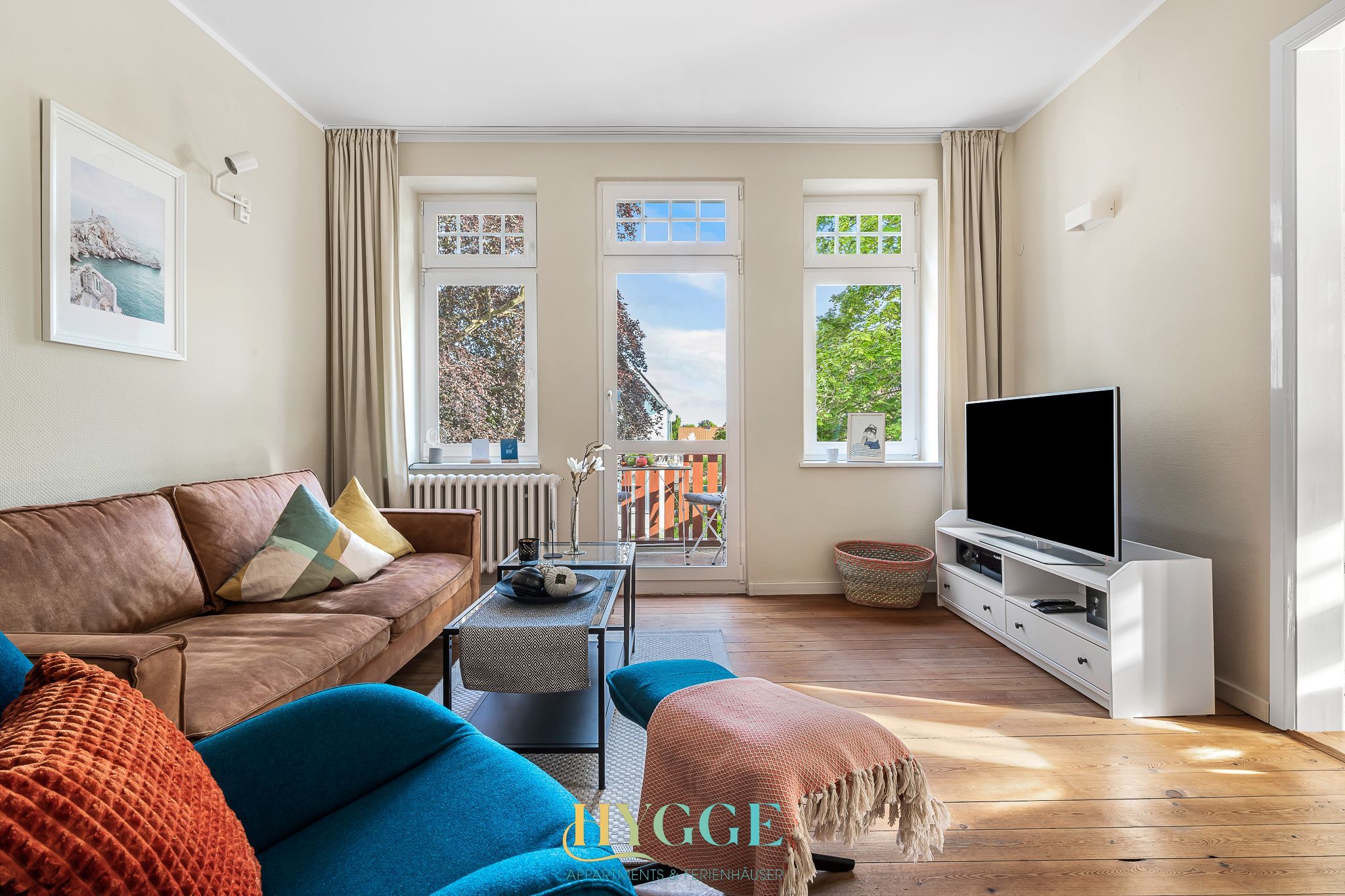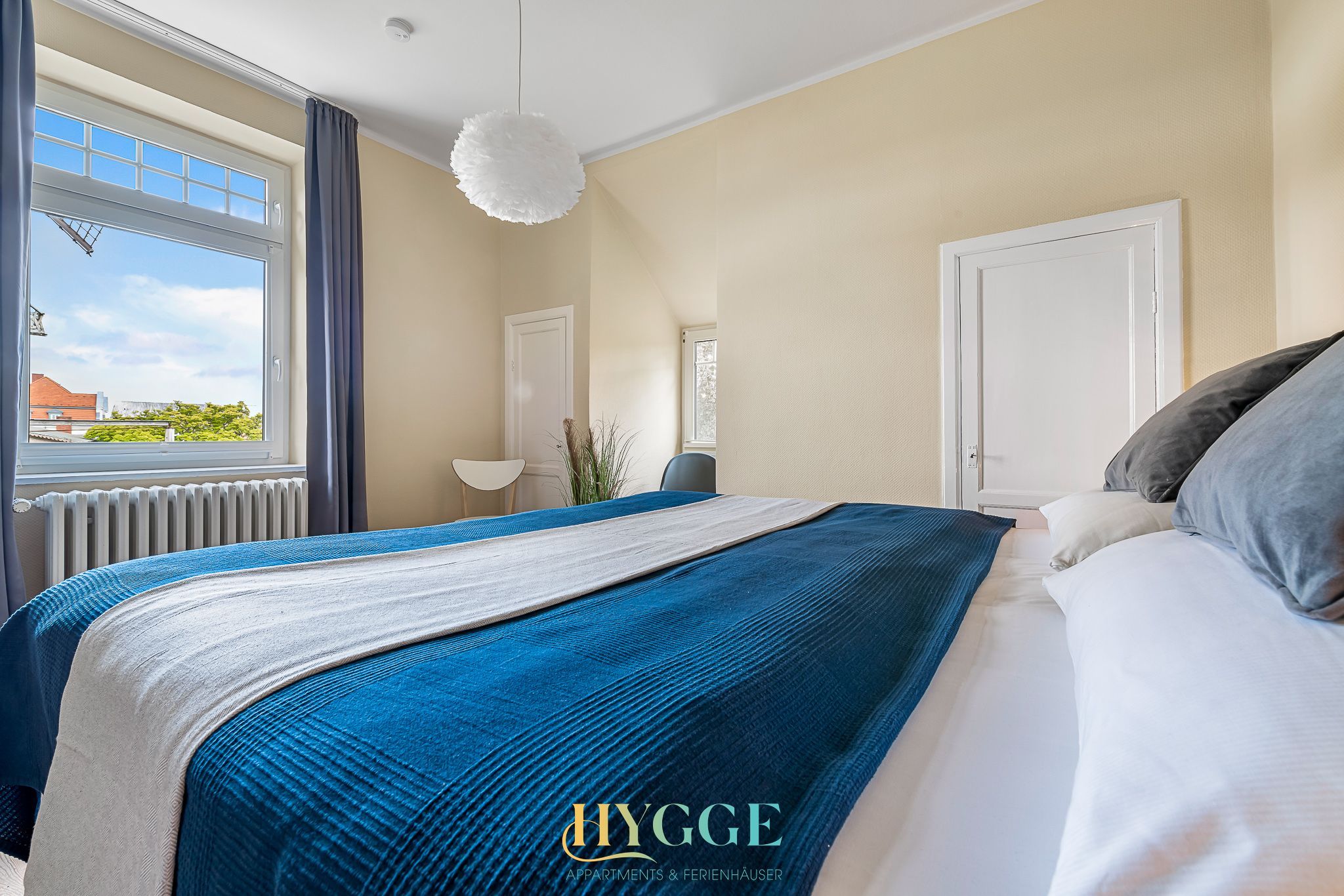 Diese schöne Altbauwohnung befindet sich im 1.OG der Villa Hygge mit Balkon im Wohnzimmer und Schlafzimmer. Alle Zimmer sind mit einem Flur verbunden. Die Wohnung ist mit historischem Holzfussboden ausgestattet. Schlafzimmer 1 hat ein großes Boxspringbett mit Blick auf den Mühle Amanda. Schlafzimmer 2 geht seitlich zum Objekt Richtung Westen raus. Das große Wohnzimmer hat ein angeschlossenes Esszimmer mit Platz für bis zu sechs Personen. Die Küche ist separat gegeüber des Wohnzimmers. Das Duschbad mit WC wurde komplett neu konzpiert und wie die gesamte Wohnung 2022 fertig gestellt.