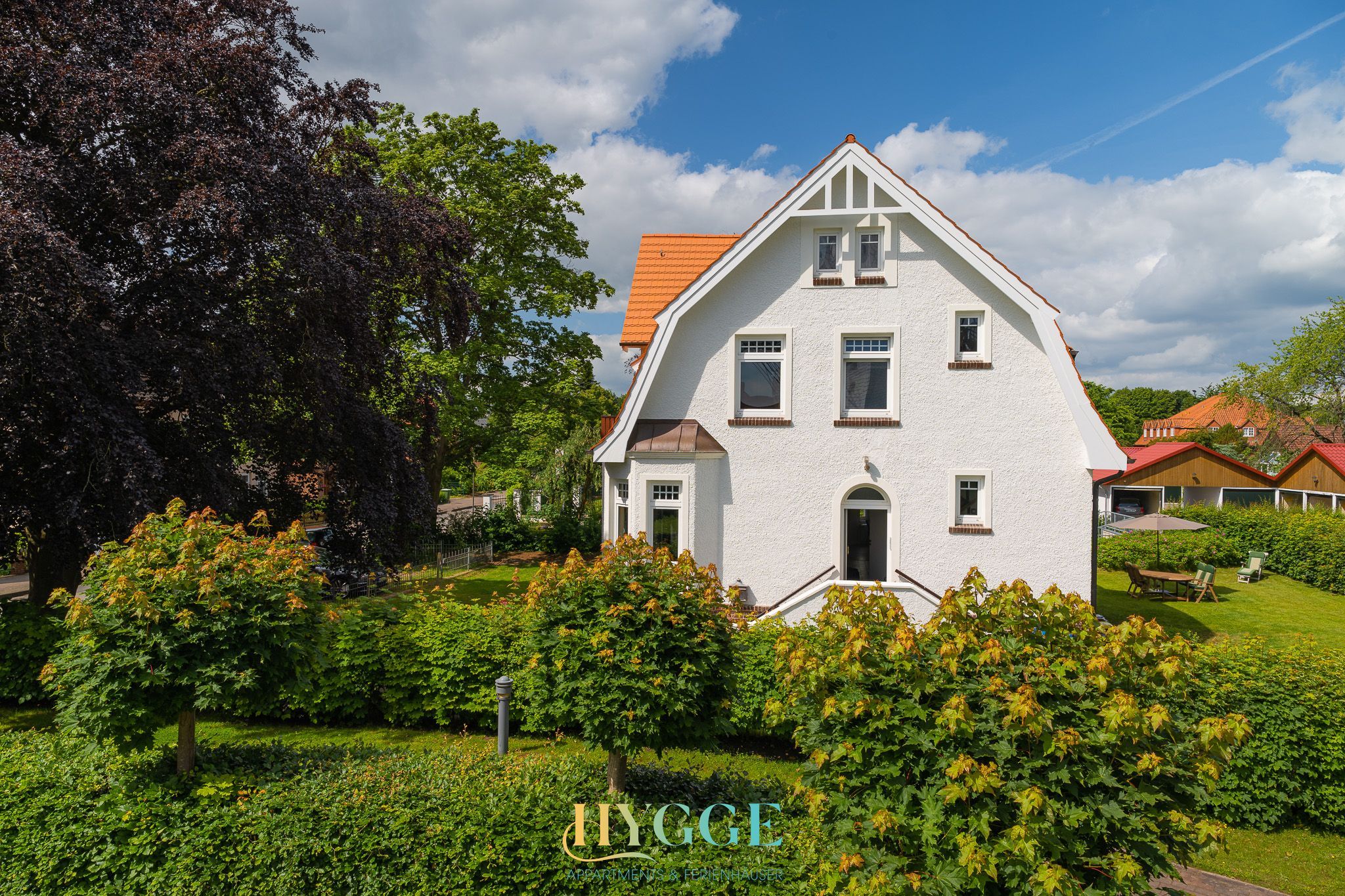 Villa Hygge in Kappeln an der Schlei. Moderne Ferienwohnungen in zentraler Lage zwischen Hafen, City und Mühle Amanda. Nur 15 Autominuten zum Strand und 2 Minuten in das Zentrum von Kappeln bzw. 5 Minuten zum Hafen. Trotzdem liegt das Objekt sehr ruhig. Hiebei handelt es sich um eine historische Altbauvilla aus dem Jahre 1904 die mit viel Liebe zum Detail 2022 saniert wurde. Insgesamt befinden sich im Objekt drei Wohnungen, umgegeben einem großen Garten.