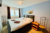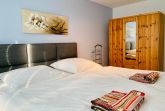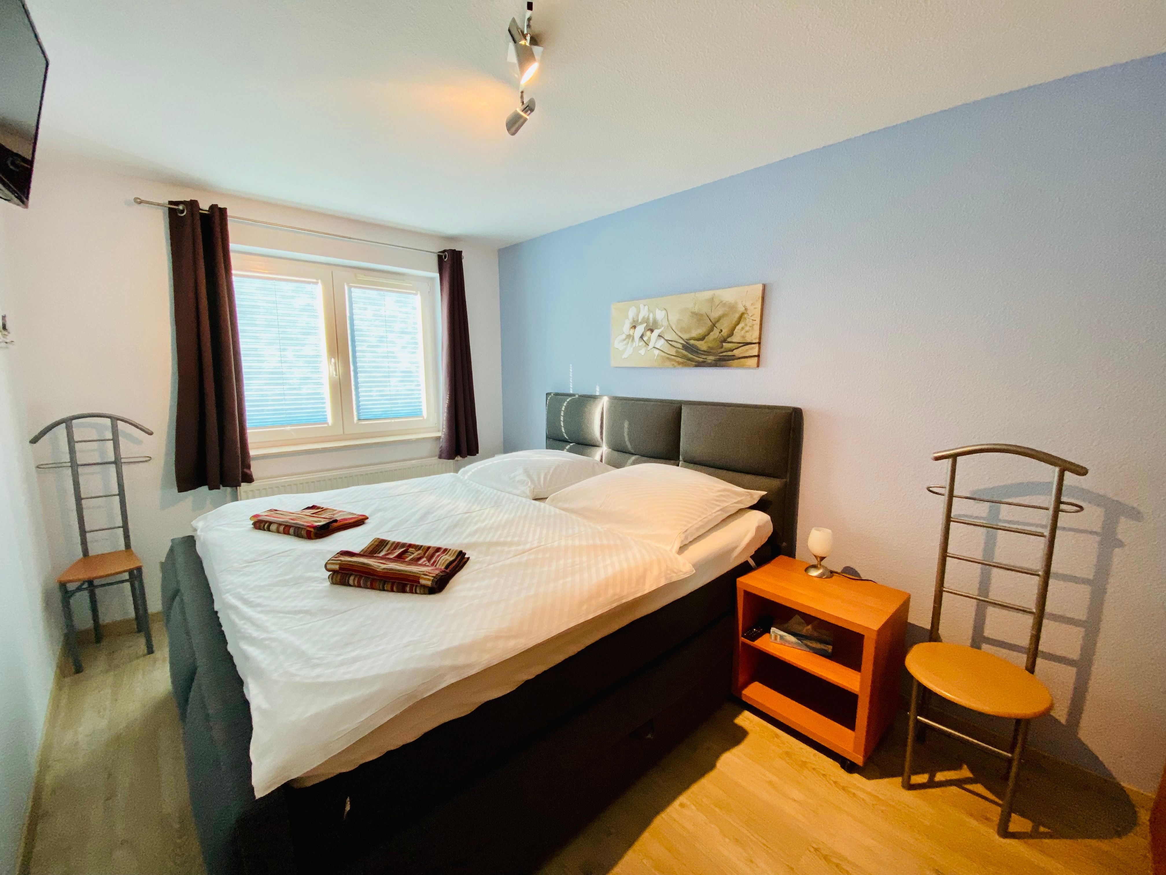 Das Schlafzimmer verfügt über ein Boxspringbett und einen Flachbildfernseher. Das Badezimmer mit Dusche hat ein Fenster. Zur Wohnung gehört ein kostenfreier Stellplatz und W-LAN