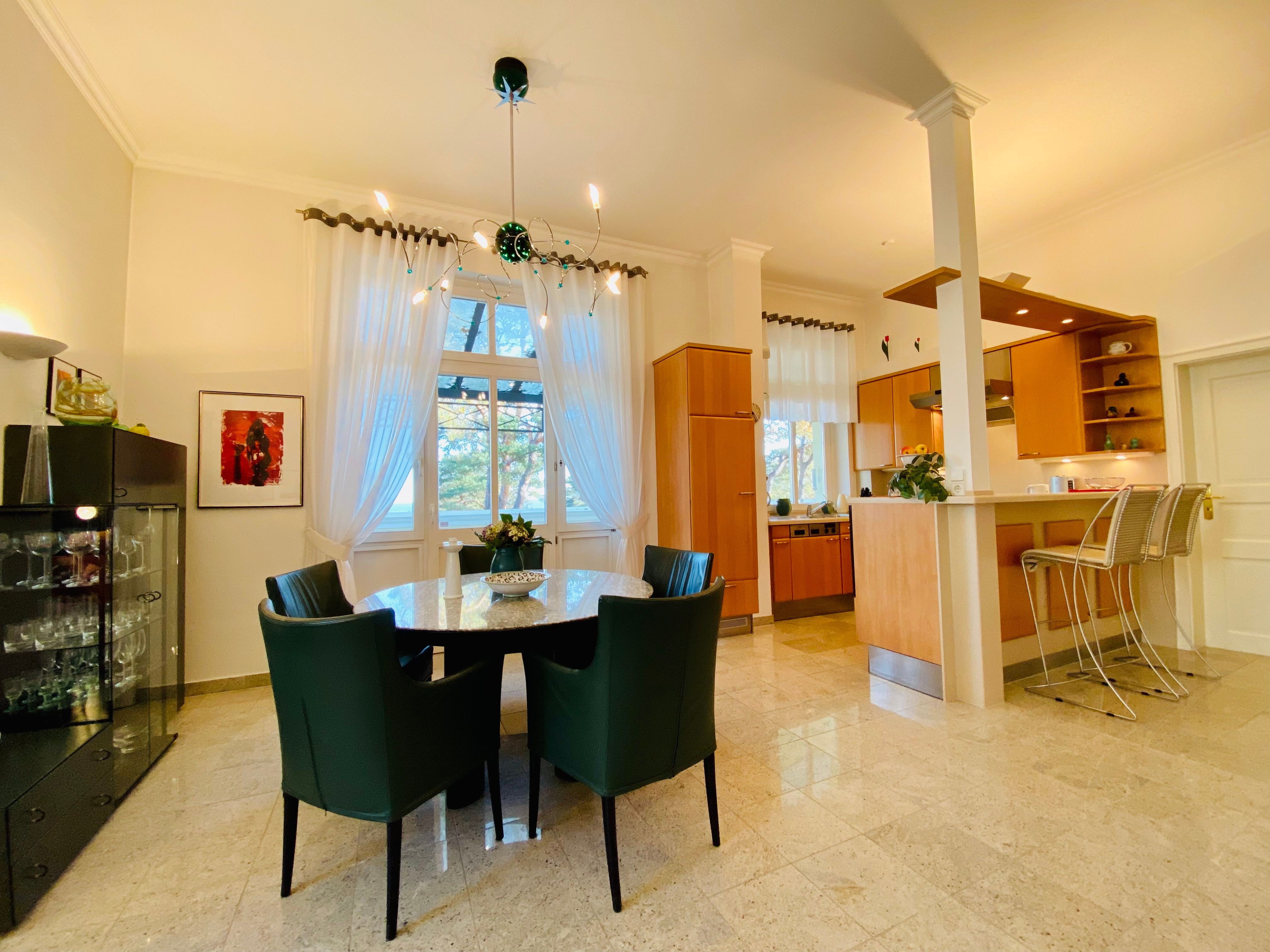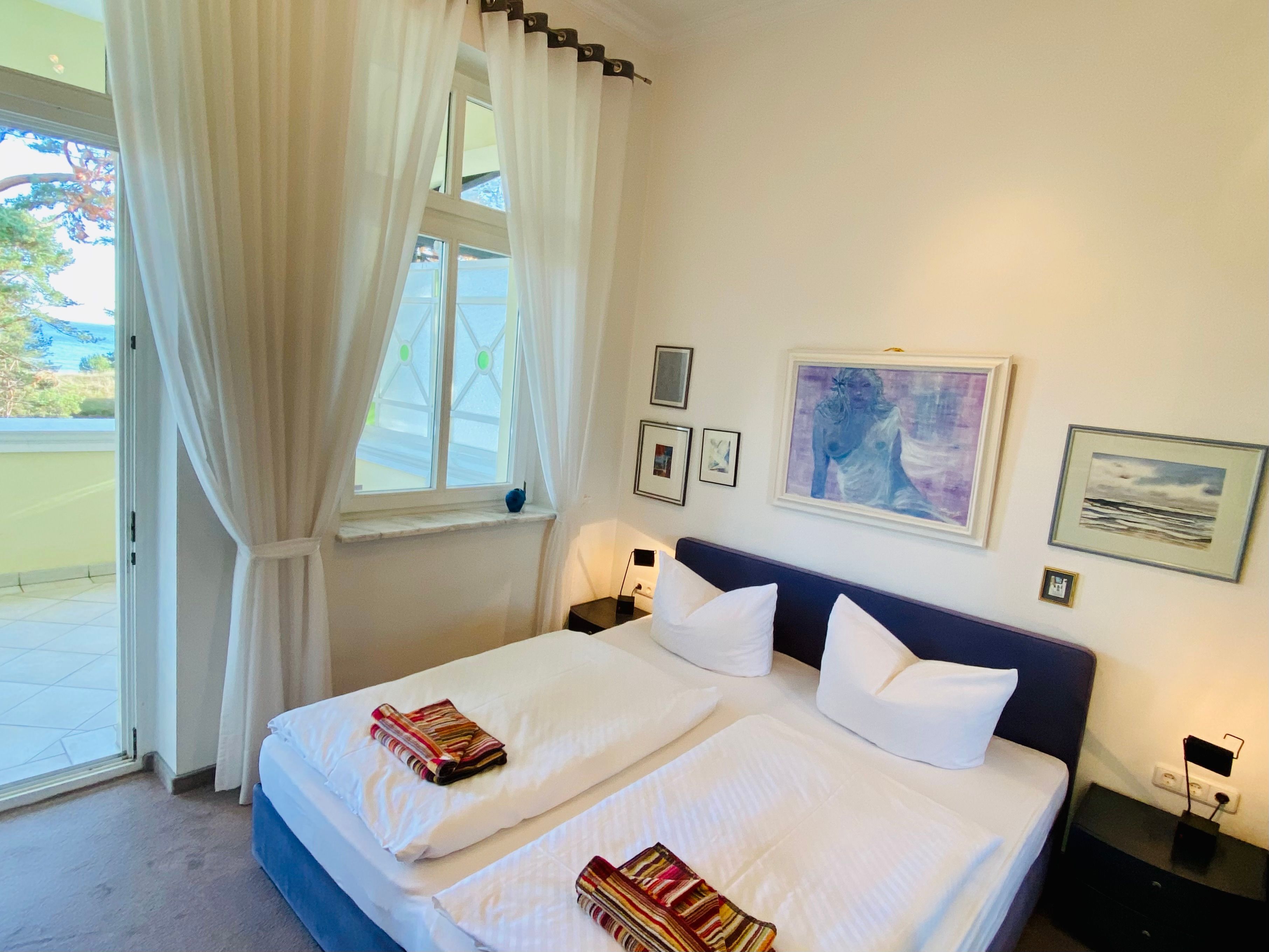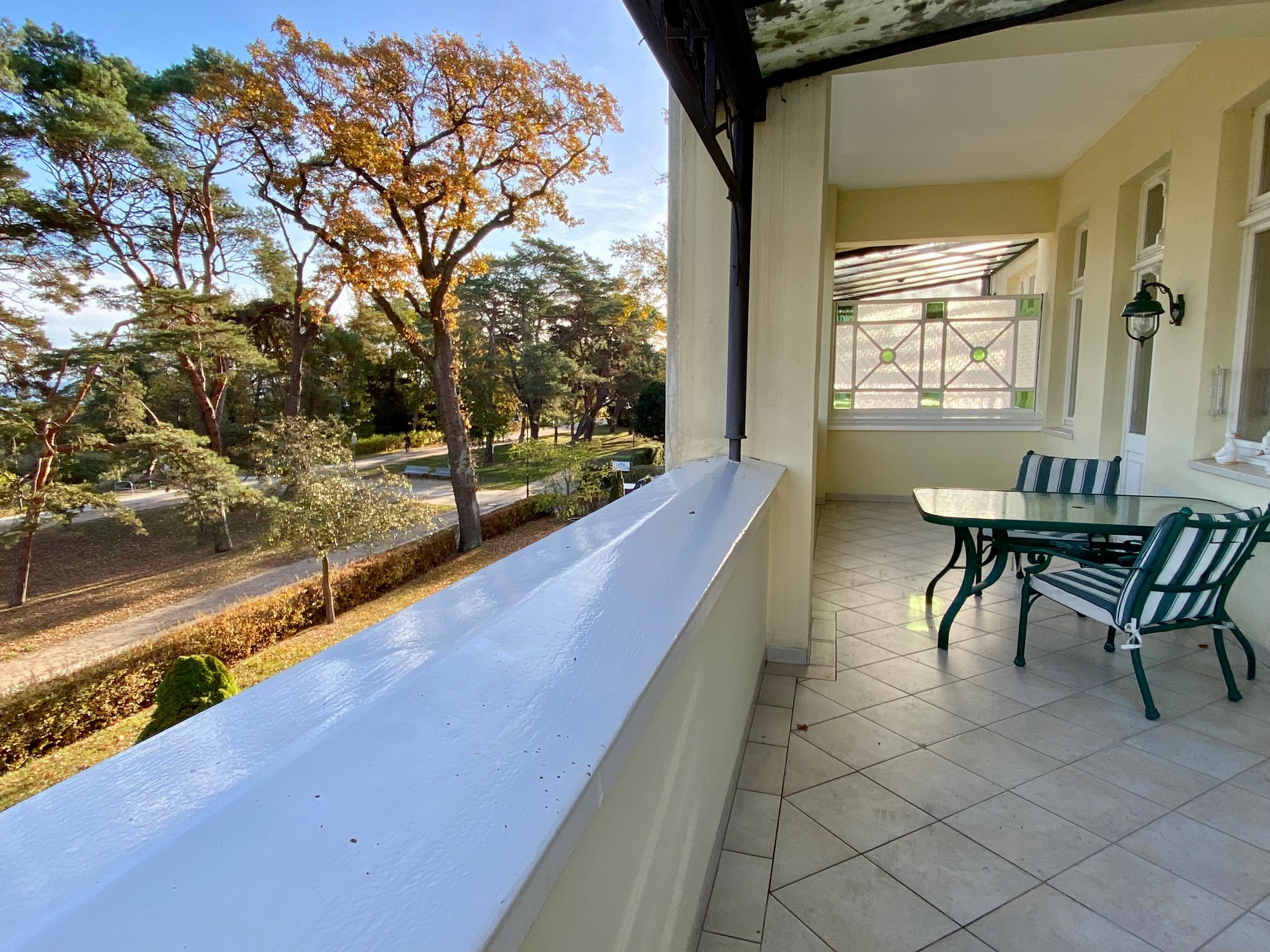 Die schöne Zweiraumwohnung befindet sich im 2. OG der Villa und ist über das historische Treppenhaus zu erreichen. Sie bietet den Gästen (Nichtraucher) viel Komfort und Platz: im romantischen Wohnzimmer mit tollem Kamin, in der offenen Komplettküche mit Tresen und Waschmaschine, im Schlafzimmer mit gemütlichem Doppelbett und im Bad mit Badewanne. Vom Wohnraum gelangt man auf einen großen überdachten Balkon mit Seeblick. Genießen Sie hier Ihre Mahlzeiten oder nur den Blick auf die bewaldete Düne und aufs Meer. Stellplatz am Haus.