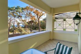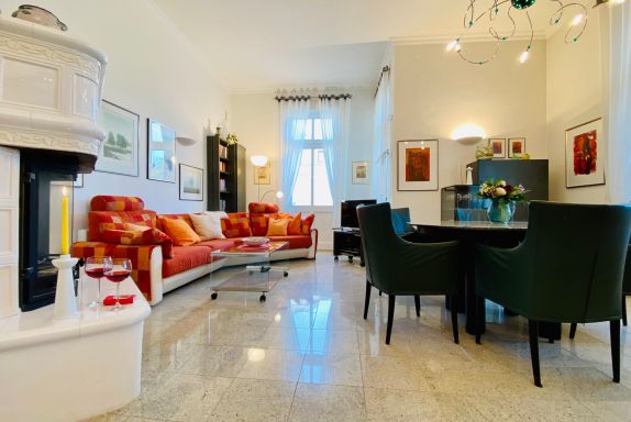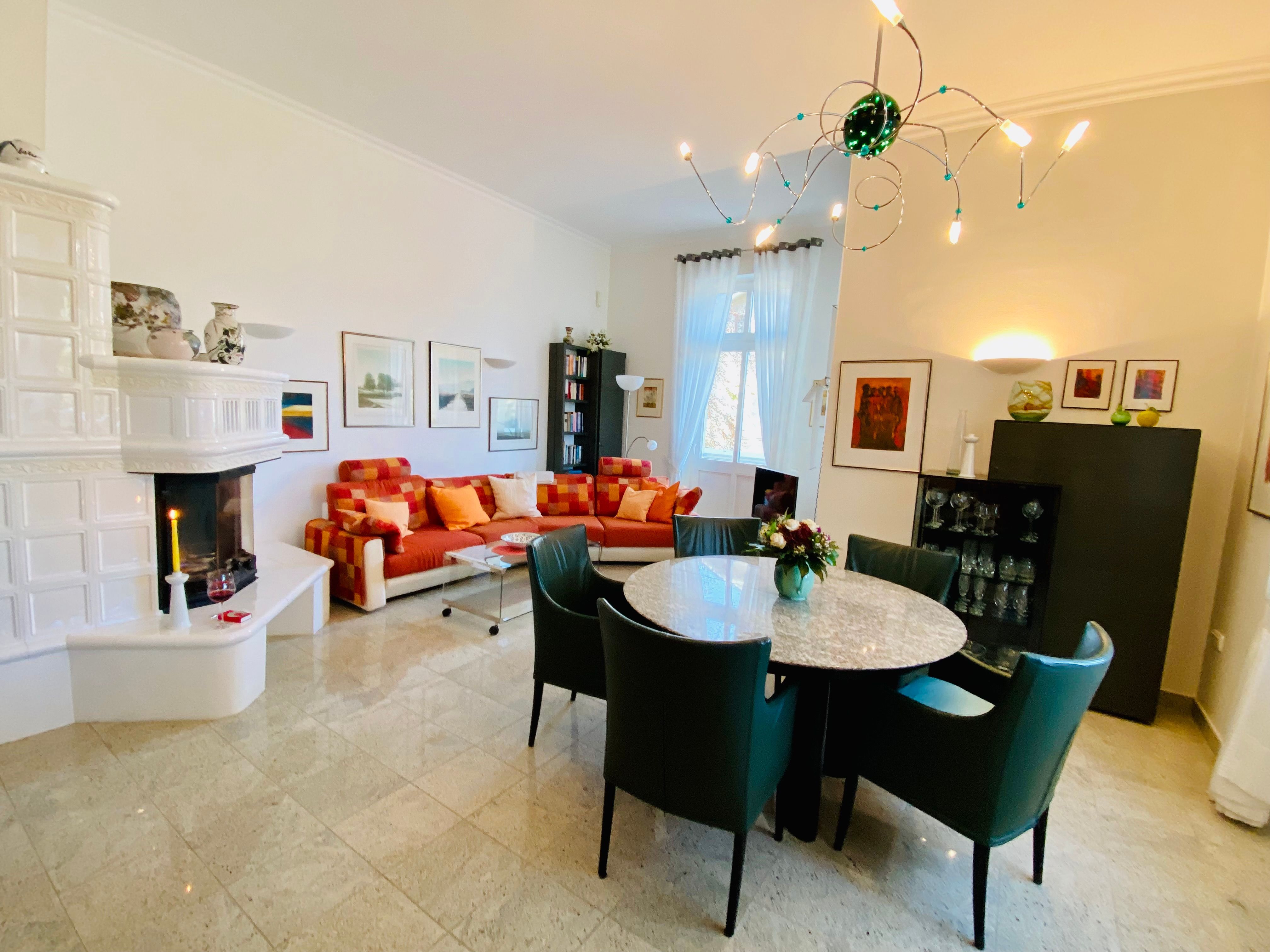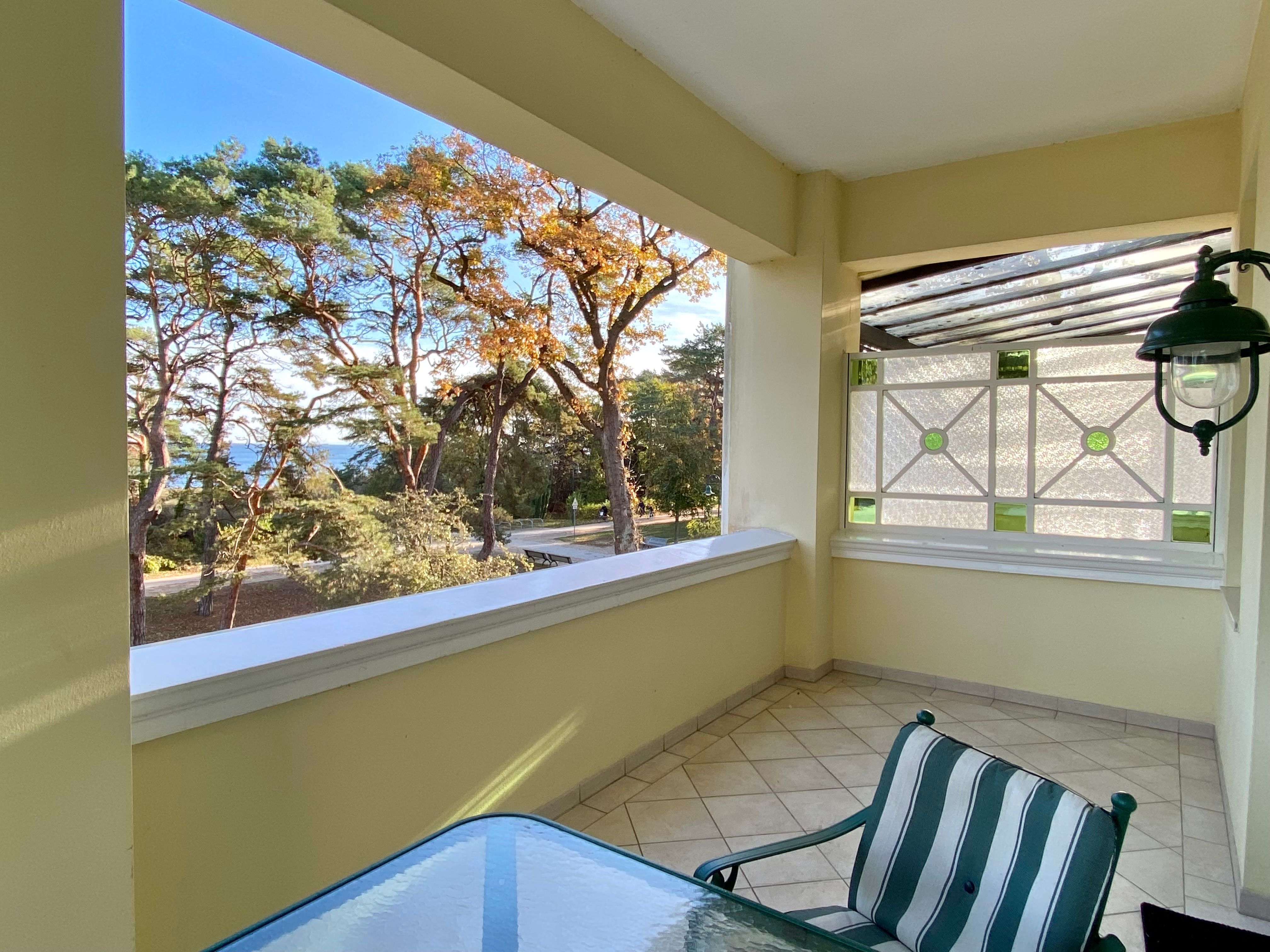 Die schöne Zweiraumwohnung befindet sich im 2. OG der Villa und ist über das historische Treppenhaus zu erreichen. Sie bietet den Gästen (Nichtraucher) viel Komfort und Platz: im romantischen Wohnzimmer mit tollem Kamin, in der offenen Komplettküche mit Tresen und Waschmaschine, im Schlafzimmer mit gemütlichem Doppelbett und im Bad mit Badewanne. Vom Wohnraum gelangt man auf einen großen überdachten Balkon mit Seeblick. Genießen Sie hier Ihre Mahlzeiten oder nur den Blick auf die bewaldete Düne und aufs Meer. Stellplatz am Haus.