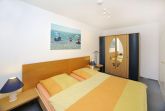 Im Schlafzimmer befindet sich ein Doppelbett und ein Kleiderschrank.