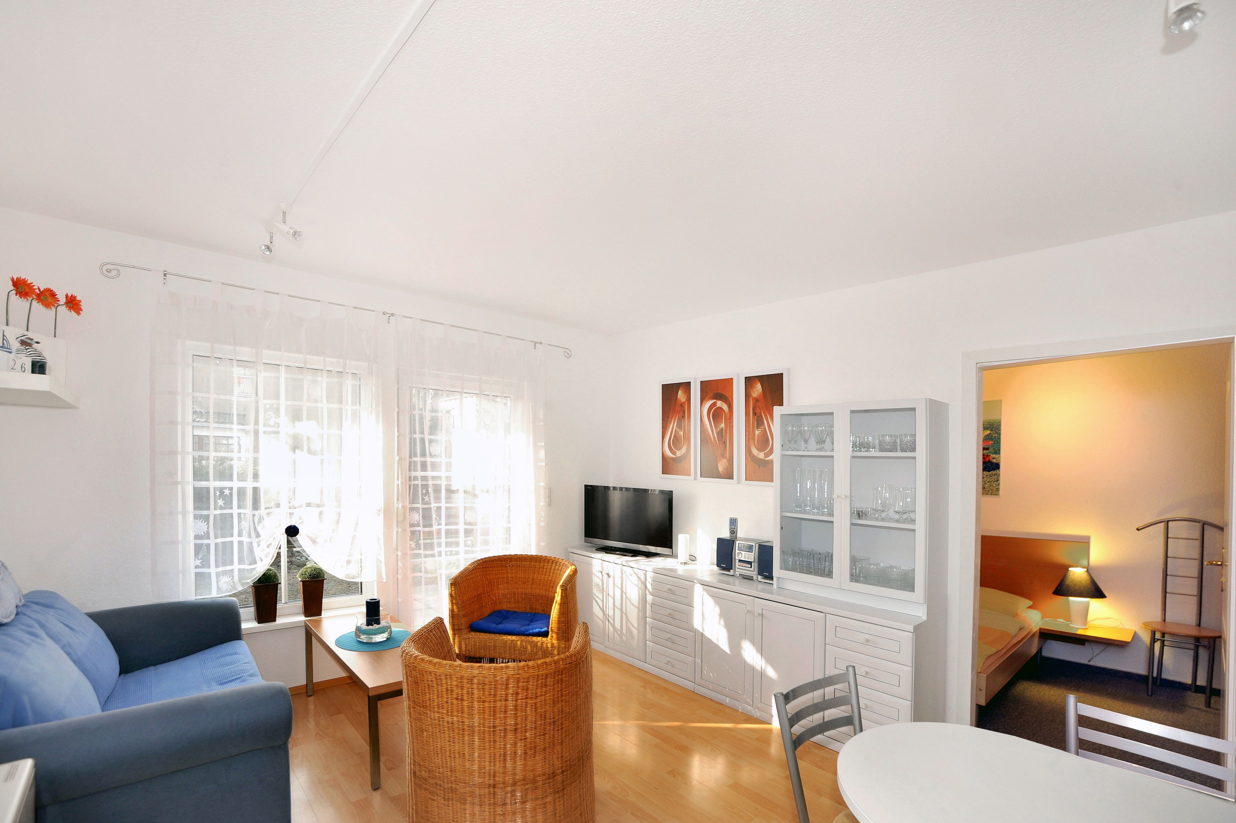 Im Wohnzimmer befindet sich die integrierte kleine Küche mit Sitzecke und Couch. Ein Flachbildfernseher ist vorhanden.