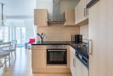 Die hier integrierte Küchenzeile bietet optimale technische Einrichtungen – wie eine Spülmaschine, einen Kühlschrank mit Gefrierfach, eine Kaffeemaschine, einen Herd bzw. Backofen und einen Toaster.