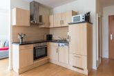 Die hier integrierte Küchenzeile bietet optimale technische Einrichtungen wie eine Spülmaschine, einen Kühlschrank mit Gefrierfach, eine Kaffeemaschine, einen Herd bzw. Backofen und einen Toaster.
