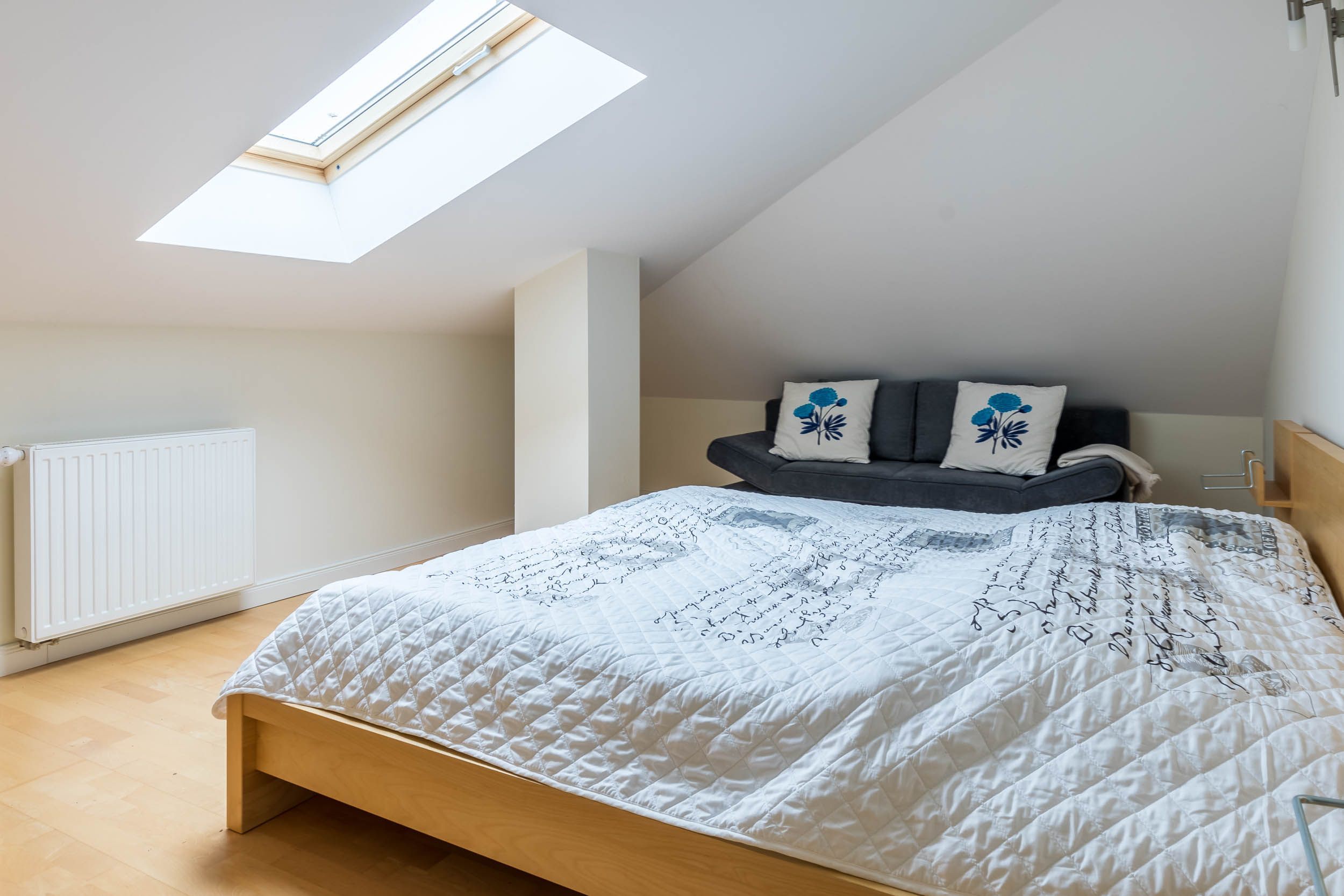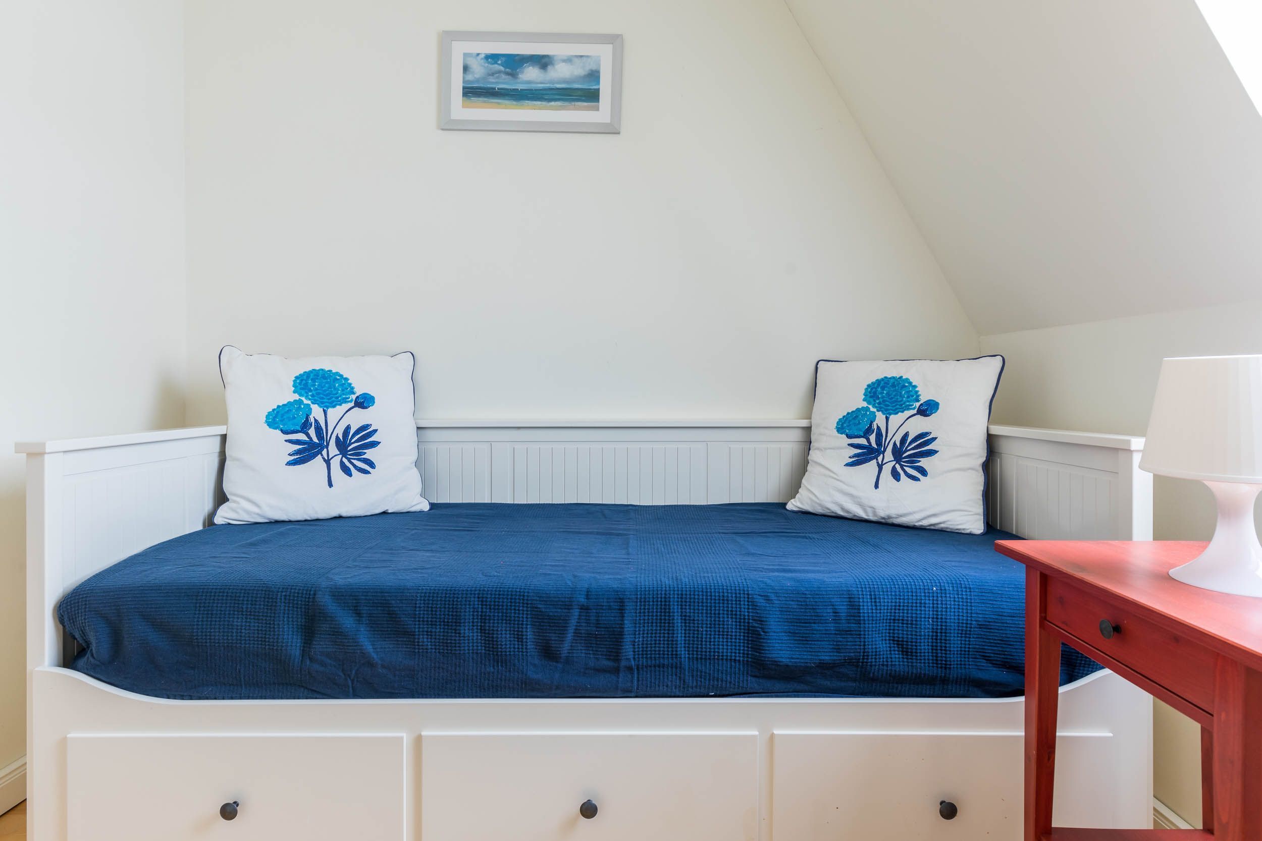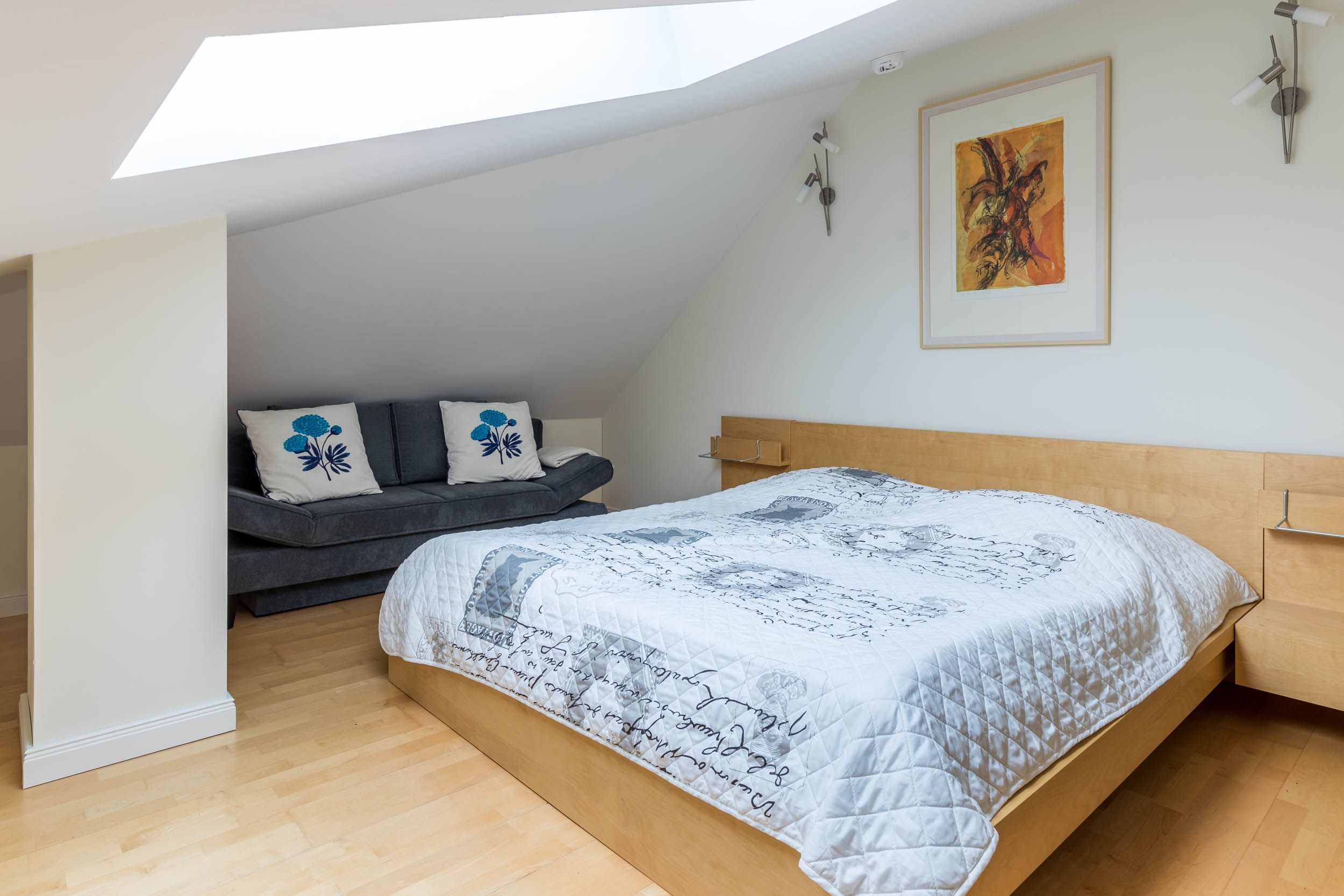 Weiterhin befindet sich auf dieser Ebene ein Schlafzimmer mit Doppelbett und Kommode sowie das Gäste-/ Kinderzimmer mit einem Einzelbett und einem Kleiderschrank.