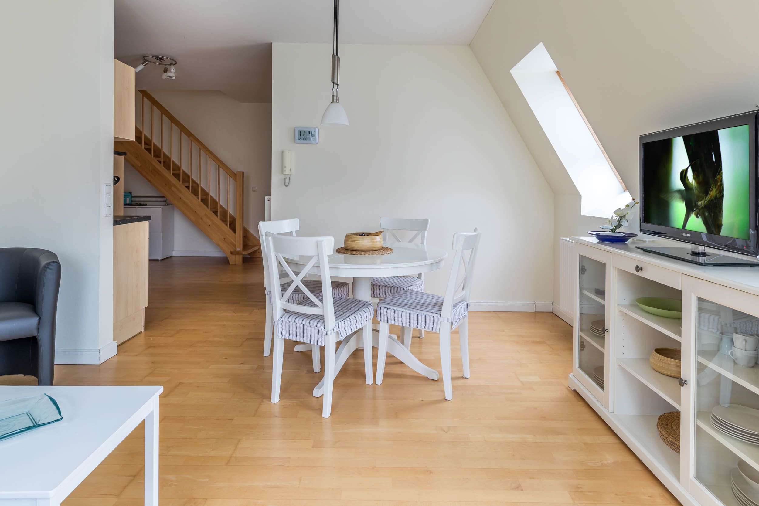 Der helle Wohn- und Essbereich in der ersten Wohnebene verfügt sowohl über eine weitläufige Essecke mit ausziehbarem Esstisch und passenden 5 Stühlen als auch eine gemütliche Sofaecke, die mit Flatscreen-TV, DVD-Player und Stereoanlage ausgestattet ist. Von hier aus erreichen Sie auch den möblierten Balkon.