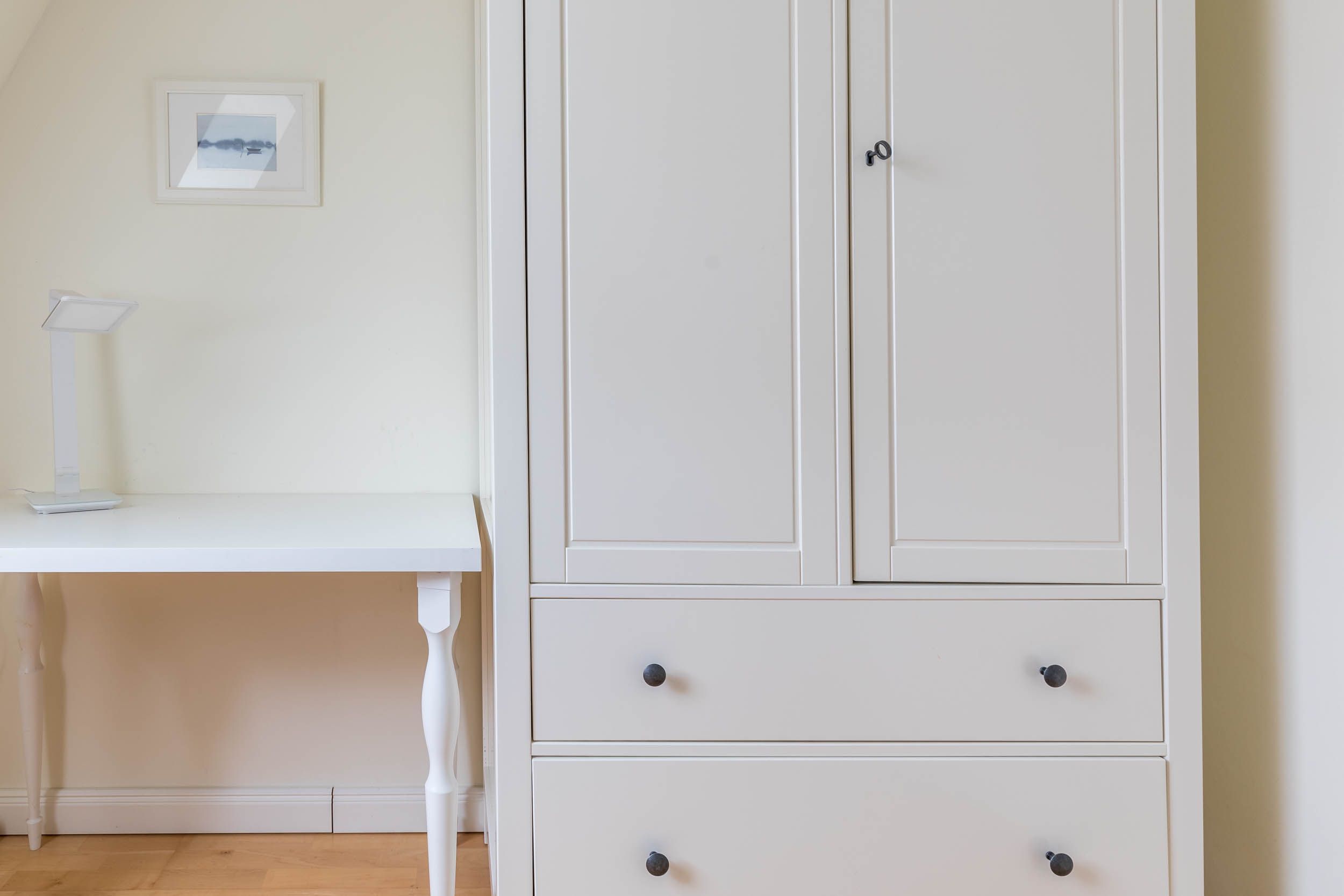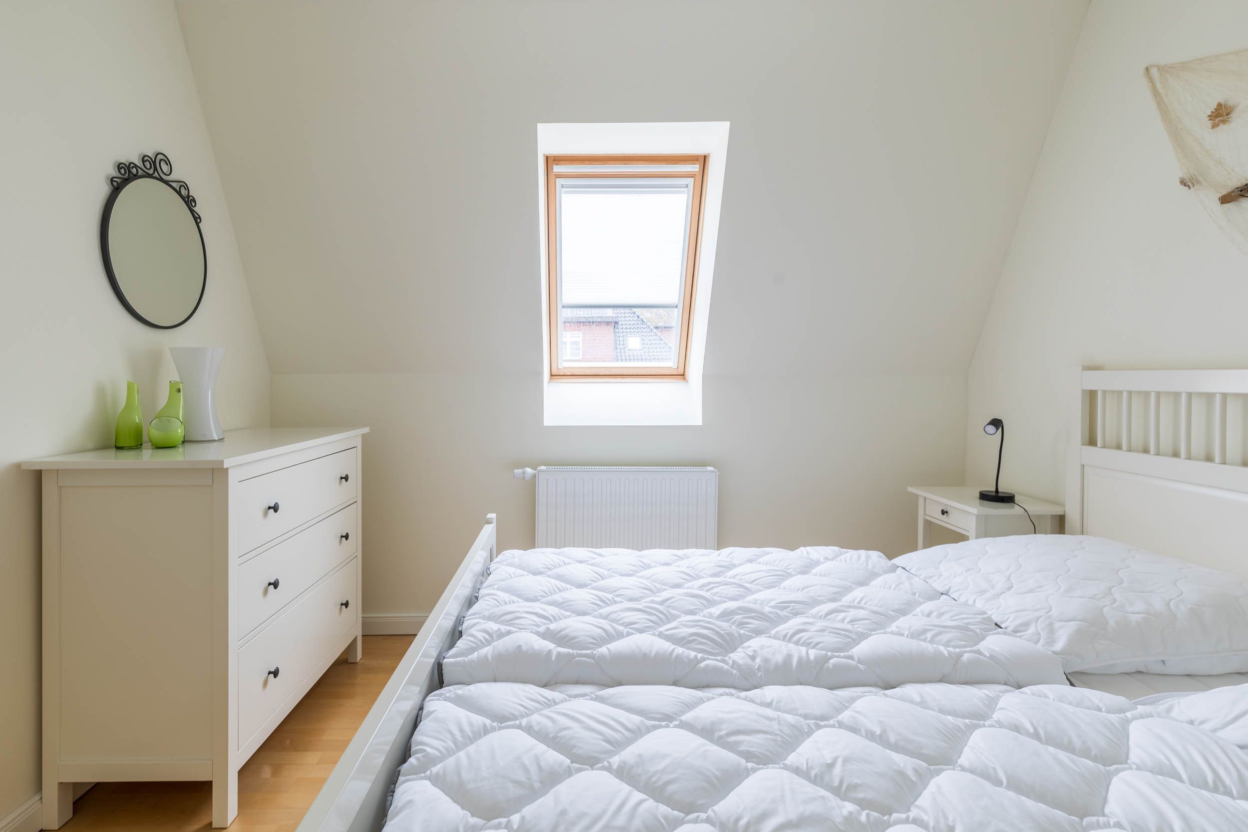 Ein weiteres Schlafzimmer, mit Doppelbett, ist in der zweiten Wohnebene, im DG eingerichtet. Auch hier gibt es mehrere Kommoden für Ihre Urlaubsgarderobe.