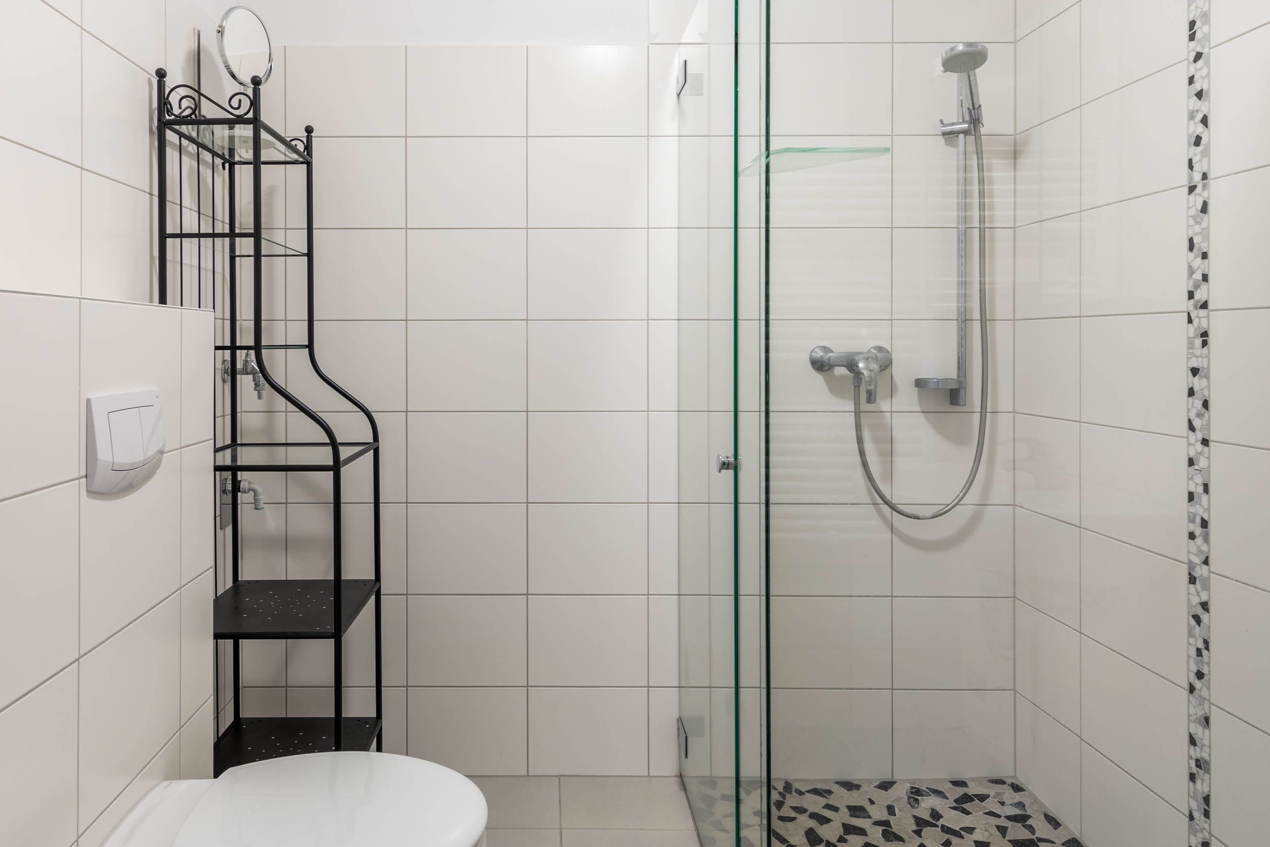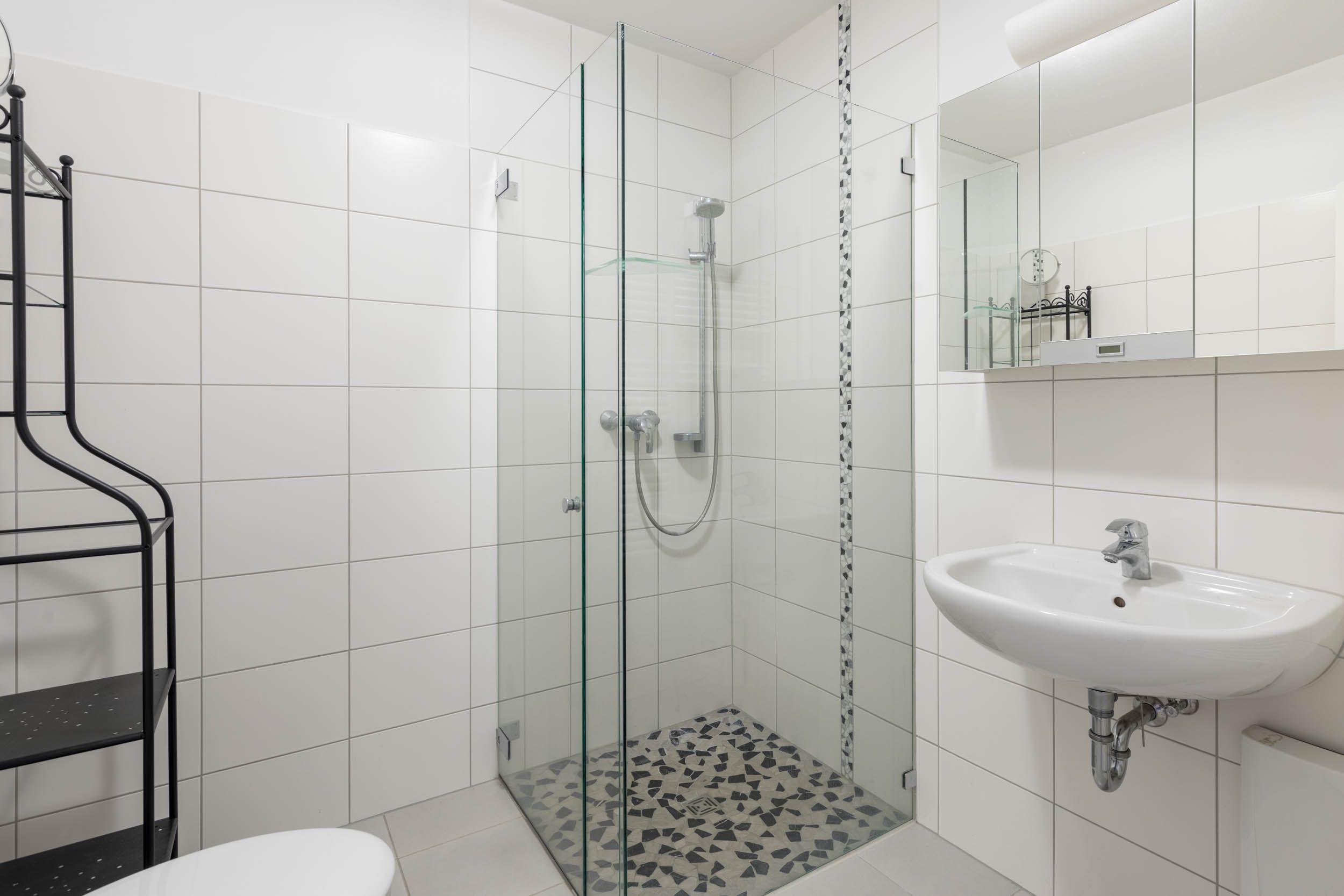 Das Badezimmer auf selbiger Ebene beinhaltet ein modernes Duschbad, ein WC und einen Handtuchtrockner.