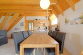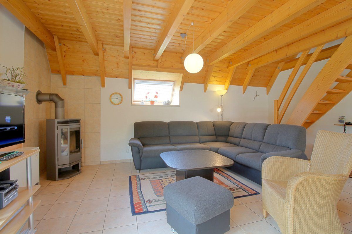 Der offene Wohn-, Ess- und Küchenbereich mit Kaminofen für die kältere Jahreszeit ist komplett gefliest. Die Küche ist mit allem ausgestattet, was Sie für das zubereiten einer leckeren Mahlzeit brauchen mit Pött und Pann. Von hier aus geht es auf die sonnige Terrasse mit Gartenmöbeln.