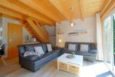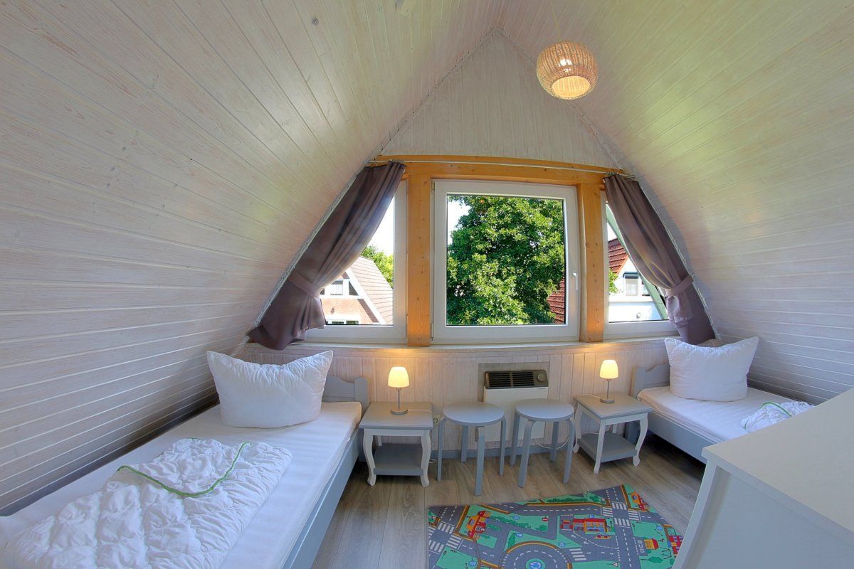 Im Obergeschoss befinden sich die beiden Schlafräume. Das Elternschlafzimmer hat ein Doppelbett, Kleiderschrank und Flachbild-TV. Das Kinderschlafzimmer hat zwei getrennt stehenden Betten. Für kleinere Kinder kann das vorhandene Zustellbett aufgestellt werden.