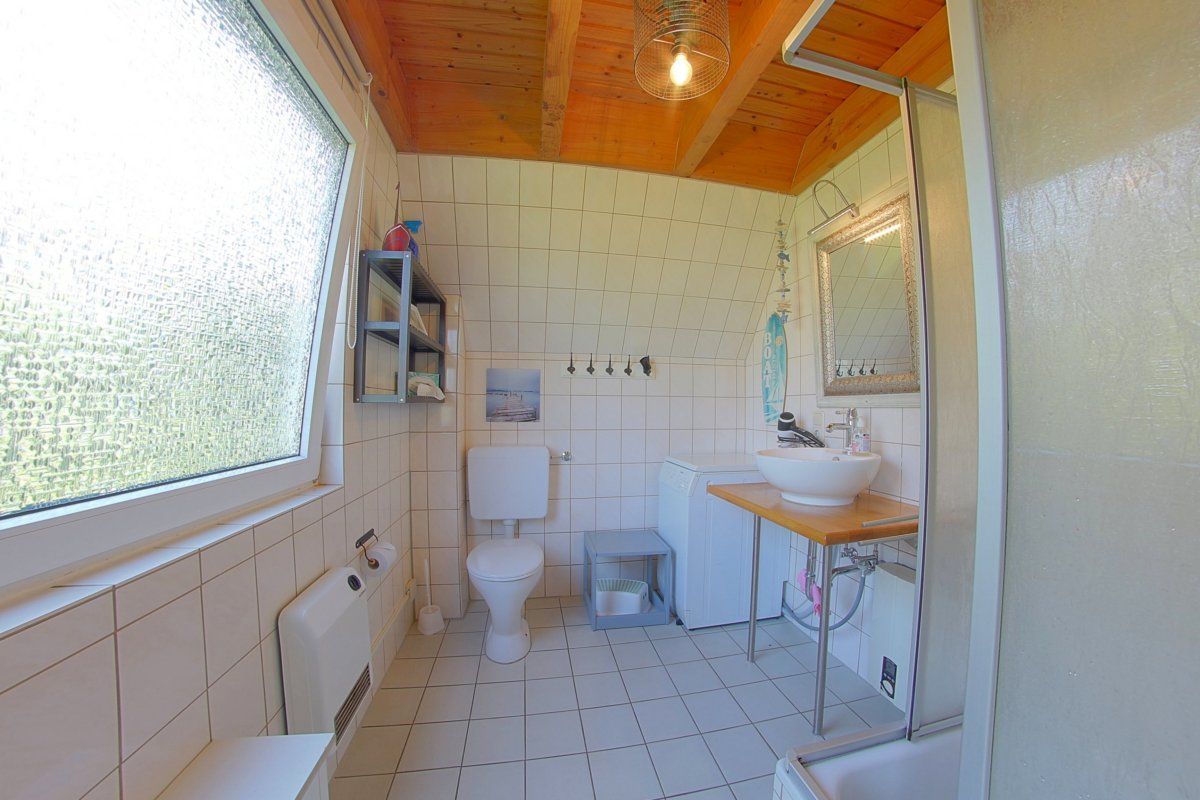 Im Erdgeschoss finden Sie ein gemütliches Wohn-Esszimmer mit einer komplett ausgestatteten, offenen Küche mit Geschirrspüler, ein Duschbad mit WC und Waschmaschine sowie einen Abstellräumen. Den zweiten Abstellraum erreichen Sie von außen über die Terrasse.