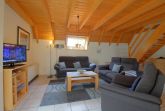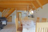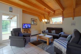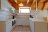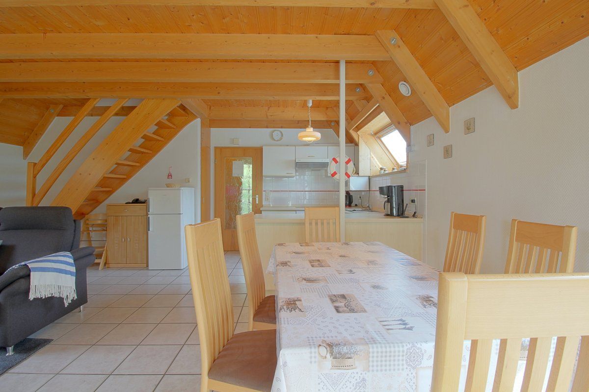 Im komplett gefliesten Erdgeschoss gibt es den offenen Wohn-, Küchen und Essbereich mit bequemen Sitzmöbeln, Flachbild TV und Küche mit Backofen, Mikrowelle, Geschirrspüler und Pött und Pann.
