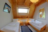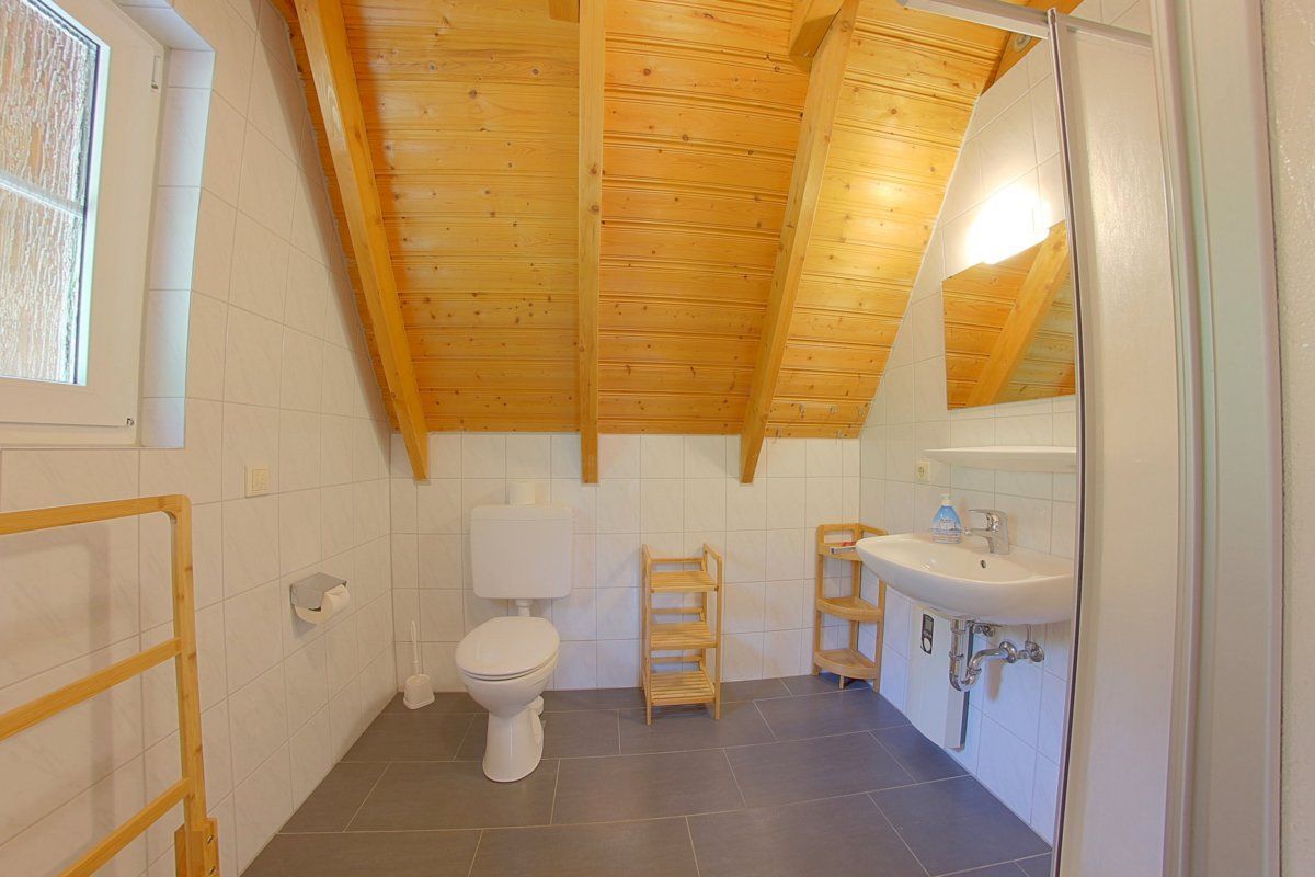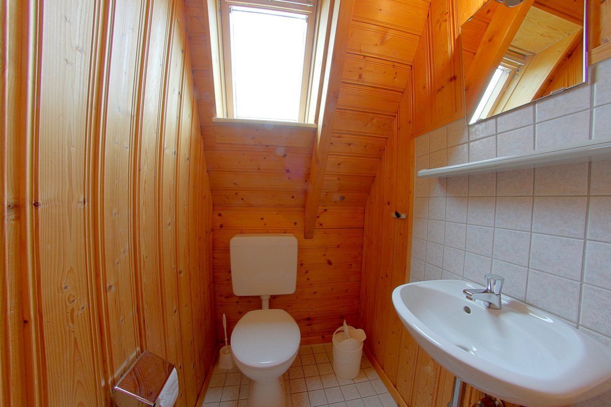 Im oberen Bereich befinden sich das Elternschlafzimmer mit Doppelbett, sowie ein weiteres Schlafzimmer mit Einzelbetten. Schlafzimmer mit Laminatböden. Ein Babyreisebett für die ganz kleinen Gäste und ein Hochstuhl stehen im Haus bereit. Ein WC befindet sich ebenfalls oben.