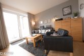 Vom Wohnbereich haben Sie den direkten Zugang zum windgeschützten Südbalkon, von dem man einen herrlichen Blick auf den Deich, das Leuchtfeuer und die an eine Welle erinnernde neue Kirche hat - ideal zum Lesen oder Seele baumeln lassen.