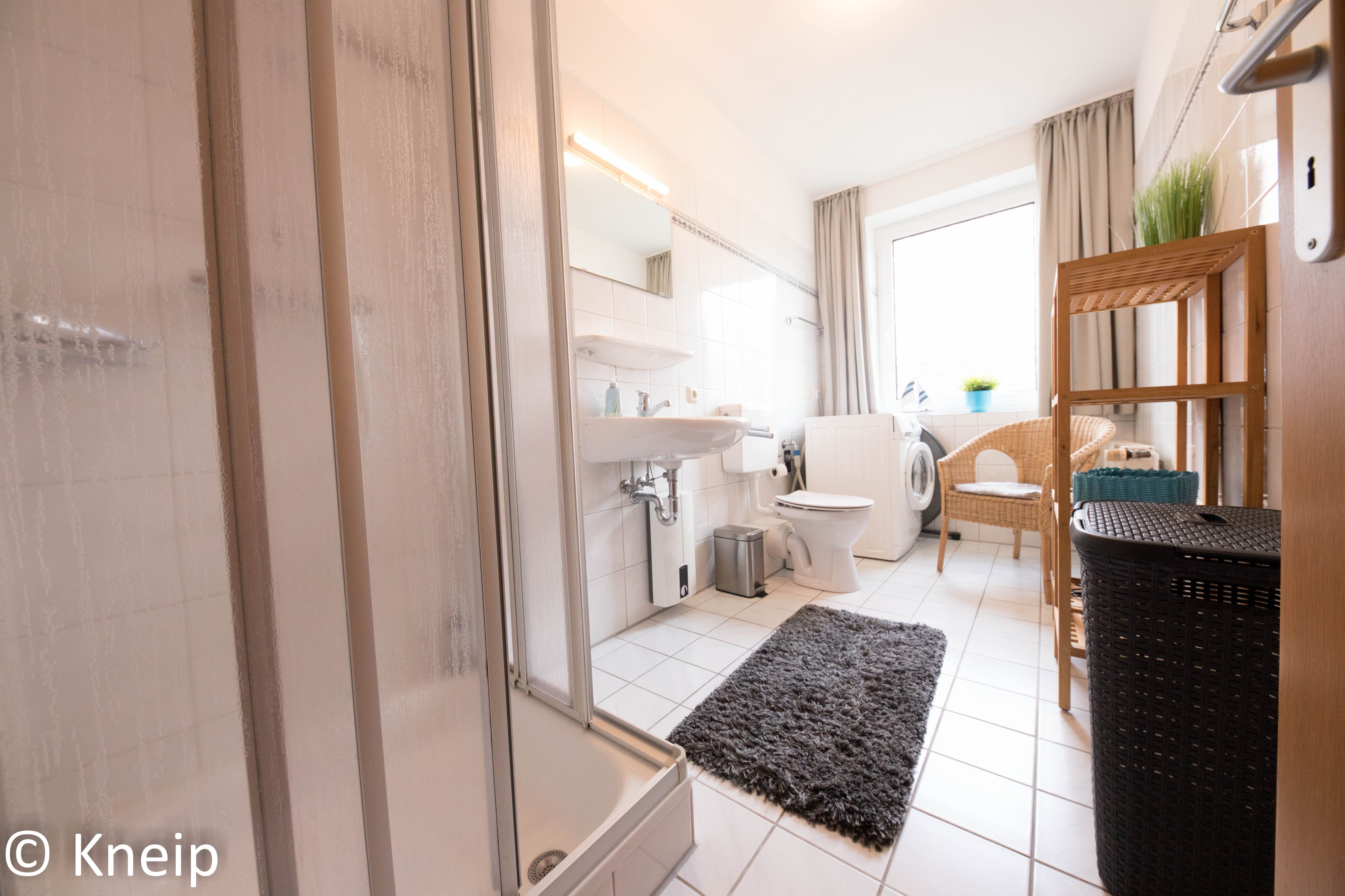 Das Tageslichtbadezimmer verfügt über eine Dusche und ein WC sowie eine Waschmaschine. Neben umfangreichem Informationsmaterial über Umgebung und Ausflugsmöglichkeiten sind Gesellschaftsspiele, Bücher und DVDs in der Ferienwohnung zahlreich vorhanden; WLAN ist kostenfrei. Ein Kinderreisebett mit zusätzlicher Matratze, Bettdecke und Kissen, eine Kinderbettsicherung und zwei Kinderhochstühle gehören auch zum Inventar.