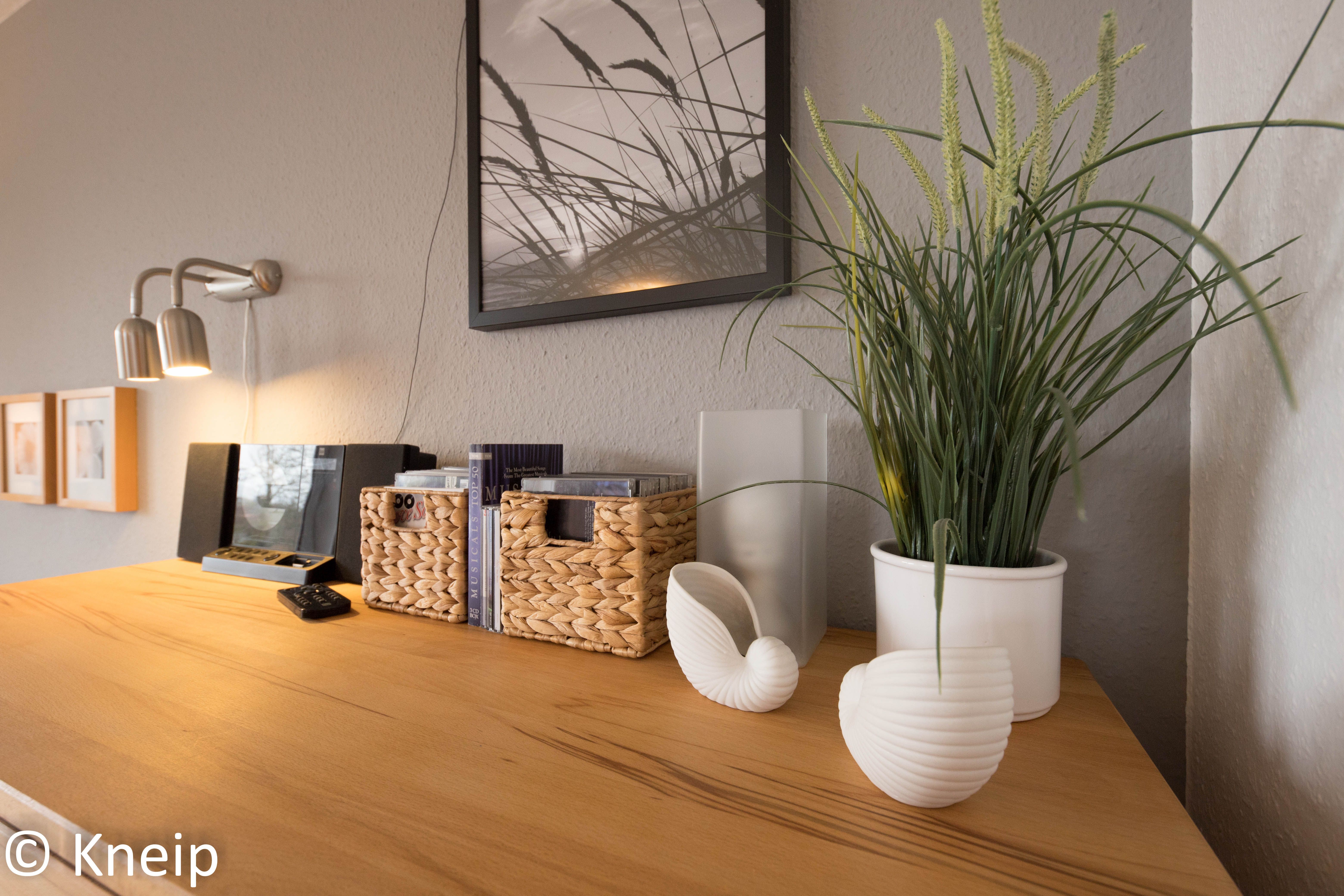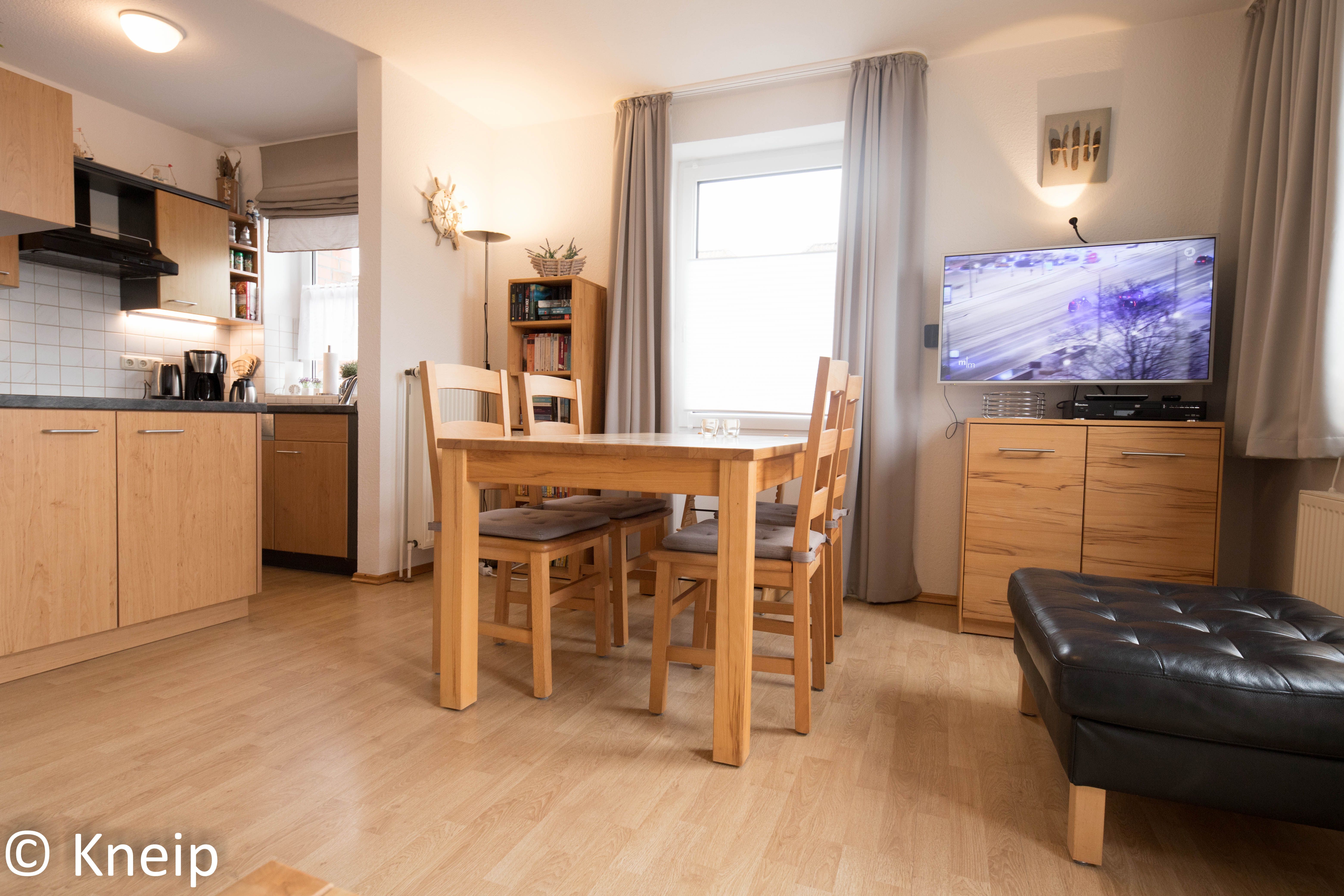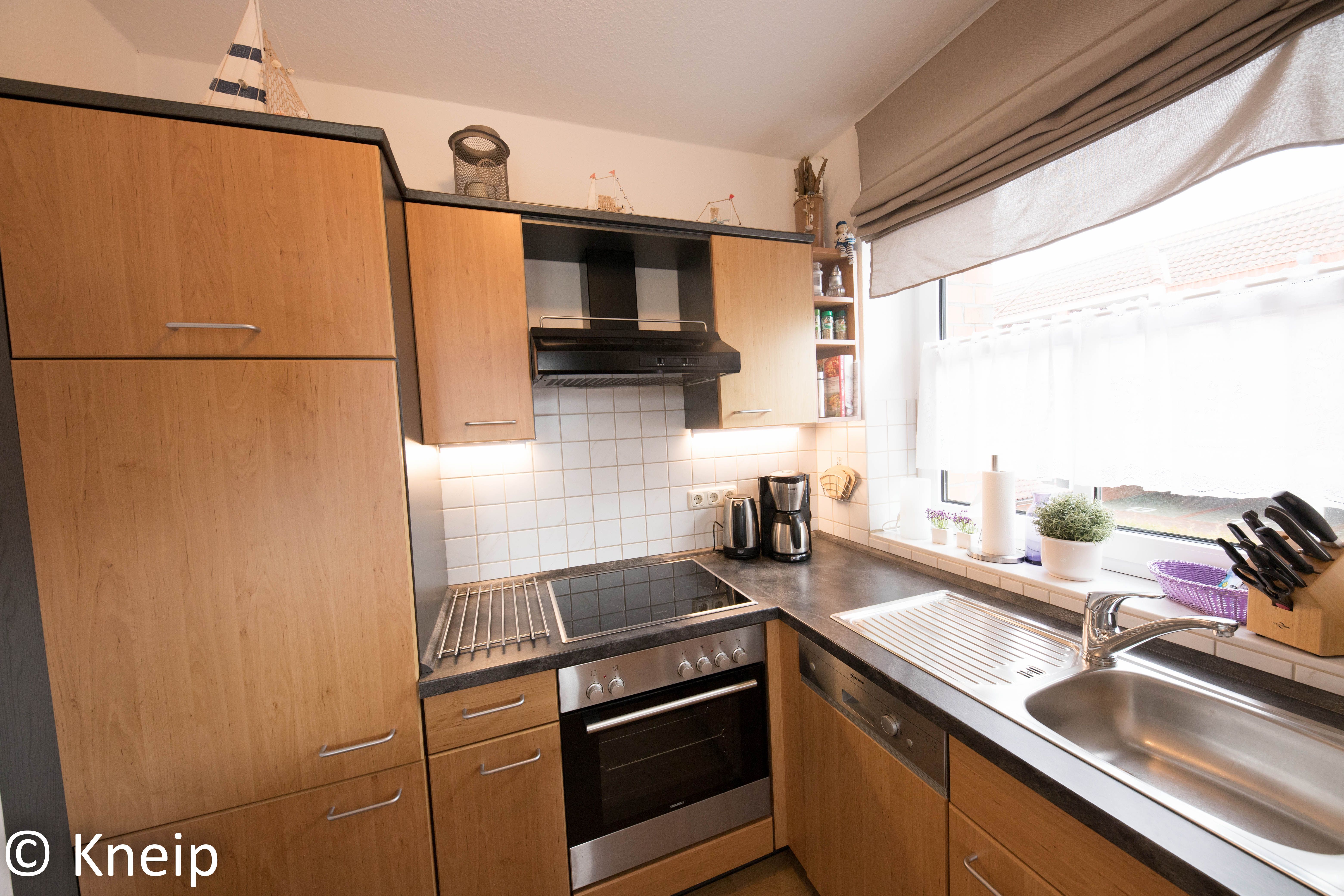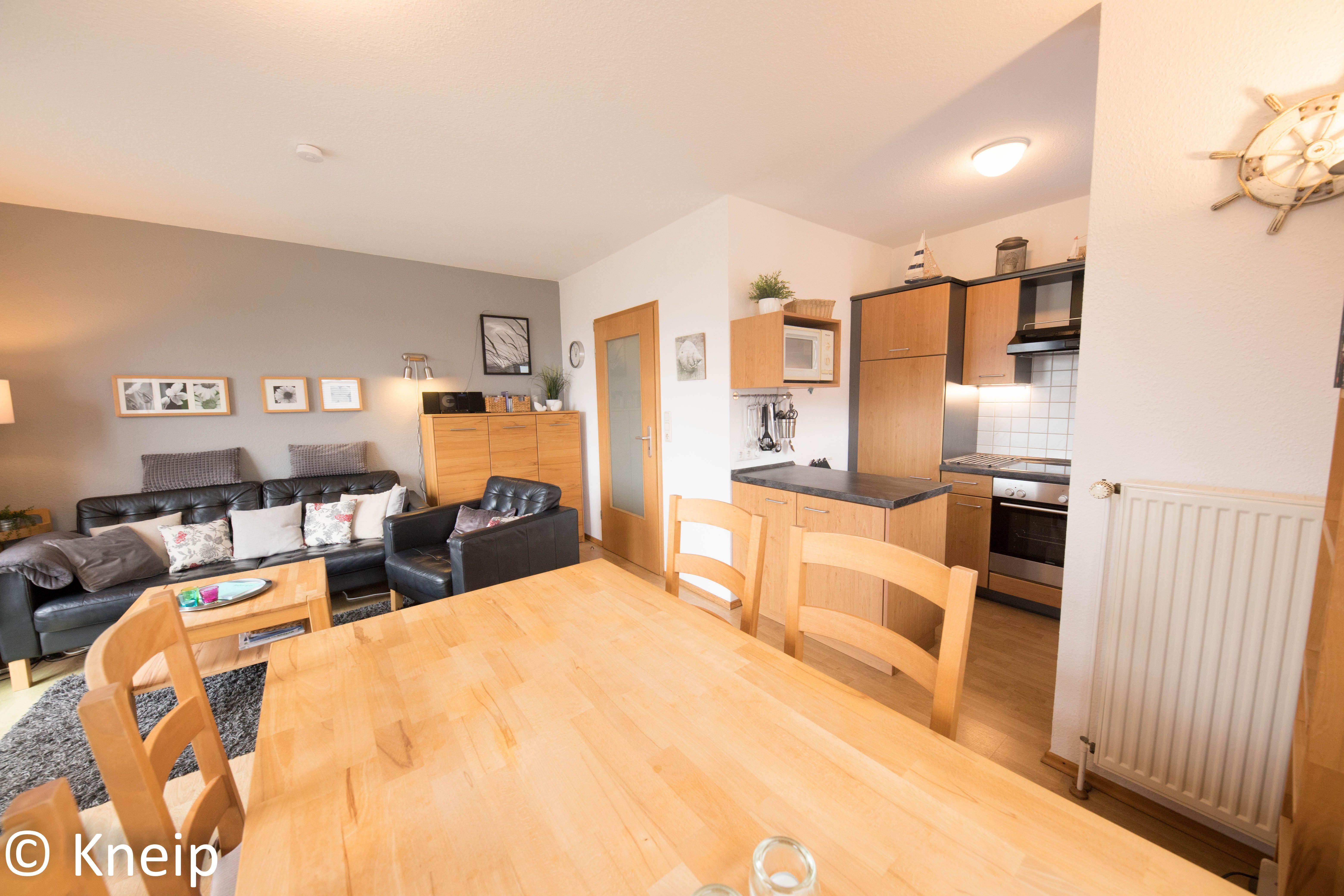 Den Gästen stehen zwei Schlafzimmern für insgesamt 4 Personen zur Verfügung. Das eine der Schlafzimmer verfügt über ein Doppelbett (2 x 100x200), das andere Schlafzimmer über zwei Einzelbetten. Der Wohnbereich mit gemütlicher Essecke, Smart TV und Stereoanlage wird ergänzt durch eine sehr gut ausgestattete offene Küche mit Kühlschrank inklusive Gefrierfach, einem Backofen mit 4 Kochfelder-Ceranfeld, Mikrowelle und Geschirrspüler sowie Kaffeemaschine, Toaster und Wasserkocher.