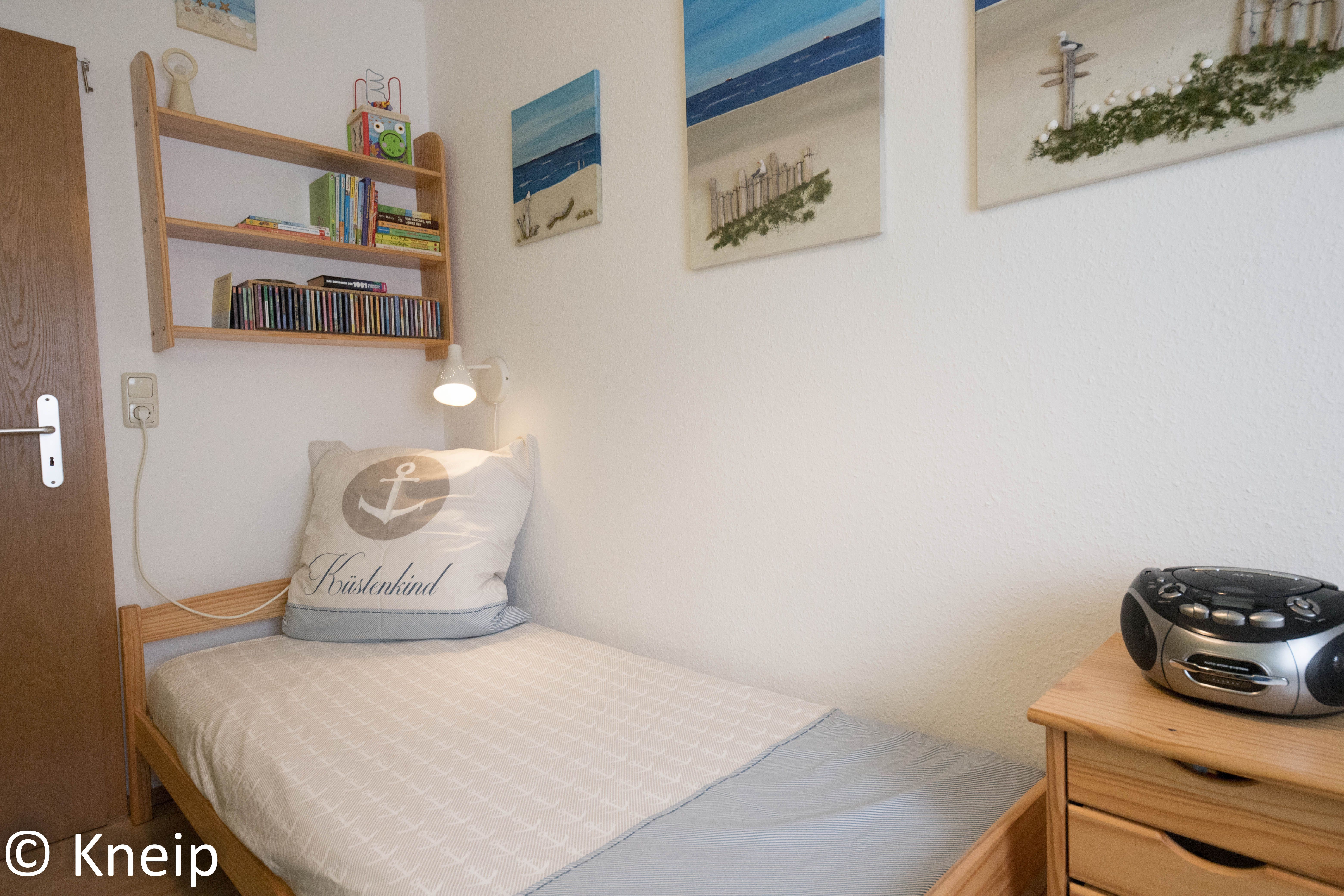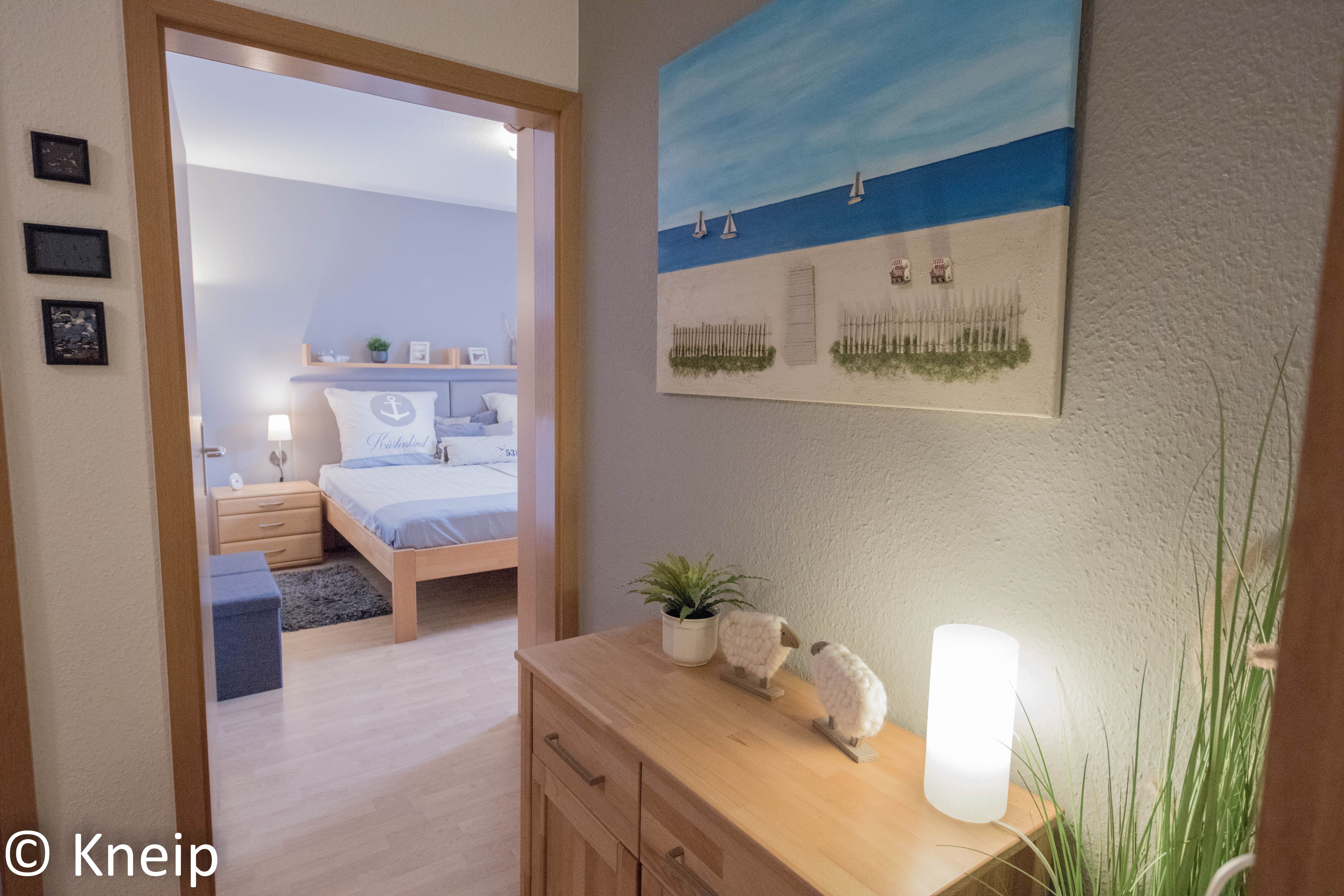 Vom Wohnbereich haben Sie den direkten Zugang zum windgeschützten Südbalkon, von dem man einen herrlichen Blick auf den Deich, das Leuchtfeuer und die an eine Welle erinnernde neue Kirche hat - ideal zum Lesen oder Seele baumeln lassen. Das Tageslichtbadezimmer verfügt über eine Dusche und ein WC sowie eine Waschmaschine.