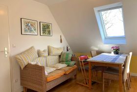 Die Ferienwohnung im Obergeschoss hat ein Badezimmer mit Dusche, Badewanne und WC, ein Schlafzimmer mit Doppelbett, ein Kinderzimmer mit zwei Einzelbetten sowie eine gemütliche Wohnküche und bietet Platz für zwei Erwachsene und zwei Kinder. Es sind Spiele und Bücher vorhanden. Die Wohnung wurde 2020 renoviert und entspricht modernen Ansprüchen.