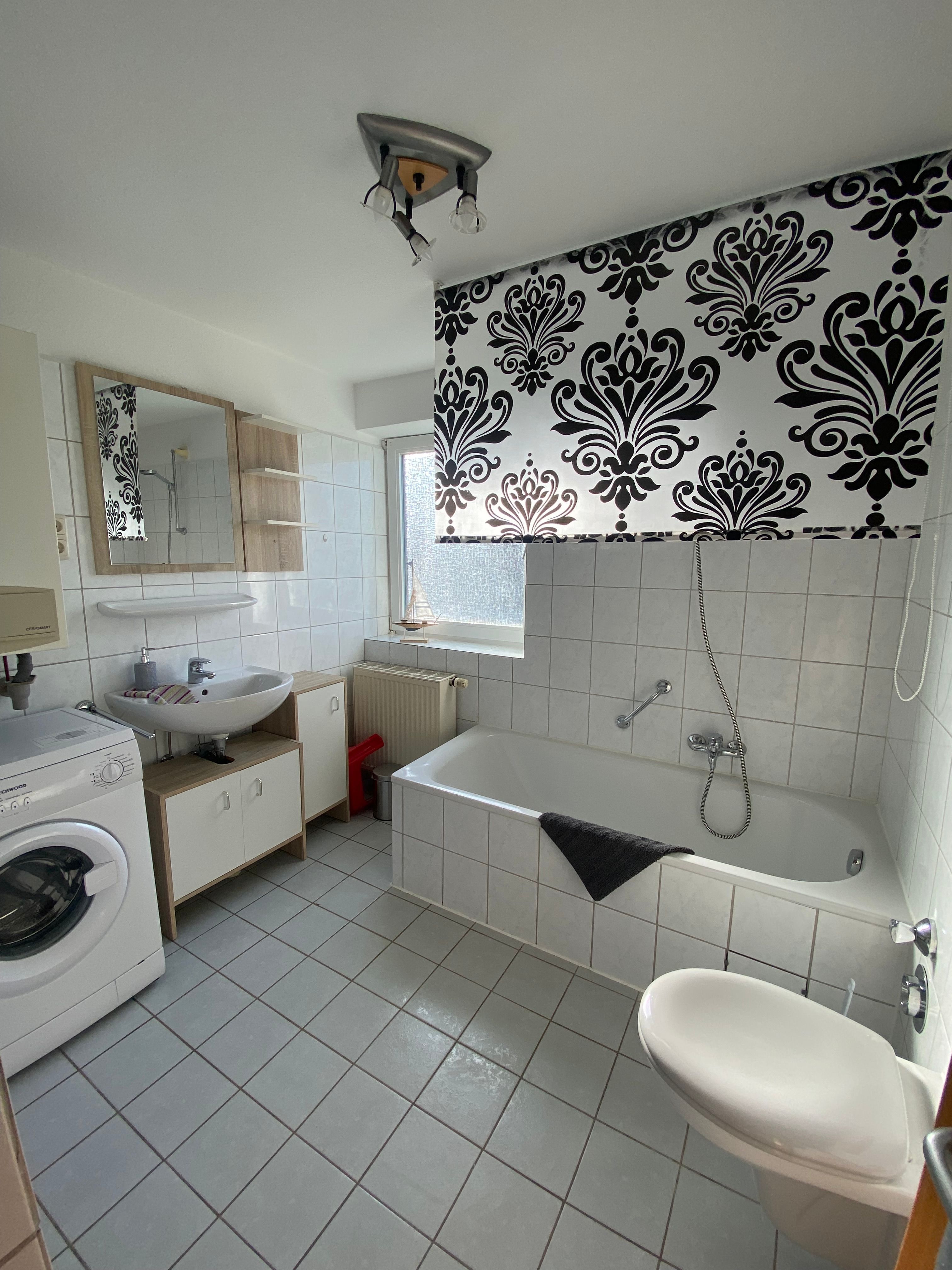 Das Tageslichtbad ist im modernen Stil renoviert worden und bietet Ihnen eine Dusche ohne Barrieren.