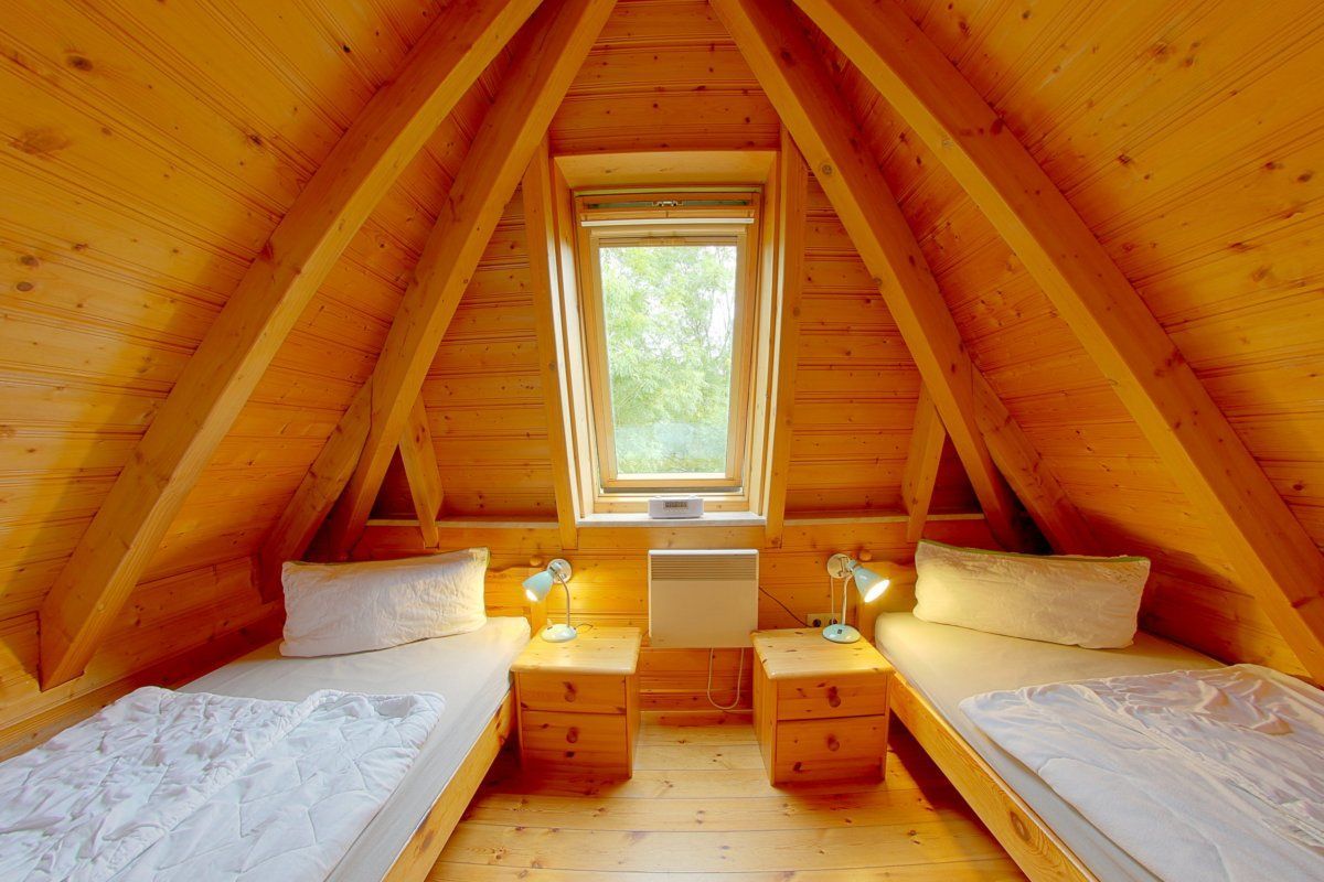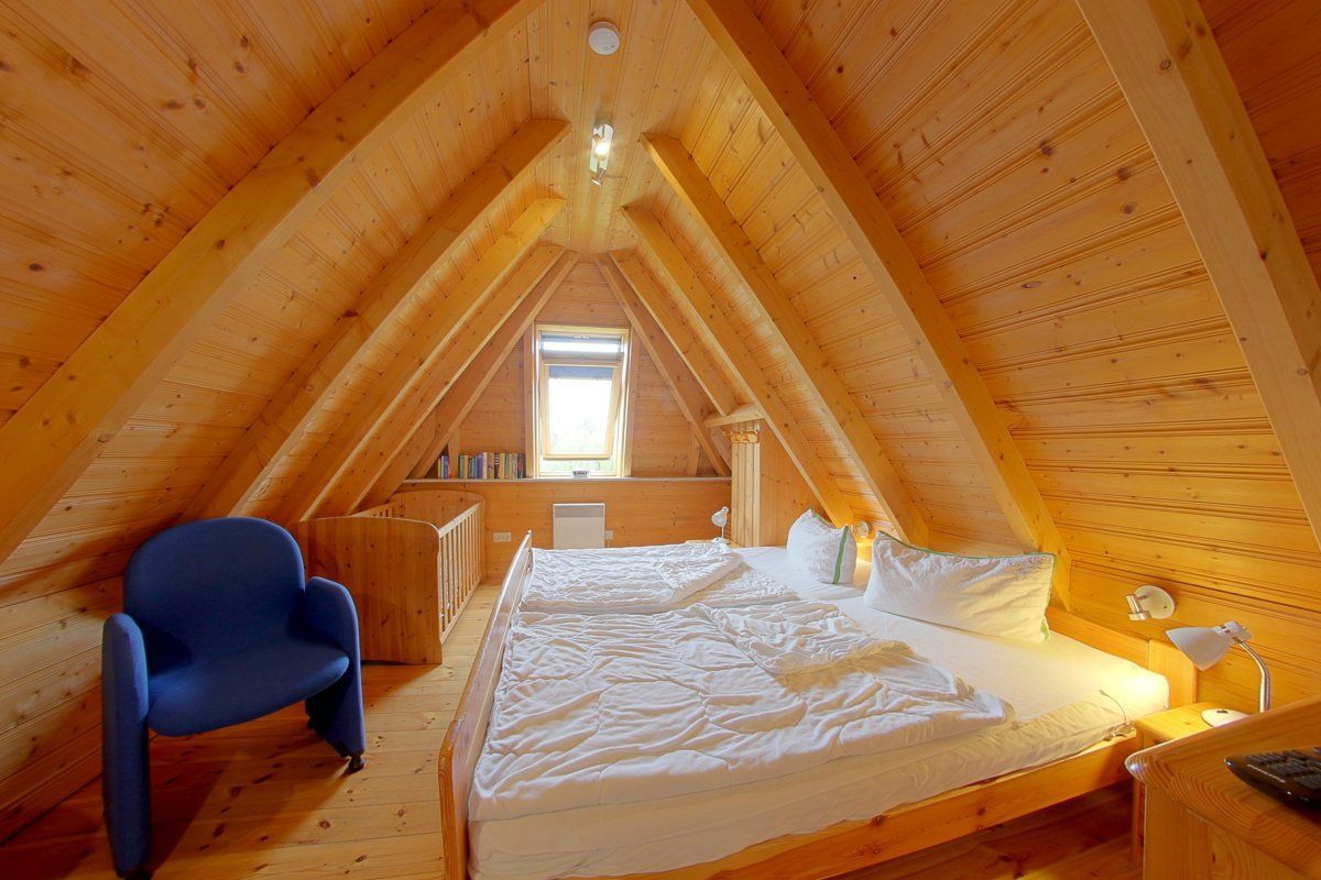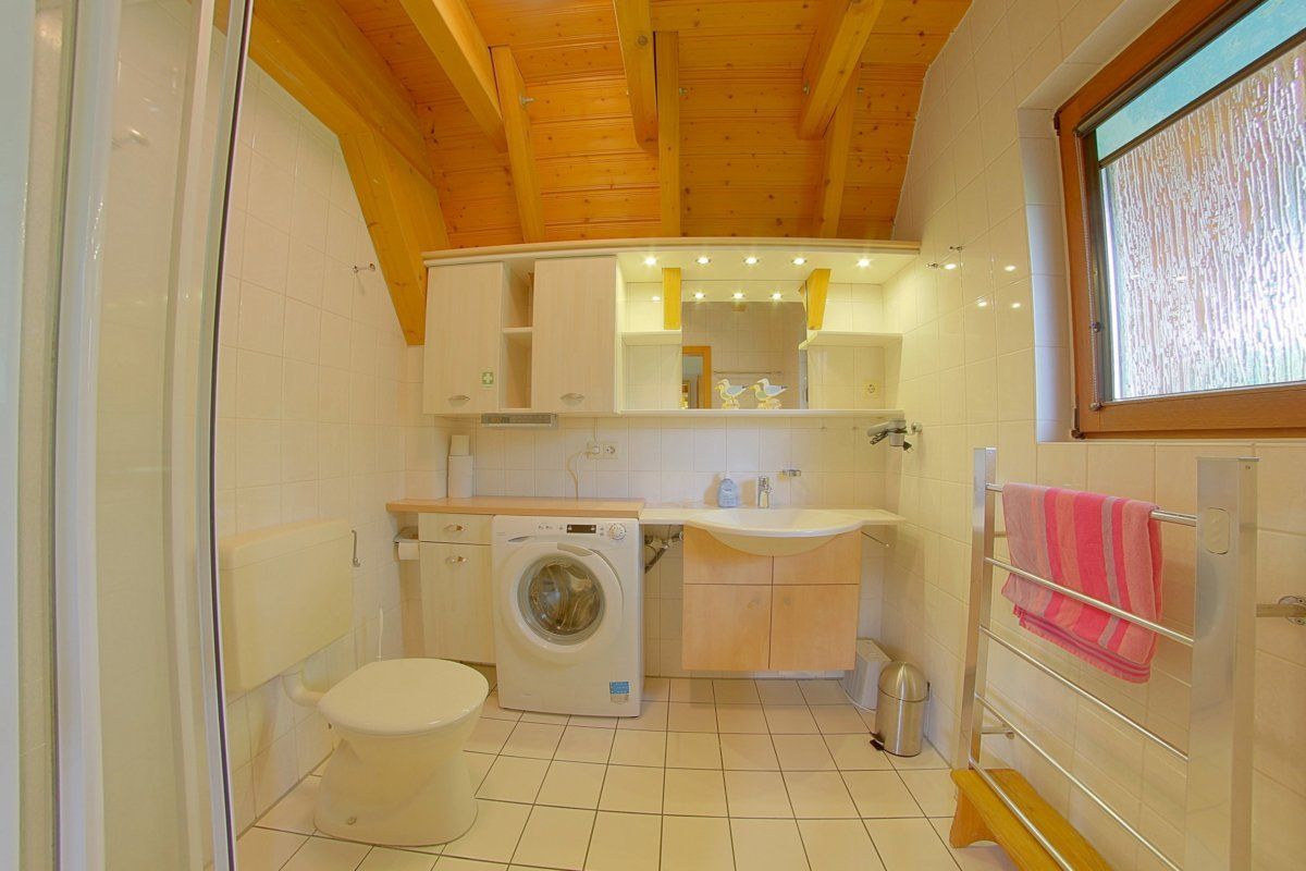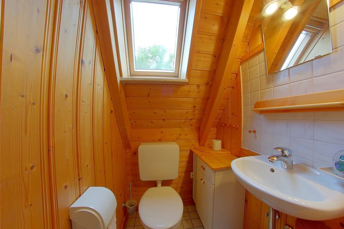 Im Obergeschoss sind die beiden Schlafzimmer mit 4 Betten sowie Kinderzustellbett. Außerdem ein 2. WC mit Waschbecken.