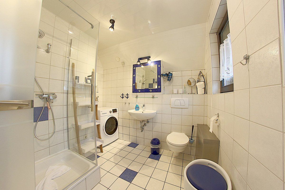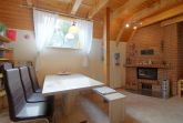 Im Erdgeschoss verfügt das Haus über einen offenen Wohn-, Ess- und Küchbereich mit Kaminofen und ein modernisiertes Duschbad mit Fenster und Waschmaschine.