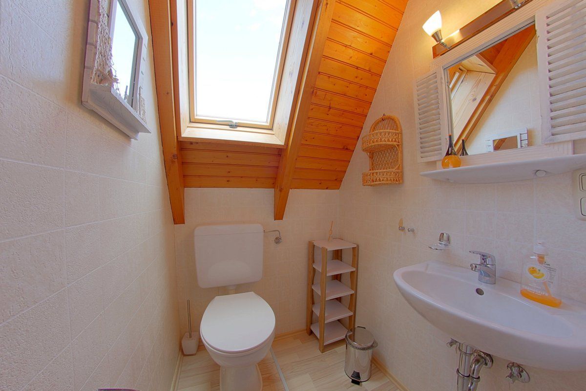 Im oberen Bereich finden Sie ein Schlafzimmer mit Doppelbett und TV, sowie ein Schlafzimmer mit 1 Einzelbett und einem französischen Bett. Babyreisebett und Hochstuhl finden Sie ebenfalls im Haus. Ein zusätzliches WC mit Waschbecken ebenfalls.