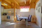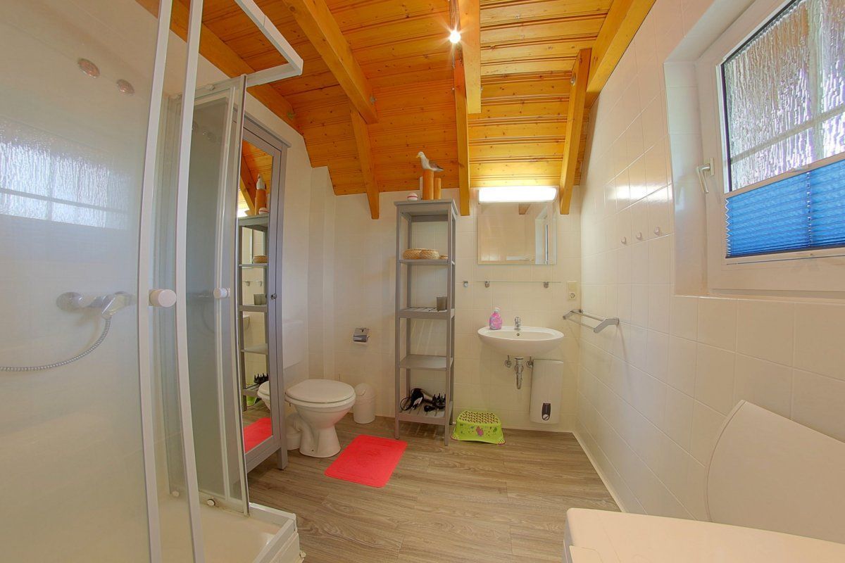 Im Erdgeschoss befindet sich das Wohnzimer mit Kaminofen, die offene Küche mit Geschirrspüler und Kaffeemaschienen (Filter, Senseo und Dolce Gusto), eine Essecke und das Badezimmer mit Dusche, WC und Waschmaschine.