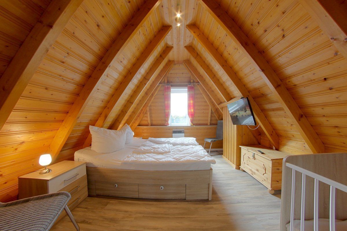 Im Obergeschoss befinden sich die zwei Schlafzimmer. Das Elternschlafzimmer mit Doppelbett, Babybett, Wickeltisch, Sitzgelegenheit und einem zweiten Fernseher. Im anderen Zimmer stehen zwei Einzelbetten und ein kleines CD-Radio.