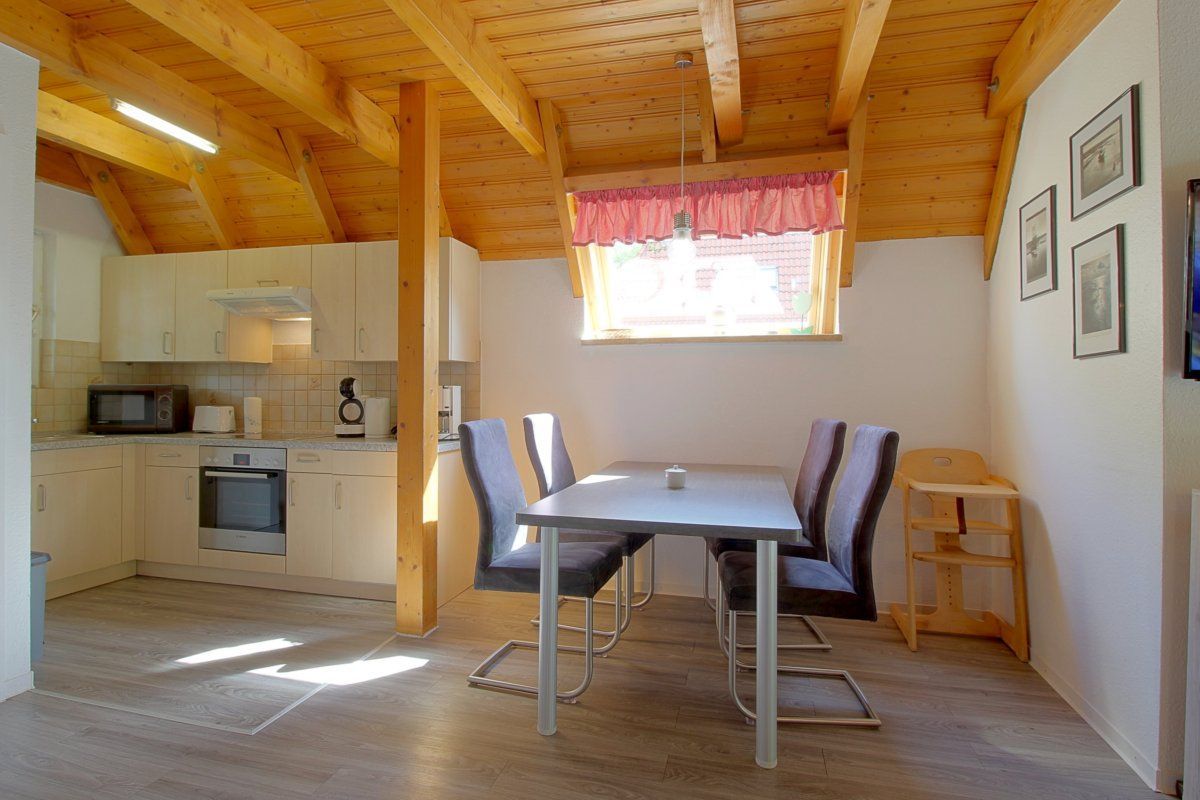 Die Küche beinhaltet einen Backofen, Ceran-Herd, Geschirrspüler, Kühlschrank mit Gefrierfach, Toaster, Eierkocher, Wasserkocher, Mikrowelle und alles an Geschirr, Töpfen, Gläsern und Besteck.