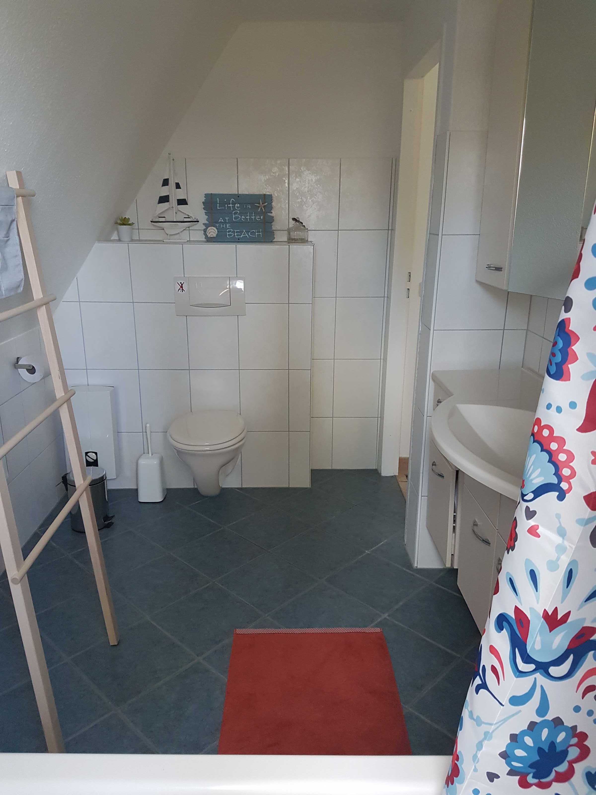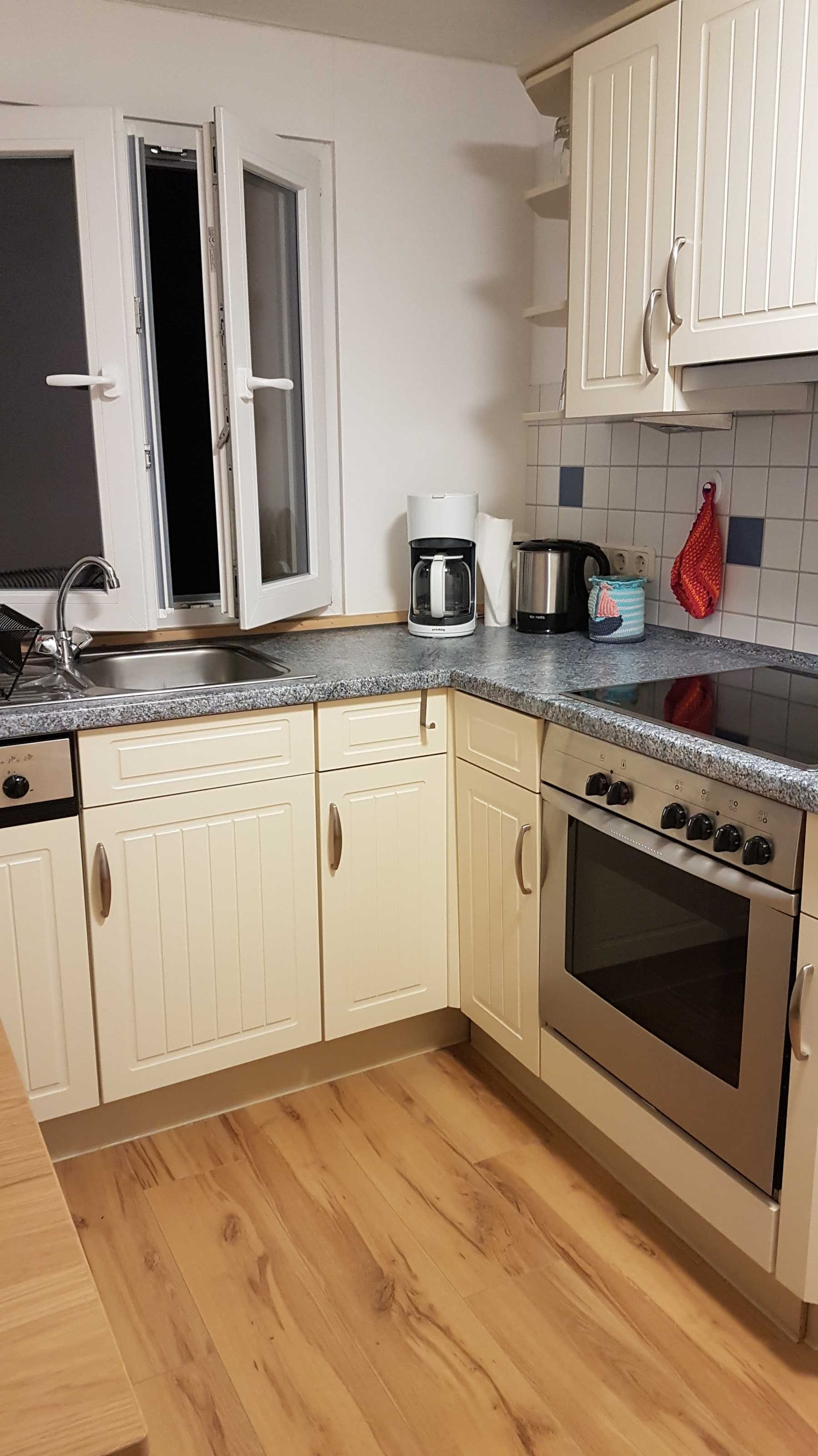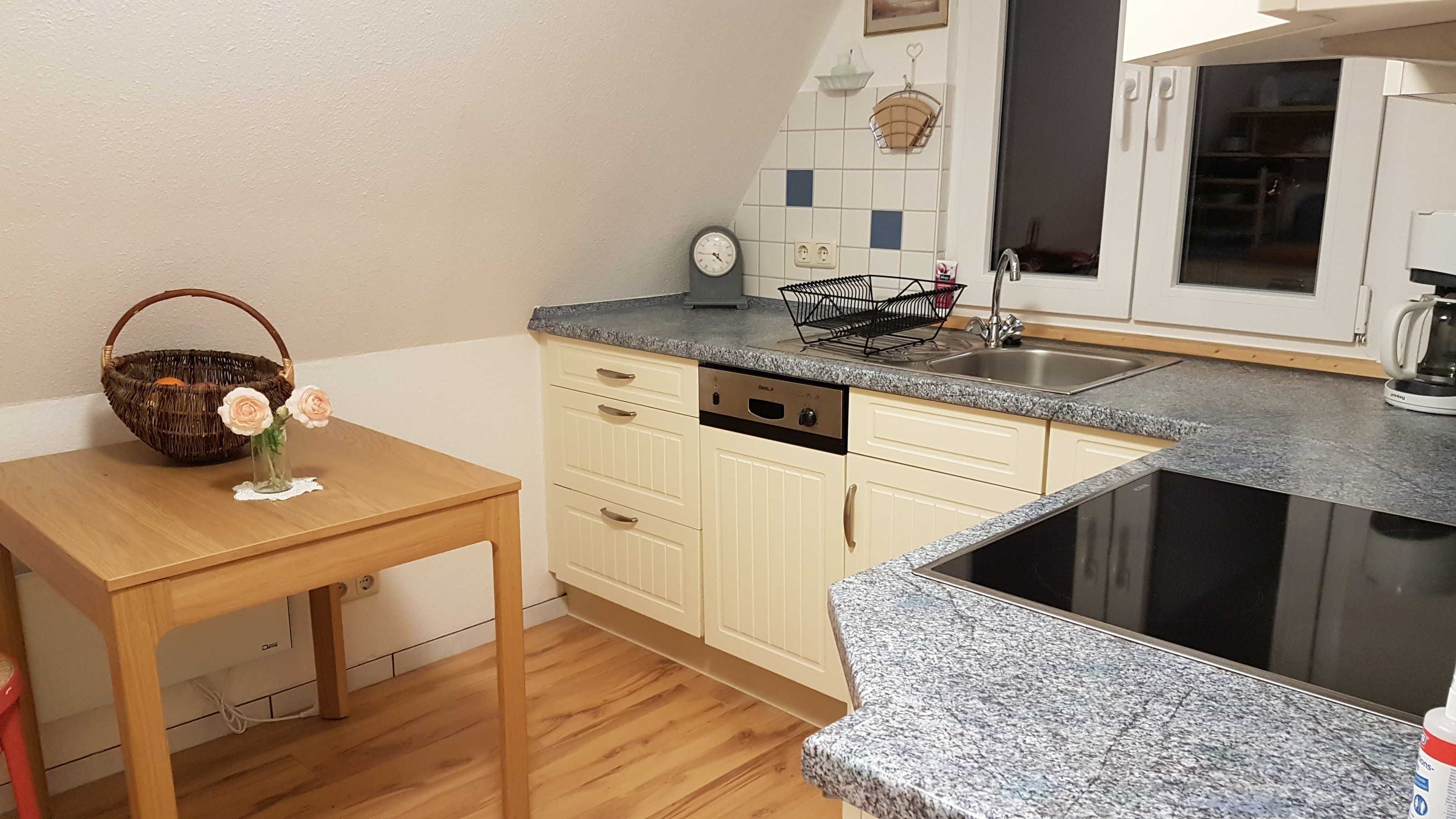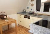 Im Erdgeschoss befindet sich der sonnige Wohn- Essbereich mit SAT-TV, die gut ausgestattete Einbauküche mit Geschirrspüler, Backofen und einer Kühl-Gefrierkombination sowie das Badezimmer mit Wannenbad. Über eine schmale Wendeltreppe gelangen Sie in das Obergeschoss. Dort befindet sich ein Schlafzimmer mit einem Doppelbett (160cm breit) und ein offener Schlafbereich ebenfalls mit einem Doppelbett (160cm breit).