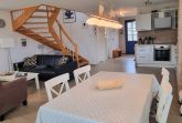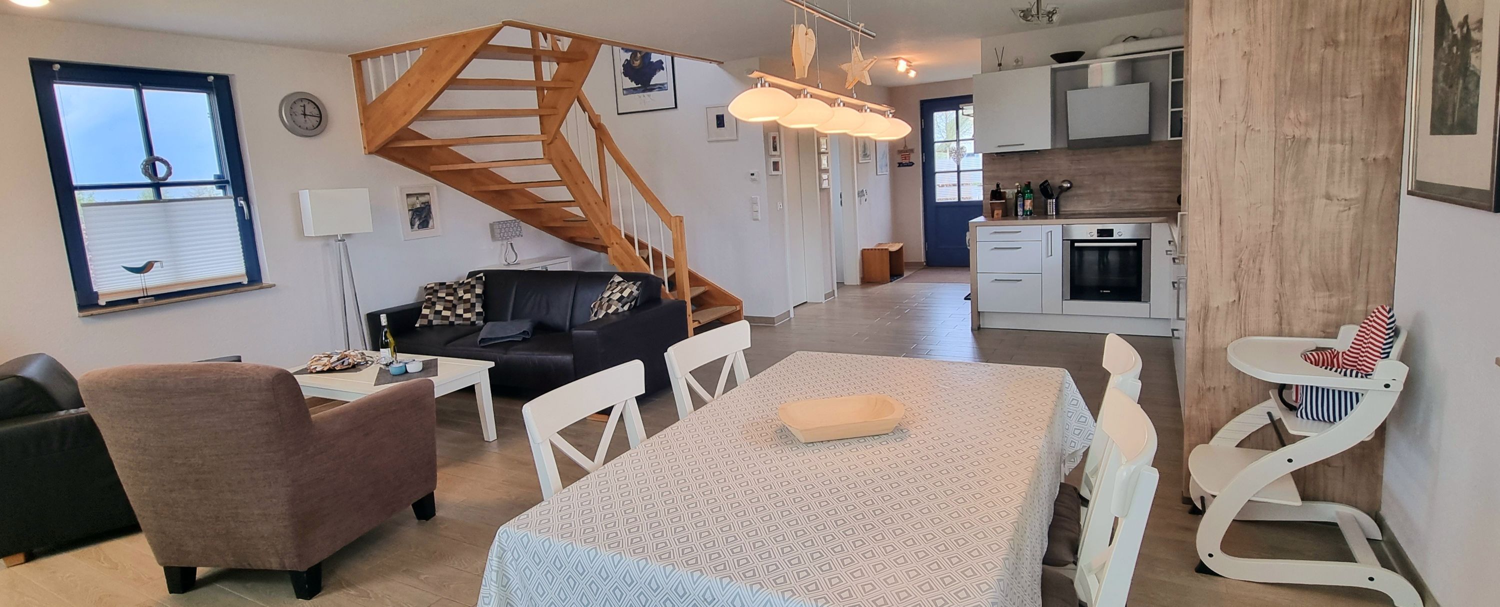 Das in 2014 errichtete Reetdachhaus mit einer Wohnfläche von 97 qm befindet sich in der neuen Ferienhaussiedlung De Poeler Drift in Zierow. Das mit Echtholzmöbeln, Sprossenfenstern und Fensterläden ausgestattete Feriendomizil lädt zu jeder Jahreszeit an die mecklenburgische Ostsee ein. Ob im schönen Sommer, denn der Strand ist nicht weit, zudem gibt es einen umlaufenden Garten, aber auch in der kälteren oder auch schmuddeligen Jahreszeit, denn sowohl eine Sauna als auch ein Kaminofen sind vorhanden. Es erwartet Sie ein komplett gefliestes, mit Fußbodenheizung ausgestattetes Reetdachhaus. Eine hochwertige Innenausstattung lässt keine Wünsche offen. Das Erdgeschoss empfängt Sie mit einem großen Wohn-/Essbereich mit offener Küche und bietet ausreichend Platz für die ganze Familie. Die integrierte Küche ist voll ausgestattet mit einem hochwertigen Backofen mit Induktionskochfeld, einem Kühlschrank mit Gefrierfach, einem Geschirrspüler, Kaffeemaschine, Toaster und Wasserkocher, aber auch ein Eierkocher und Mixer sind vorhanden. Eine Ledercouchgarnitur und Sessel laden zu einem gemütlichen Abend ein. Ein Flach-TV, Blue-Ray-Player und Bluetooth-Stereoanlage bieten Unterhaltung, zudem stehen einige Bücher, Reiseführer und Spiele zur Verfügung. Im Wohnbereich steht der Kaminofen, der wohlige Wärme in der kalten Jahreszeit schenkt. Kaminholz ist mitzubringen. Der Essbereich bietet Platz für 4 Personen, ein Kinderhochstuhl ist zusätzlich vorhanden. Weiterhin befinden sich im EG ein Tageslicht-Gäste-WC, eine Sauna mit Komfortdusche und ein Hauswirtschaftsraum mit Waschmaschine, Wäscheständer, Staubsauger, Bügeleisen, Bügelbrett und Putzutensilien.